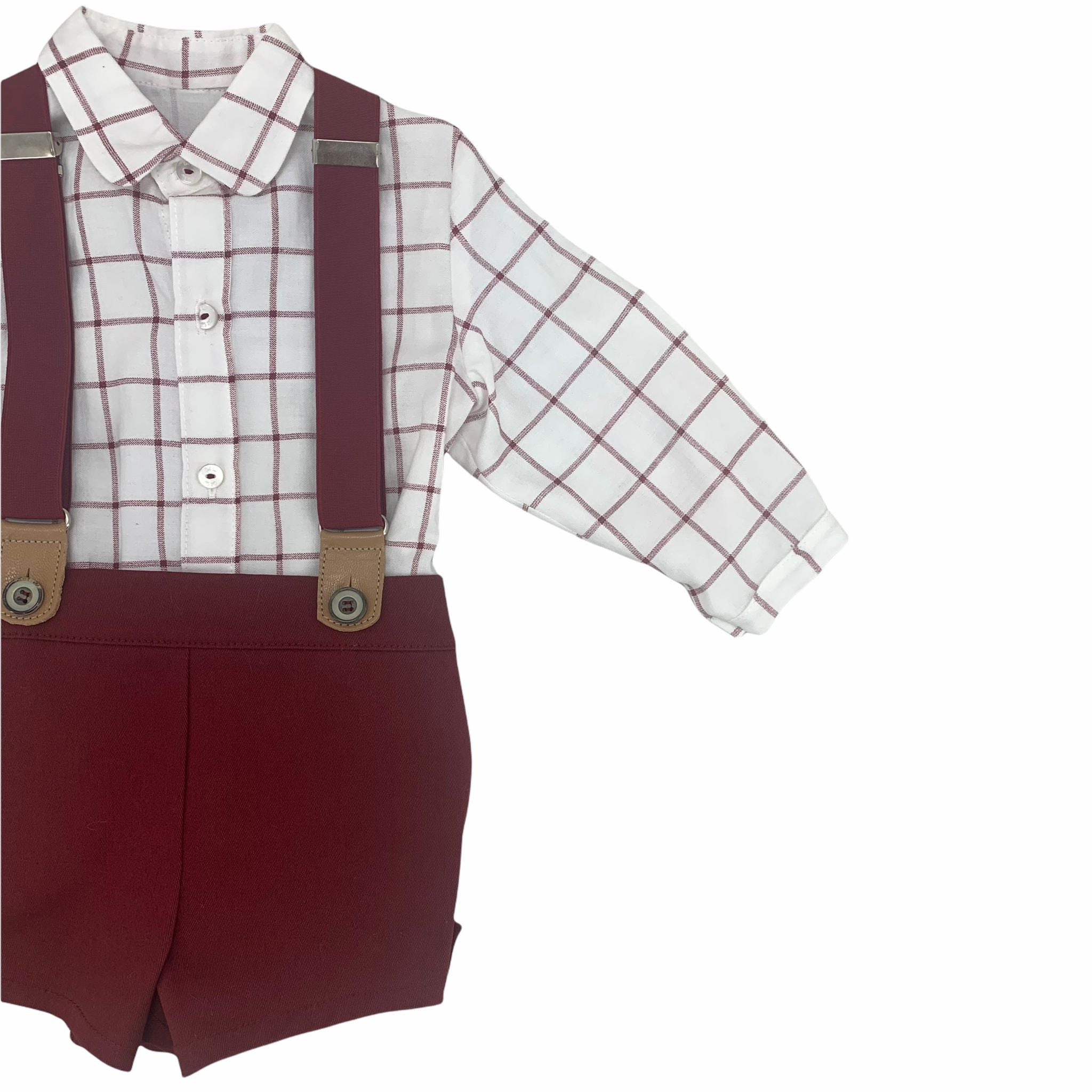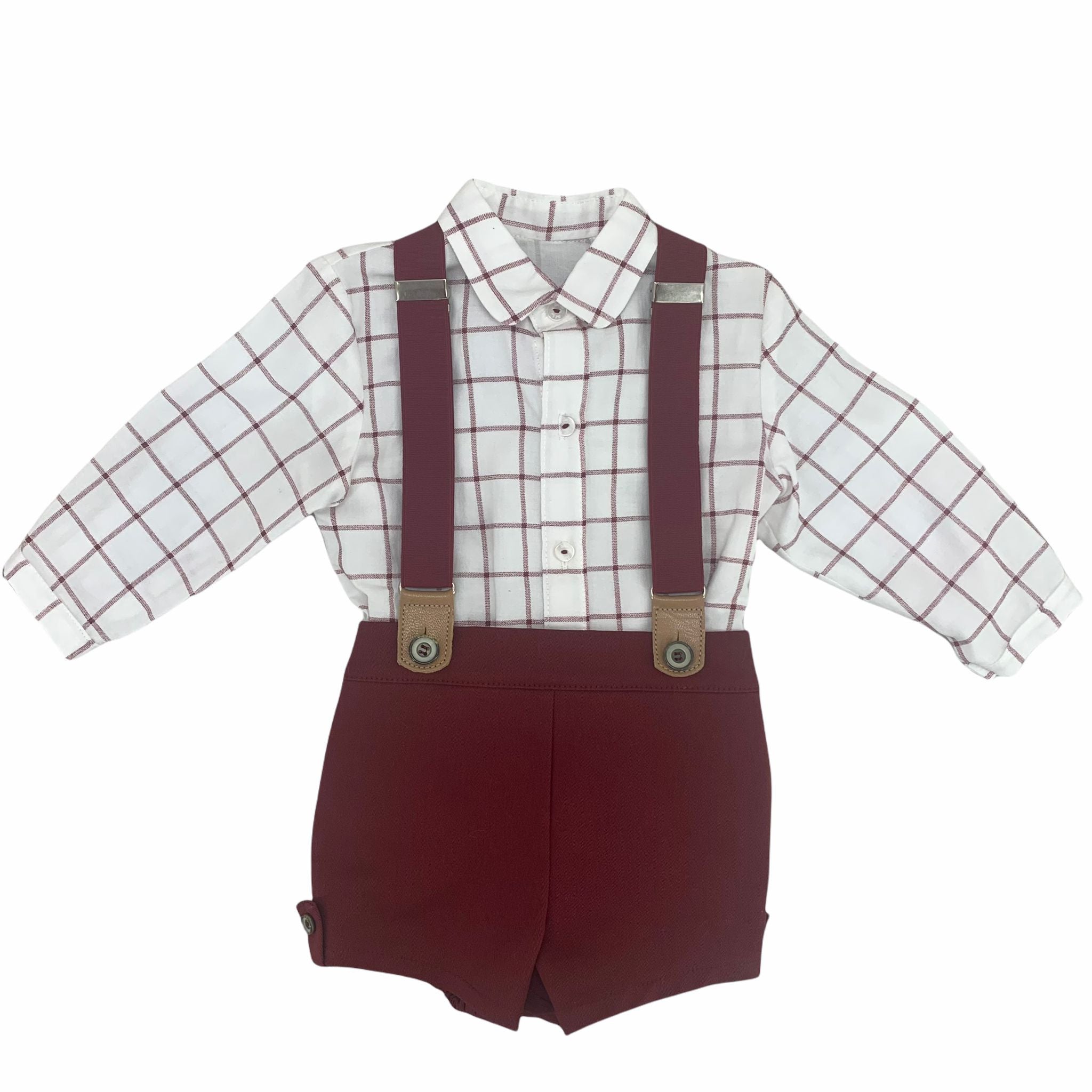 Completo con pantaloni salopette con bretelle ed elastico in vita e camicia a quadri con chiusura sul davanti.