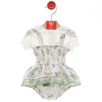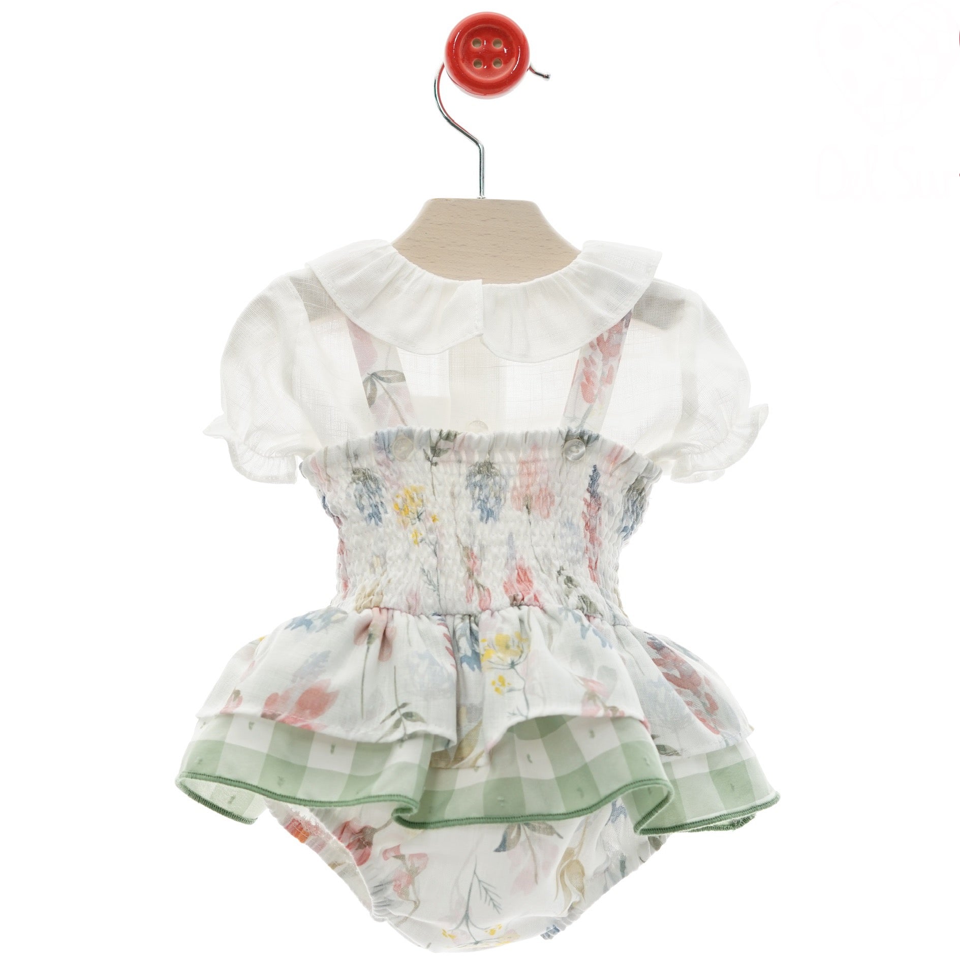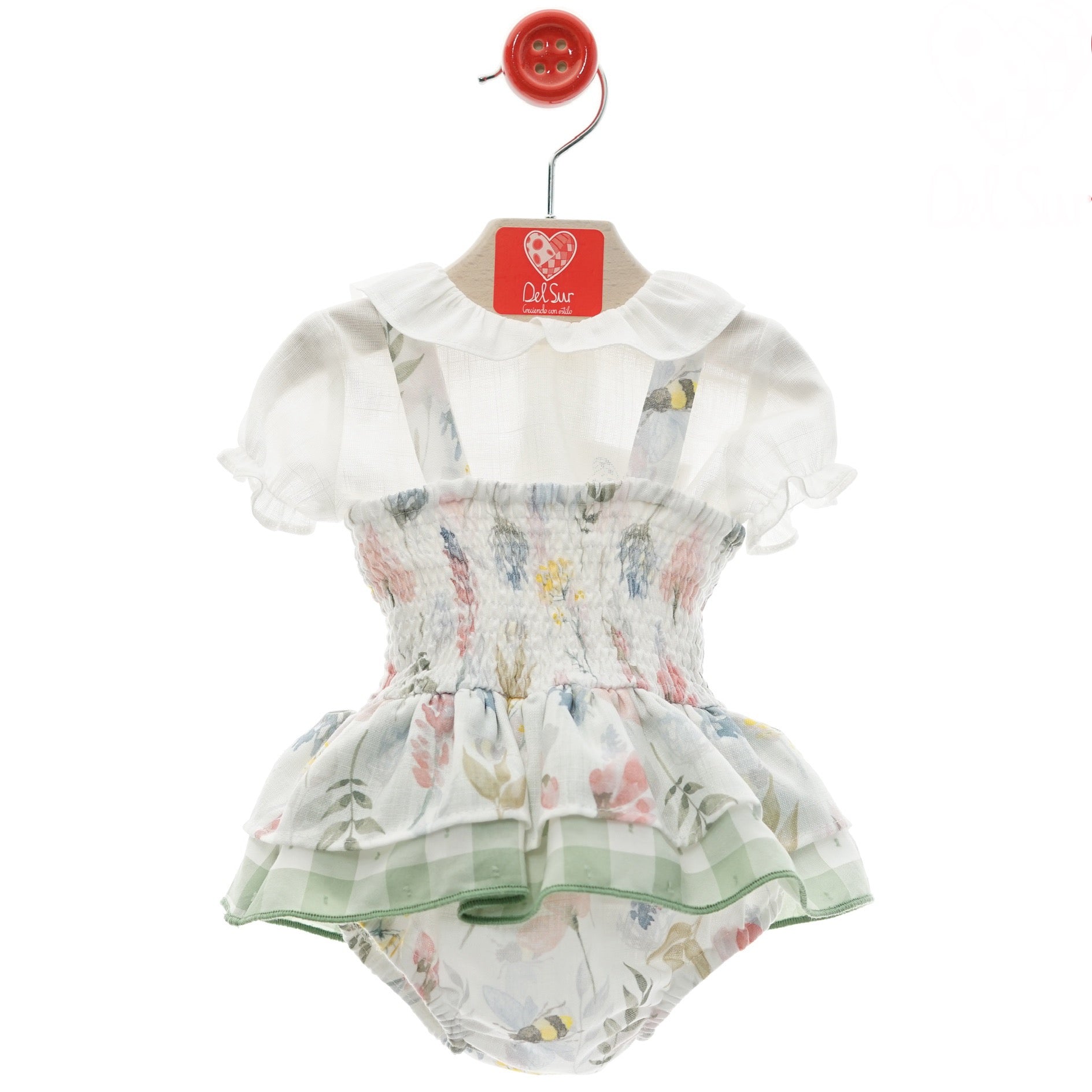 Il Completo Del Sur è elegante, casual e alla moda. La salopette stampata con balze e la camicia a mezze maniche con colletto a rouche sono perfette per rendere la neonata alla moda. Con questo completo, tuo figlio si distinguerà per il suo stile unico e originale.
