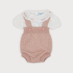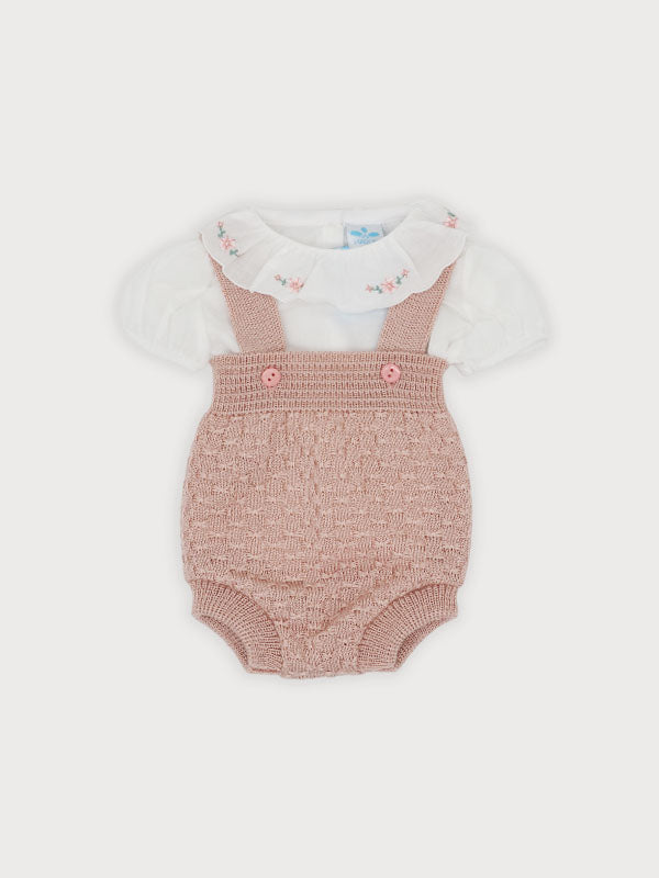 Completo per neonata con salopette in filo di cotone e camicia con colletto ricamato. Ideale per l'uscita clinica, questo elegante completo conferirà un tocco di stile alla tua piccola.
