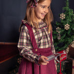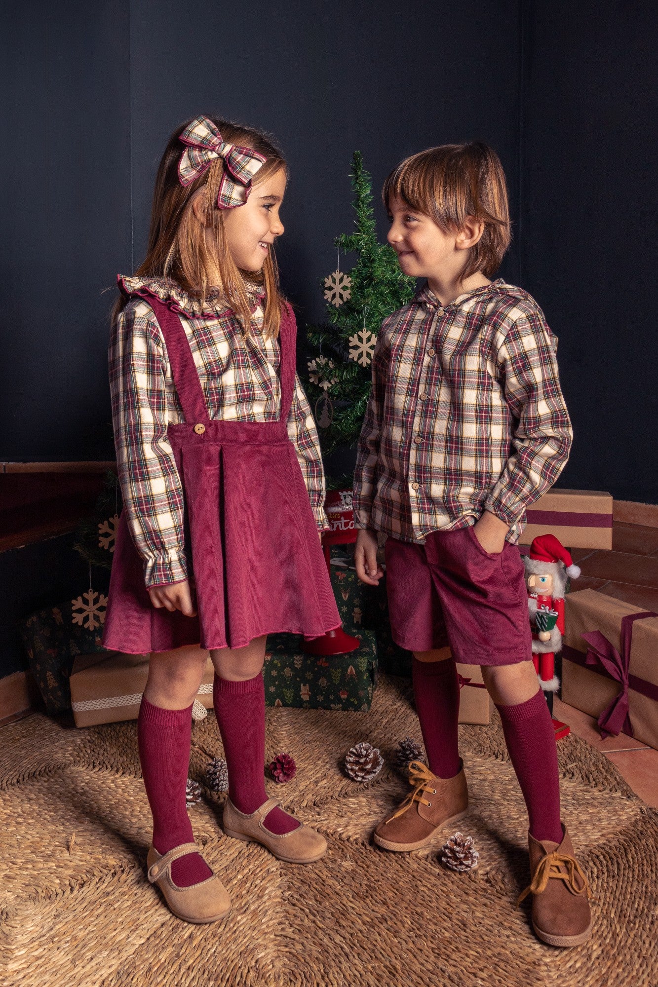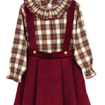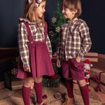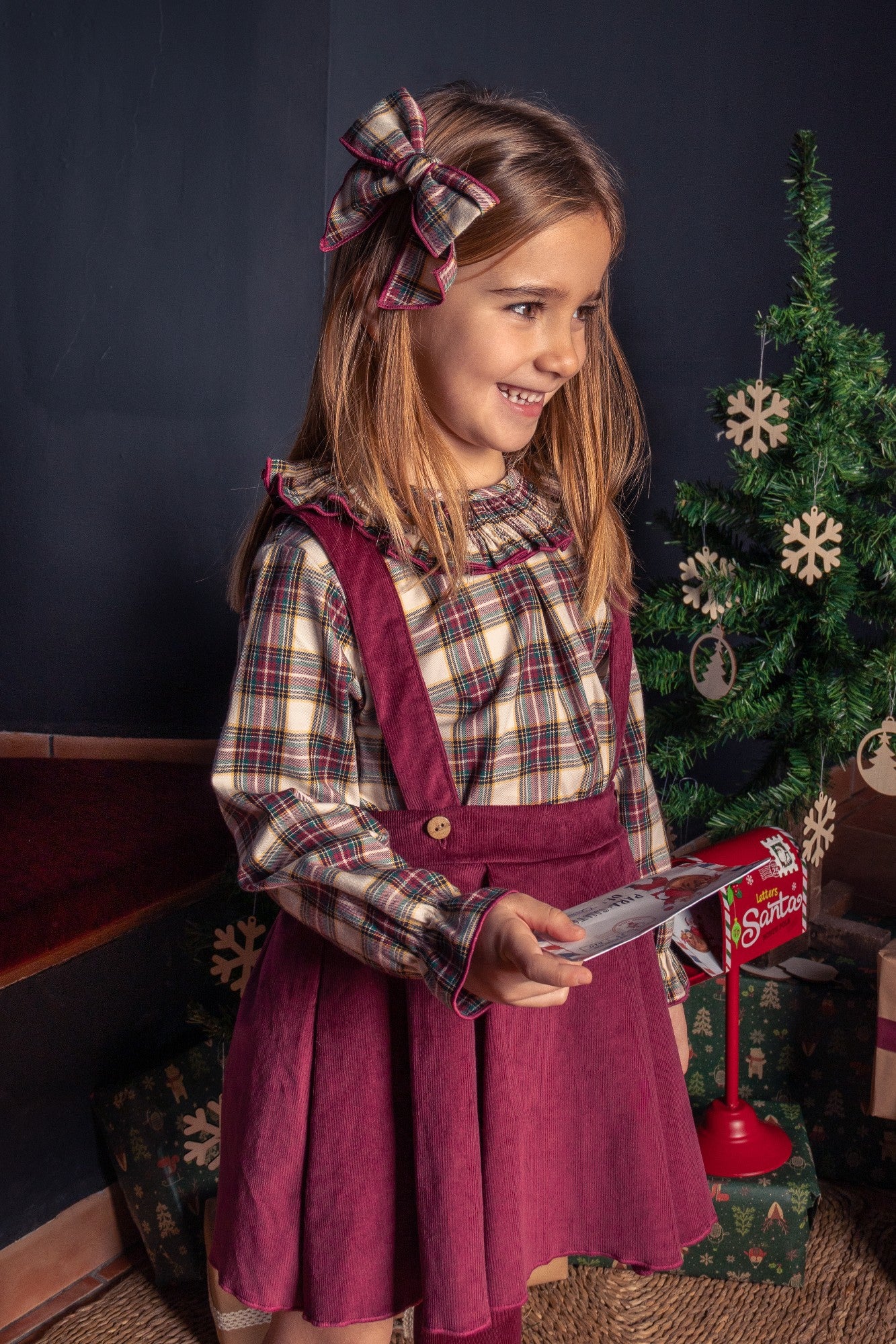 Questo completo elegante per bambina abbina una salopette a gonna in velluto raffinato con una camicia in caldo cotone scozzese, arricchita da un delicato collo a rouches. Ideale per le festività natalizie, unisce comfort e stile classico, garantendo un look sofisticato e confortevole. Perfetto per momenti speciali in famiglia o eventi festivi, questo outfit coniuga materiali di qualità e dettagli curati per un risultato impeccabile.