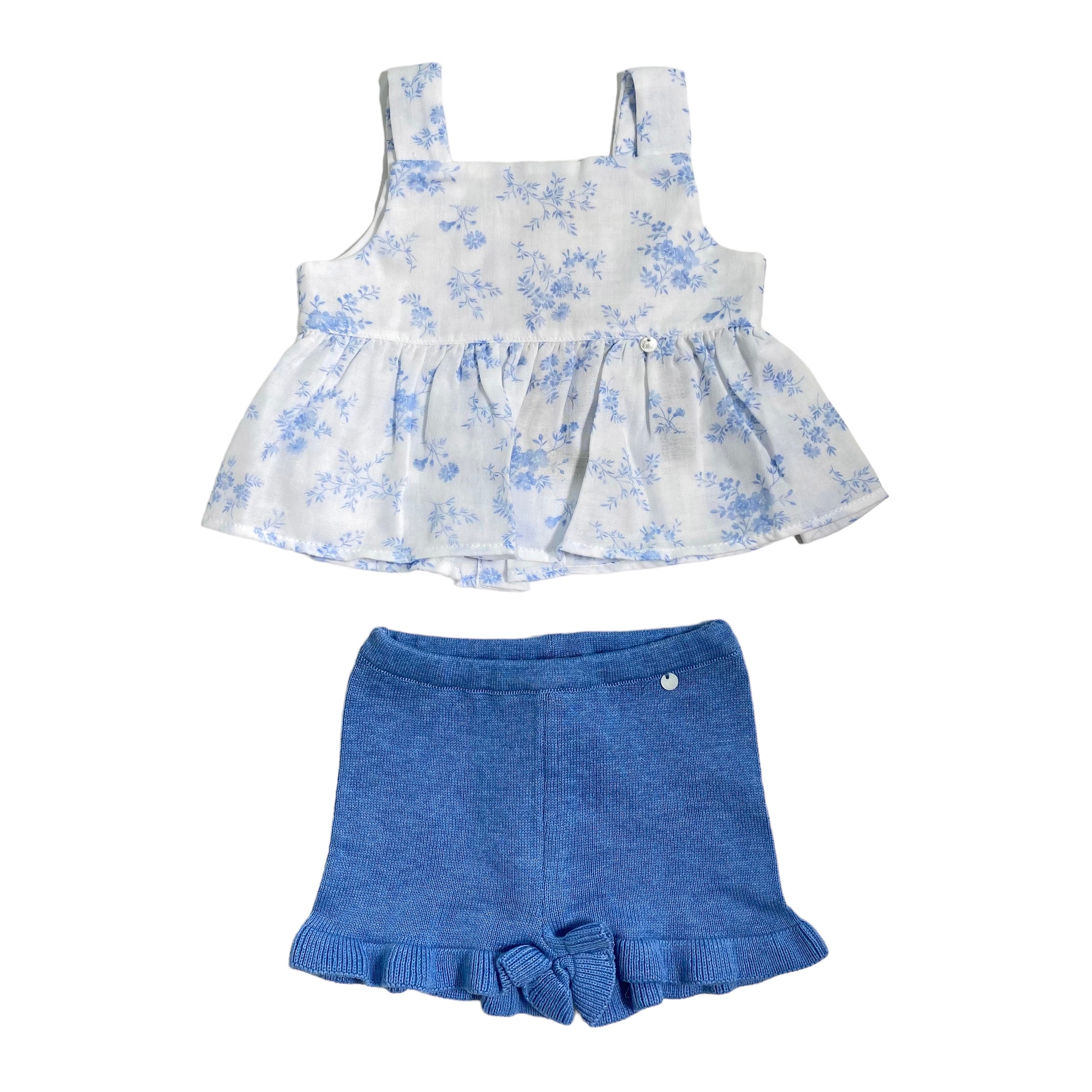 Completo composto da short in filo di cotone, in tinta unita bluette e blusa a bretelle in garza di cotone, fantasia floreale.