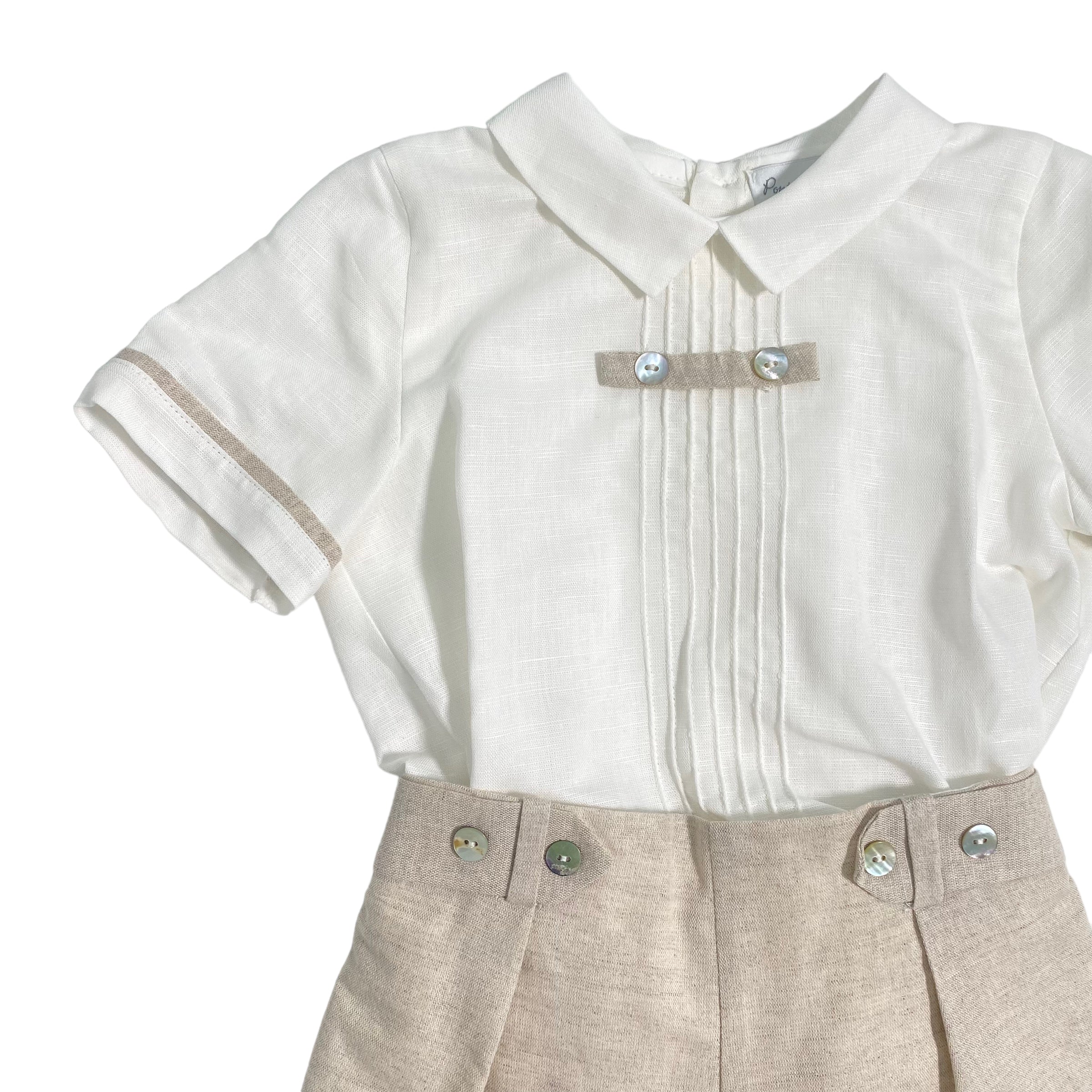 - camicia mezza manica panna, con fascia centrale a righe e applicazione.