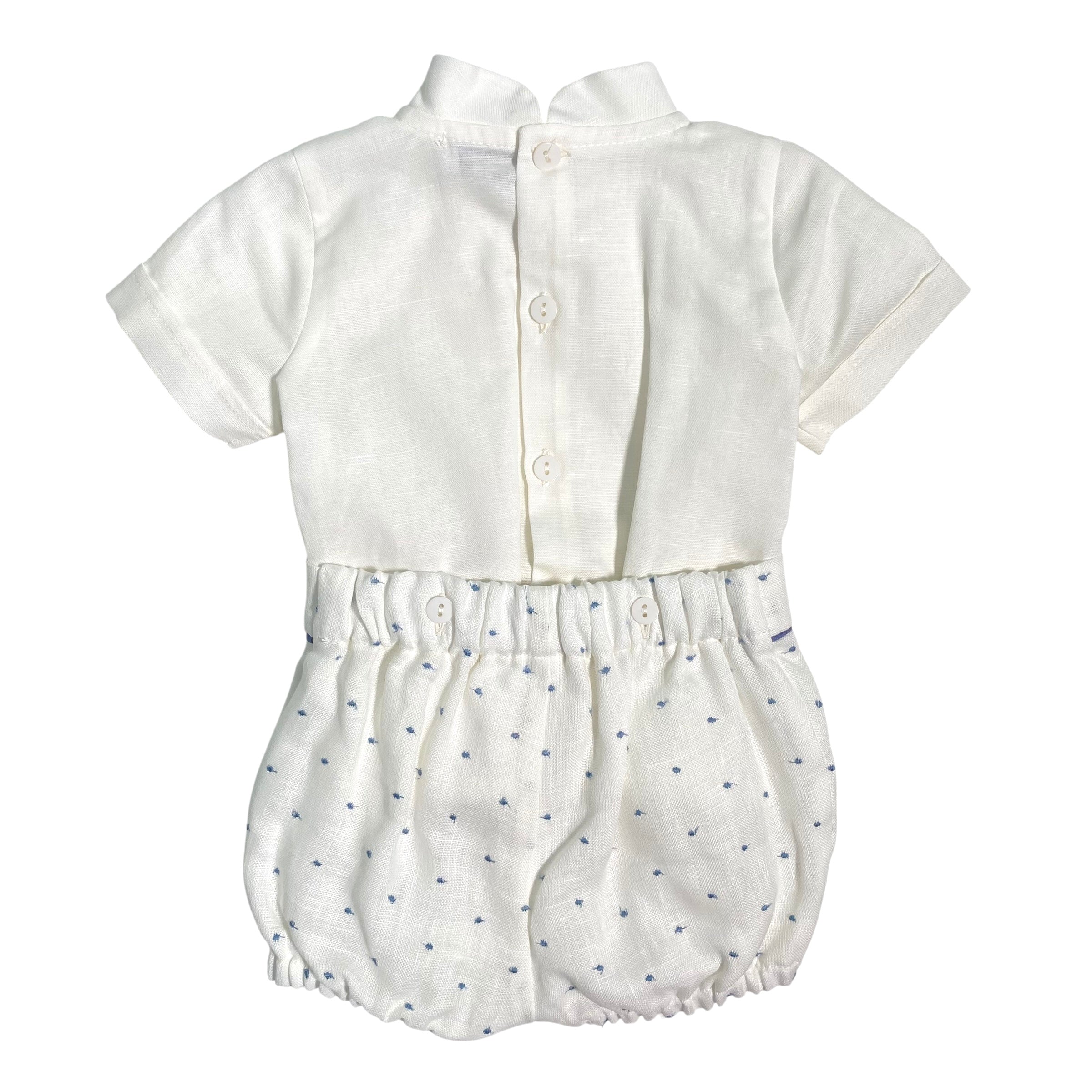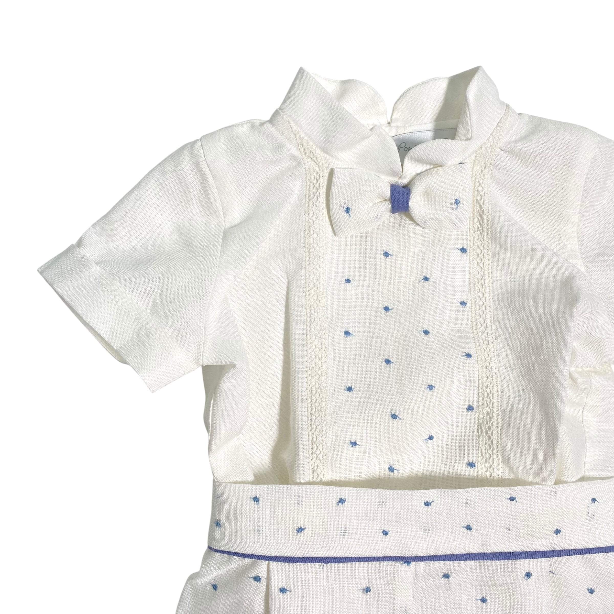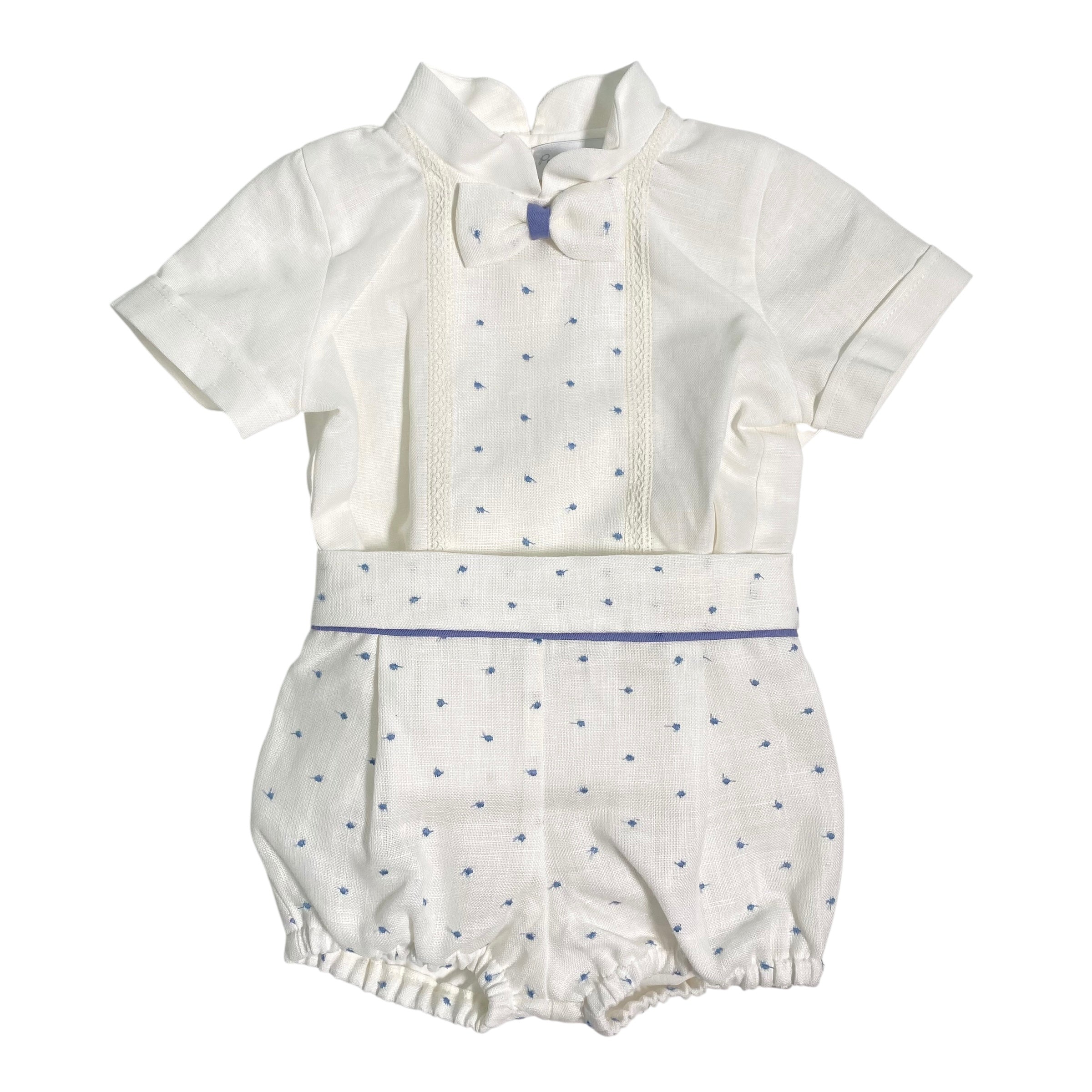 Completo corto elegante in lino con bermuda per neonato, ideale per un'occasione speciale. La camicia a mezza manica presenta una fascia centrale e un collo a pistagnina, abbinata a un papillon coordinato. Il bermuda pagliaccetto in lino bianco plumetis blu completa il look raffinato e alla moda.