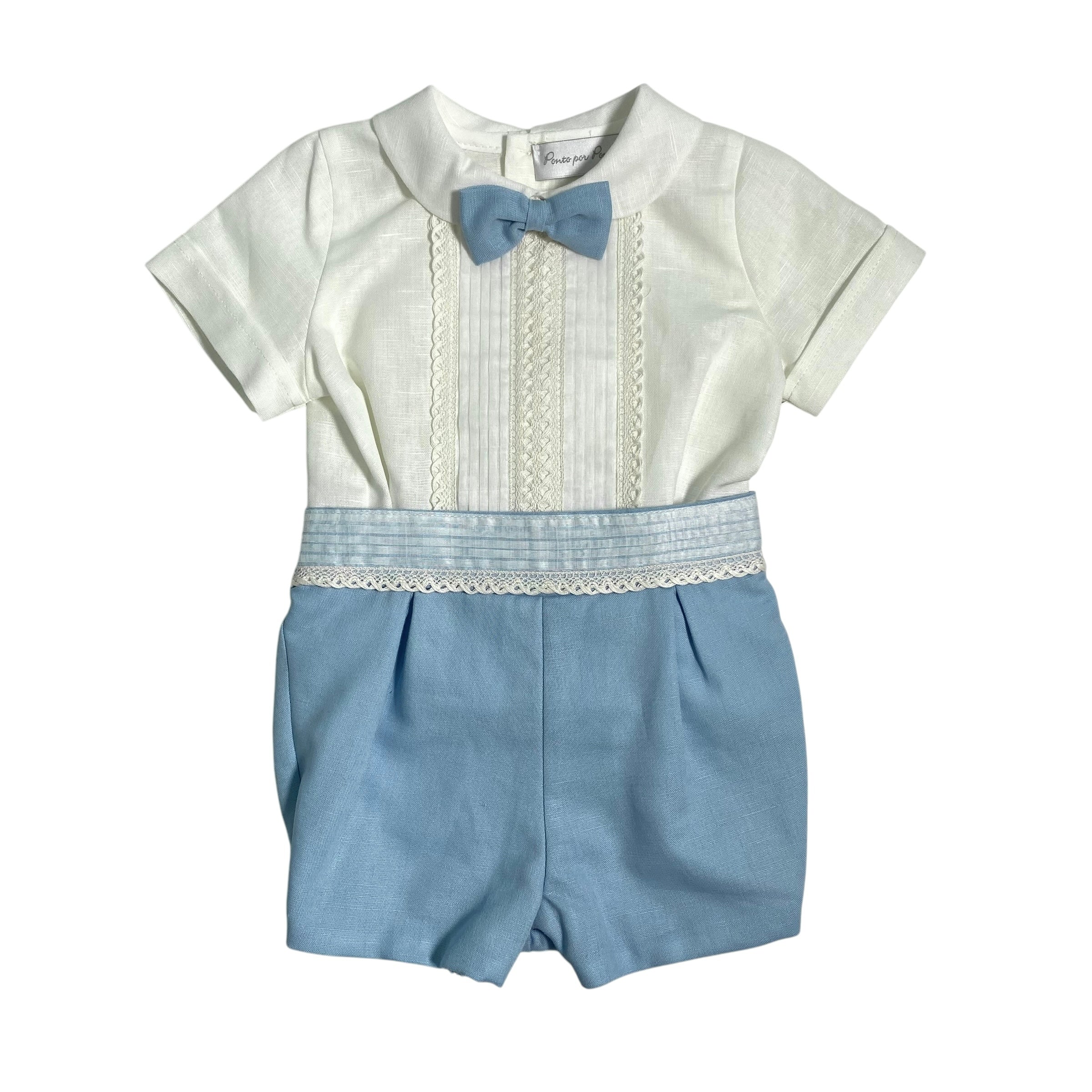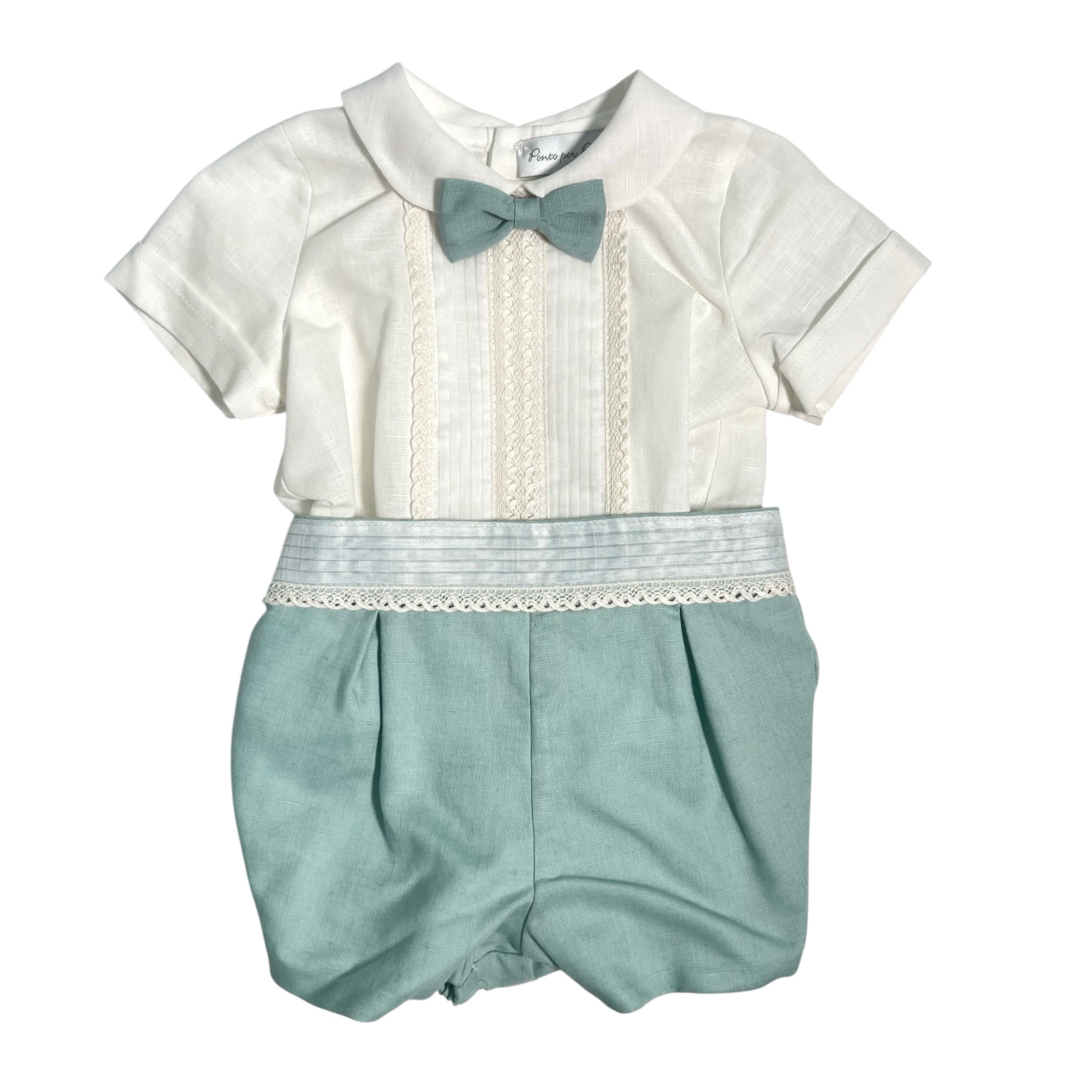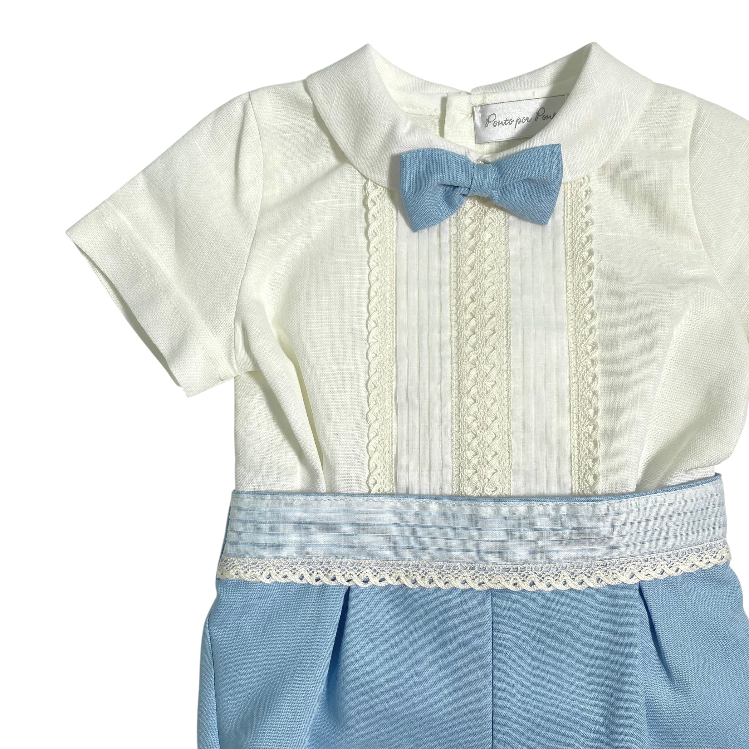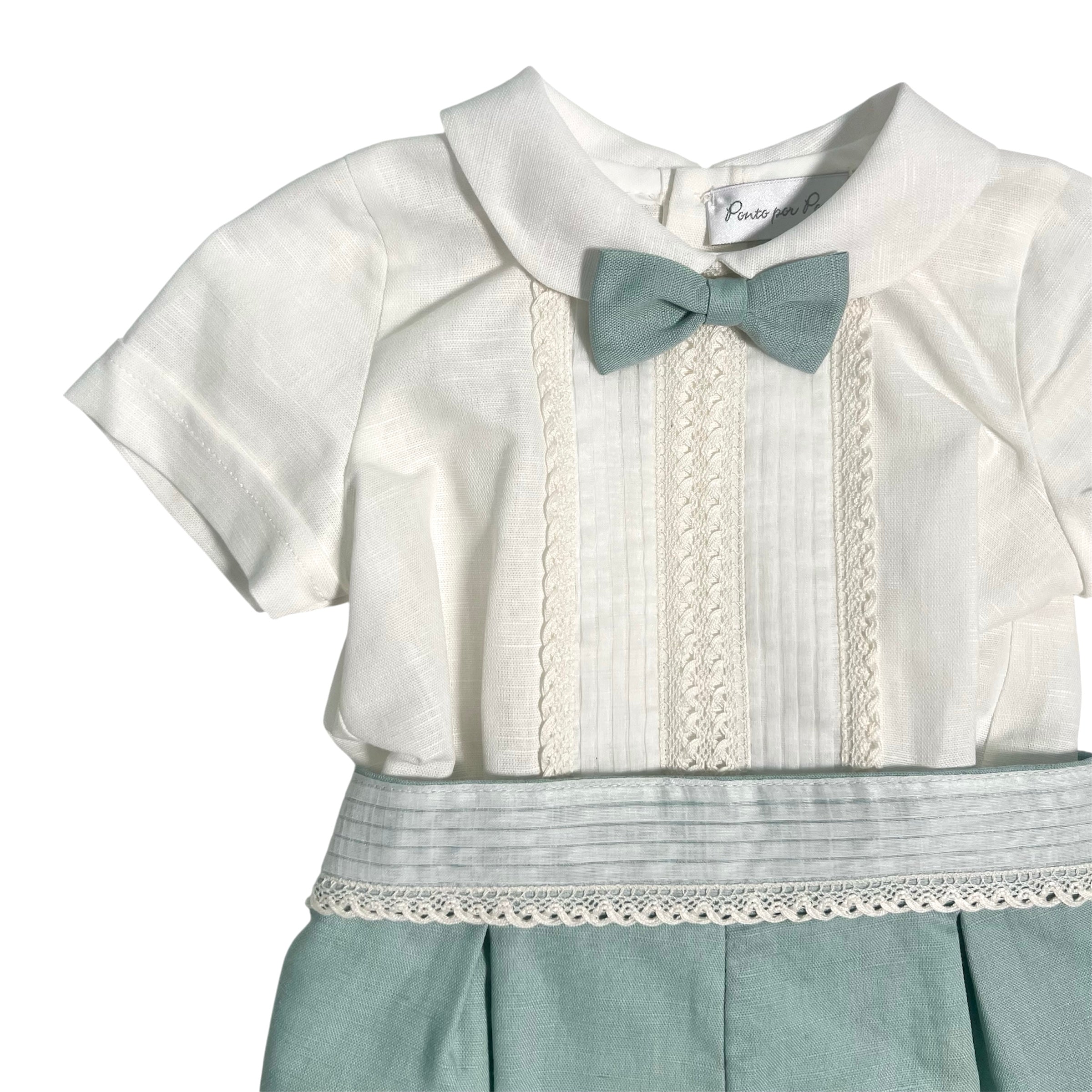 Questo elegante completo in lino è perfetto per le occasioni speciali del tuo neonato. Il bermuda e la camicia mezza manica sono impreziositi con applicazioni di pizzo sul davanti e sulla cintura. Completa il look con il papillon abbinato per un tocco di stile.