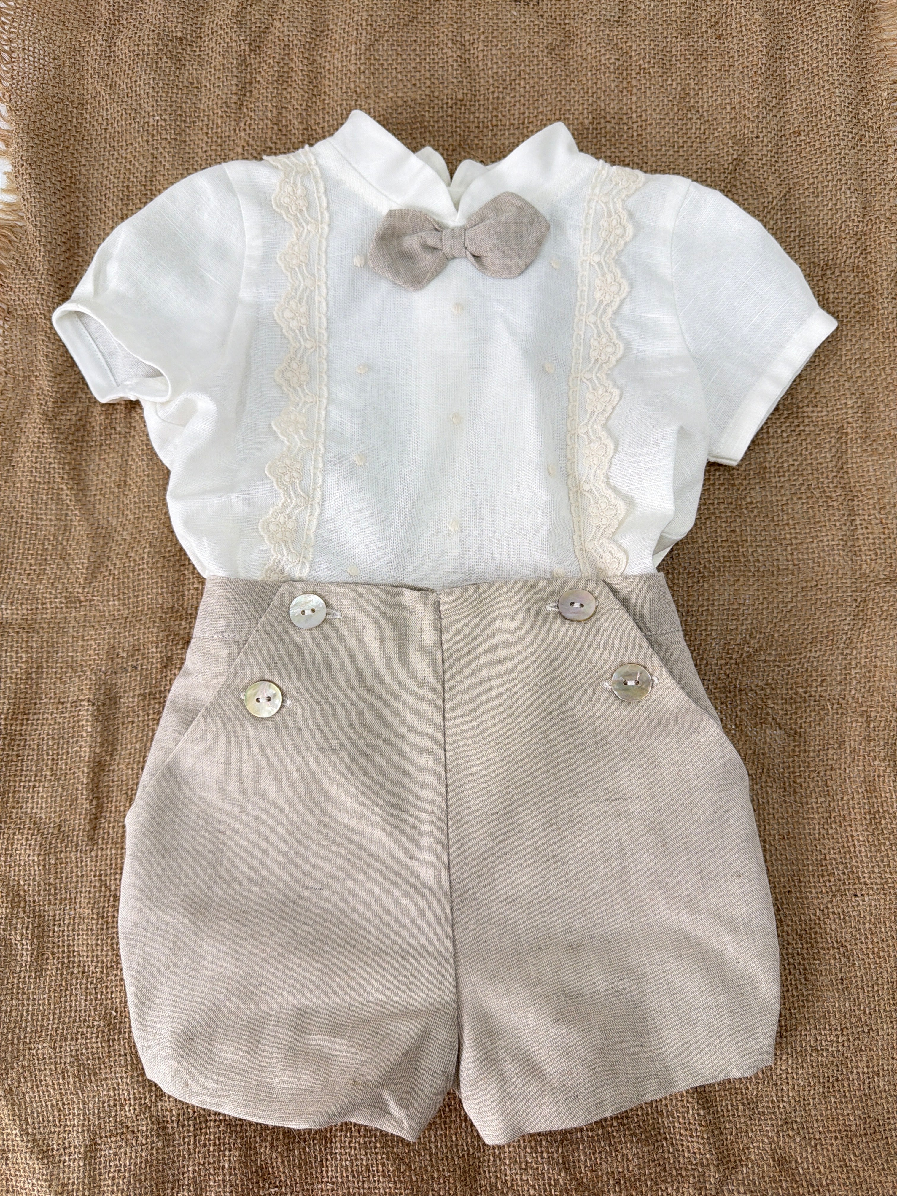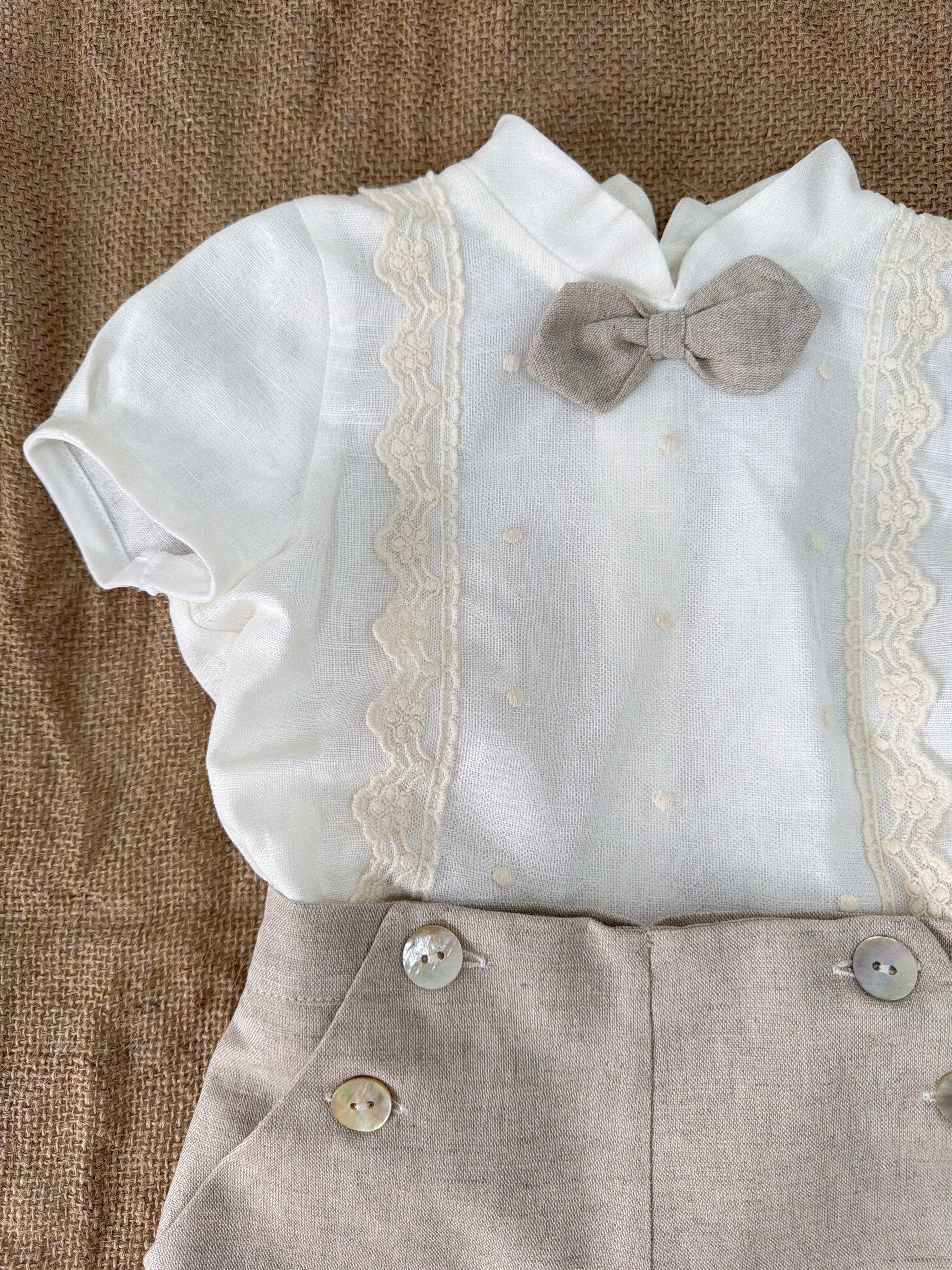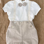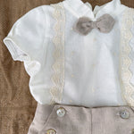 Questo elegante completo in cotone è perfetto per le occasioni speciali del tuo neonato. Il bermuda e la camicia mezza manica in lino sono impreziositi con applicazioni di pizzo sul davanti. Completa il look con il papillon abbinato per un tocco di stile.