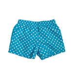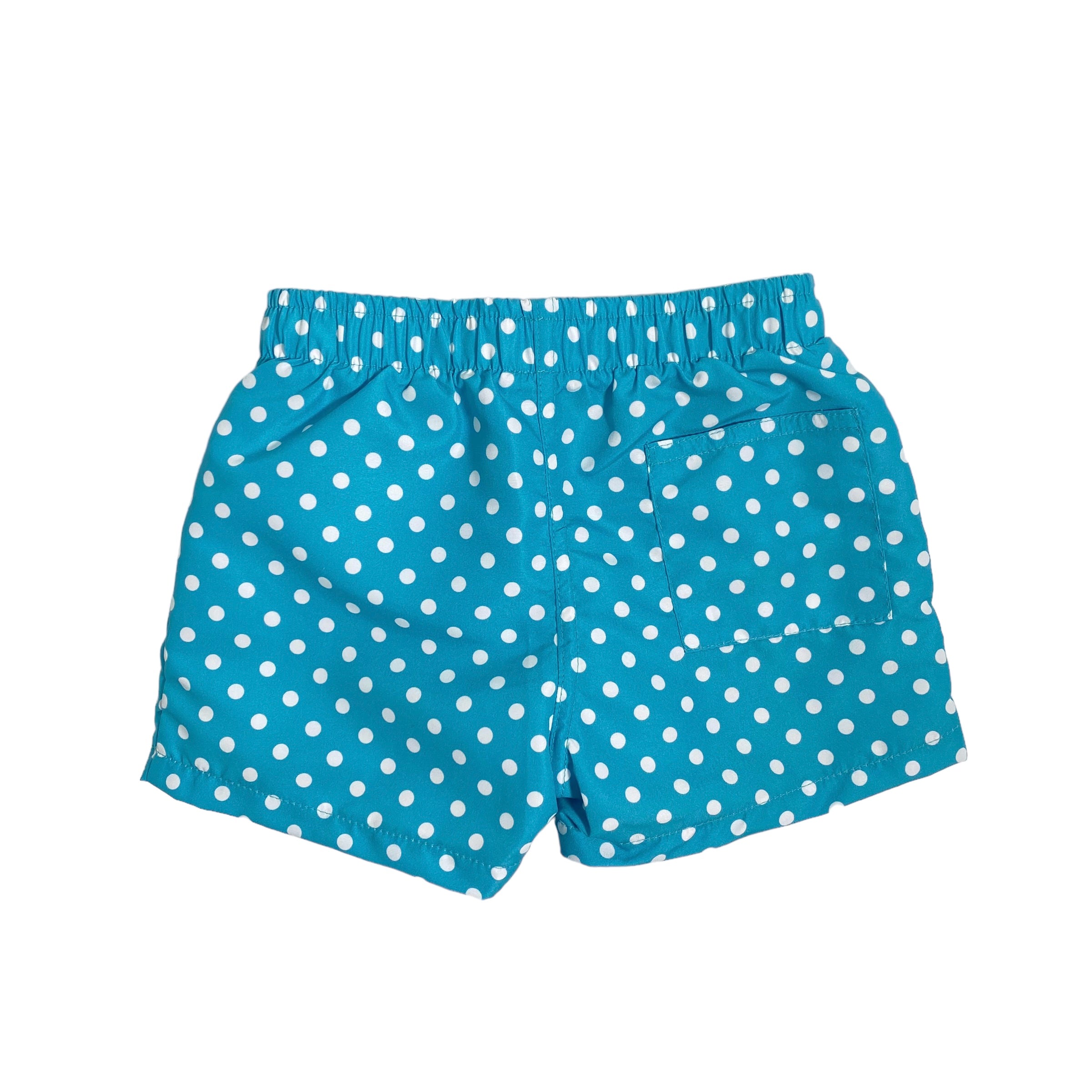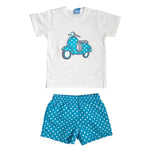 Completo composto da costume a pantaloncino turchese a poise biachi e t-shirt bianca con ricamo di vespa.