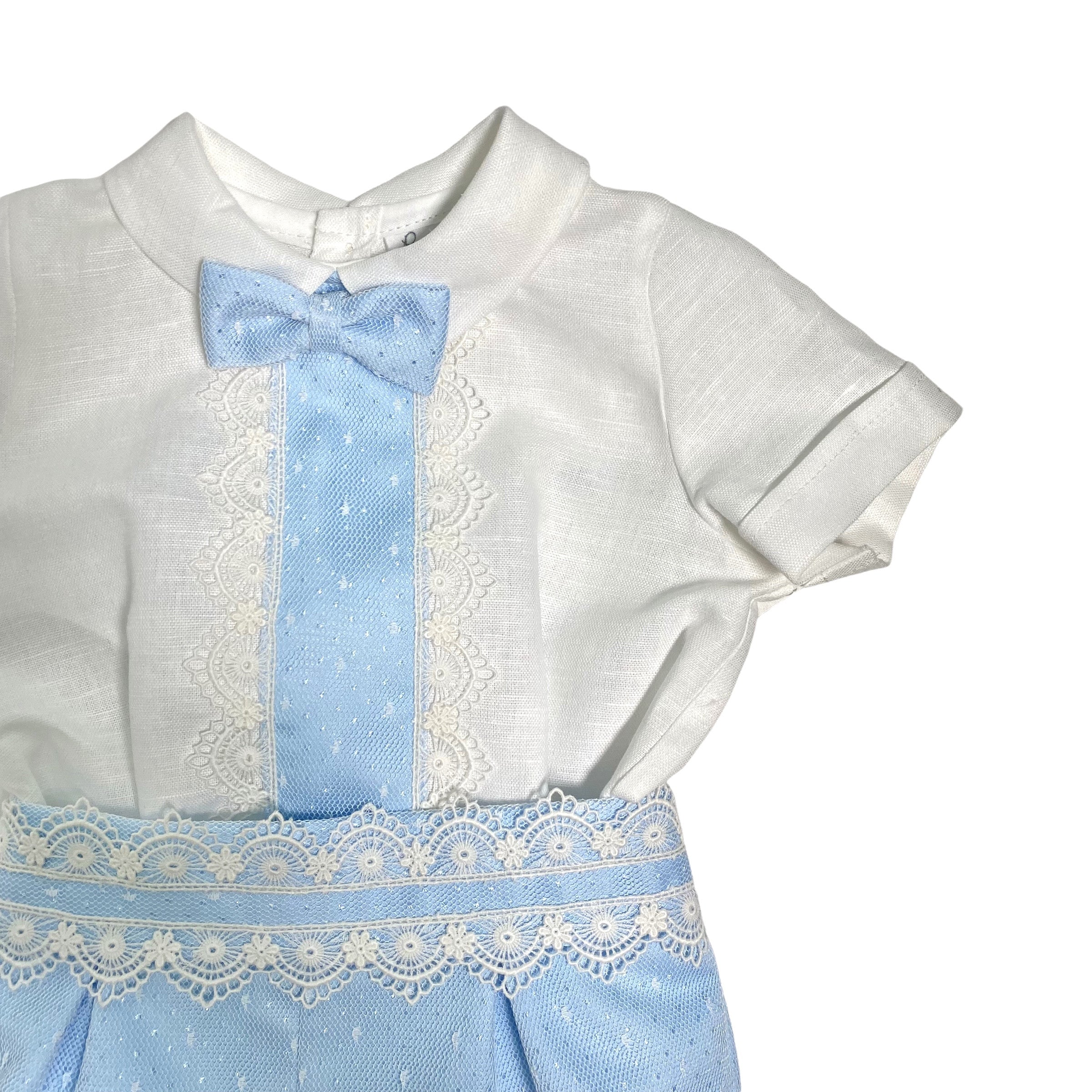 Composto da camicia mezza manica bianca mezza manica. Sulla parte davanti è presente una bellissima lavorazione in pizzo bianco centrale e fascia celeste con tulle puntinato.
