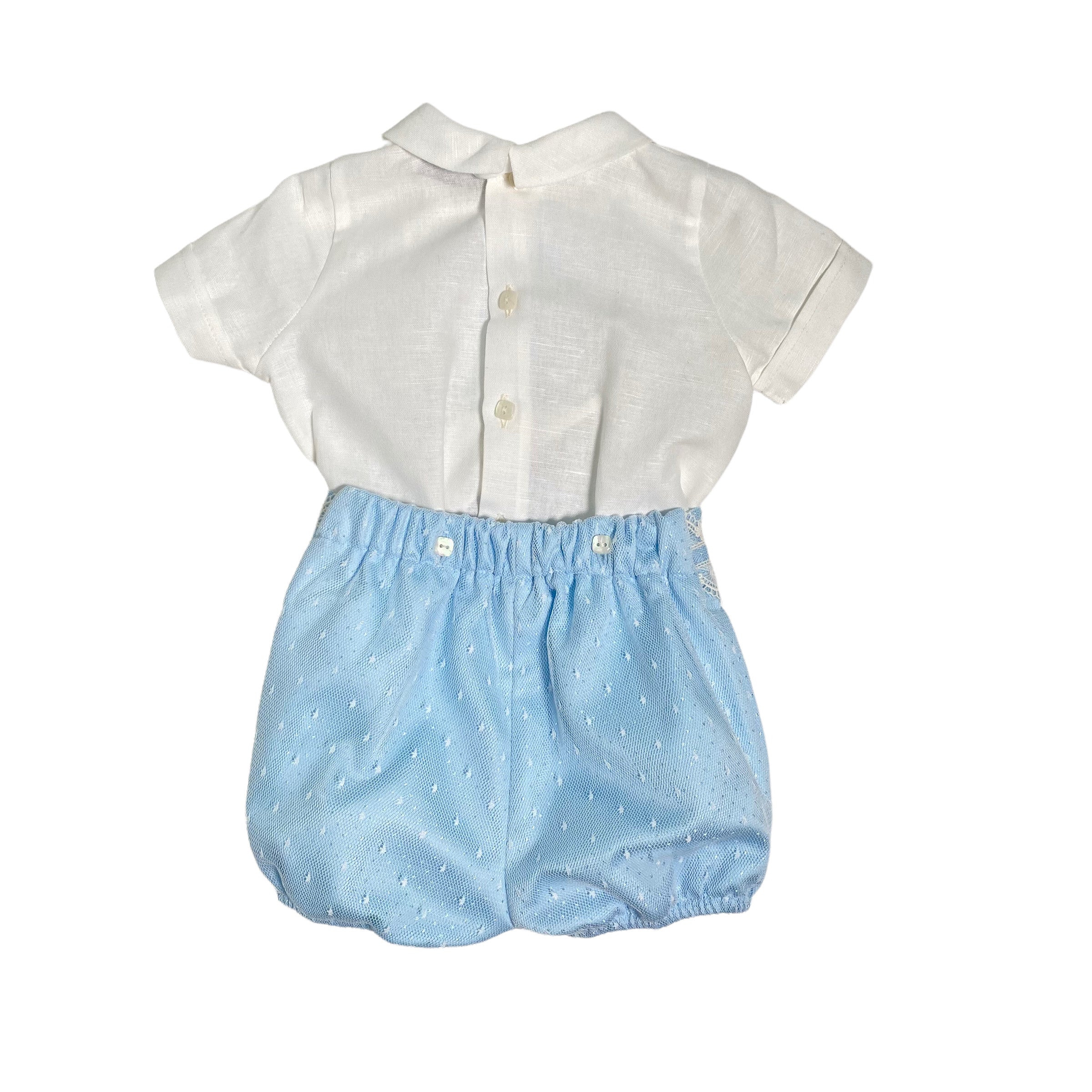 Pantaloncino corto celeste con la vita impreziosita dalla stessa lavorazione in pizzo presente sulla camicia. Il pantaloncino è celeste ricoperto da tulle puntinato. La camicia si lega con il pantaloncino con dei bottoncini interni, da poterlo far diventare un elegante e bellissimo pagliaccetto.