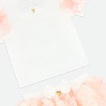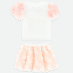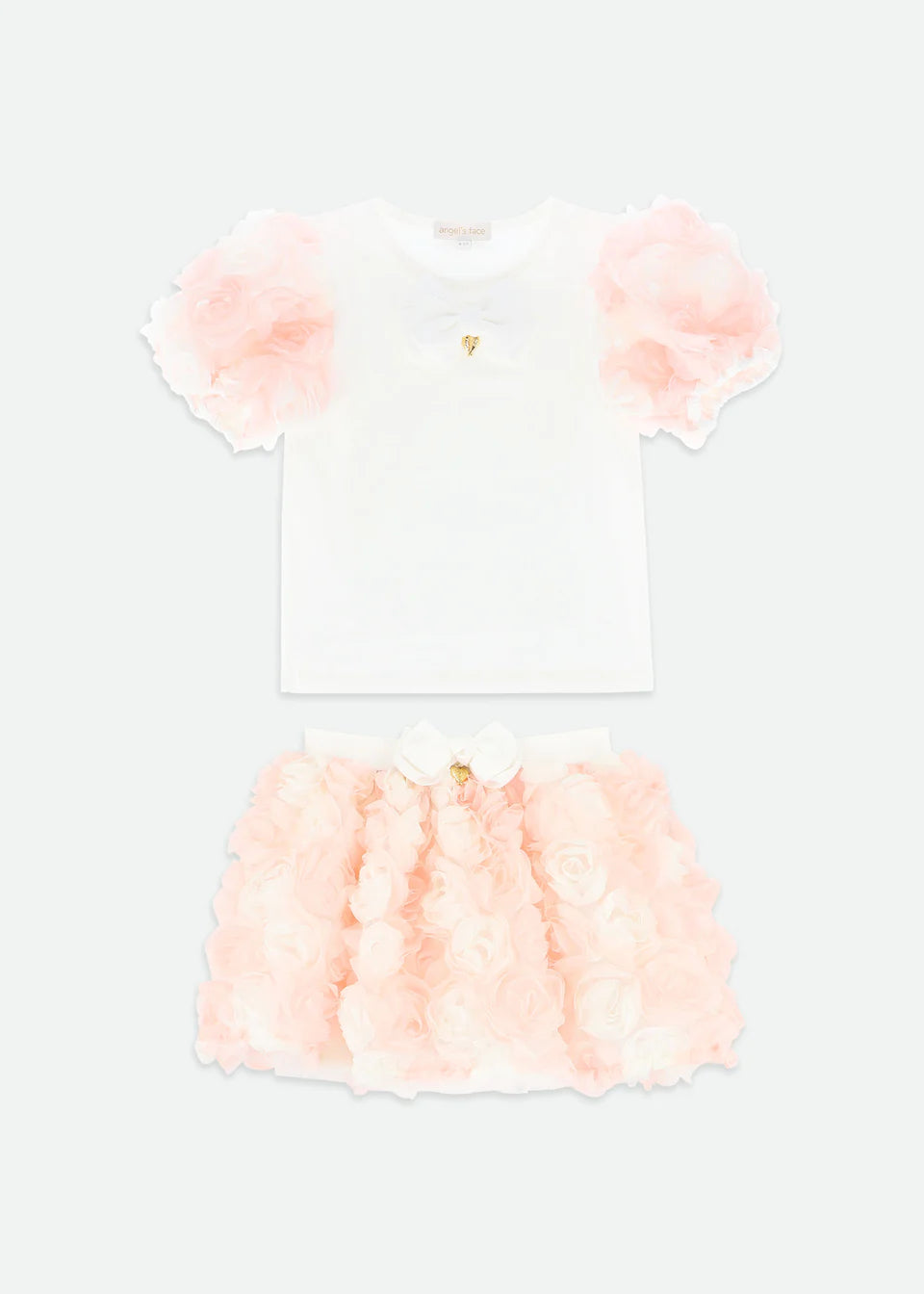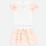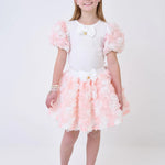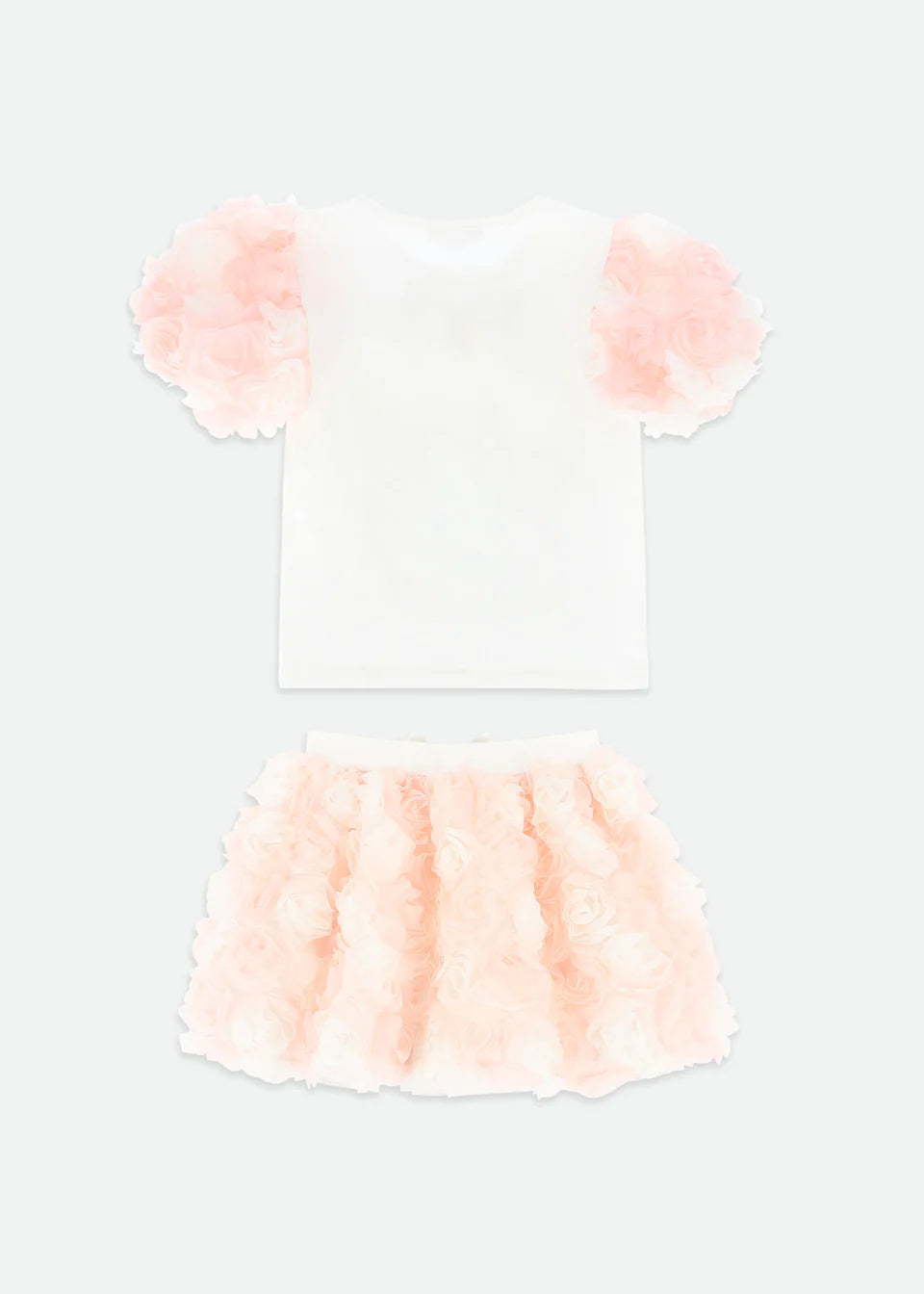 Adorabile top e gonna con rose 3D in bucaneve. La maglietta presenta voluminose maniche a balze in tulle con rose rosa e bianche. La gonna ha due strati di tulle ed è foderata in un morbido misto cotone. Il top e la gonna sono completati dal nostro fiocco distintivo e dal ciondolo a forma di cuore dorato sul petto e sulla cintura.