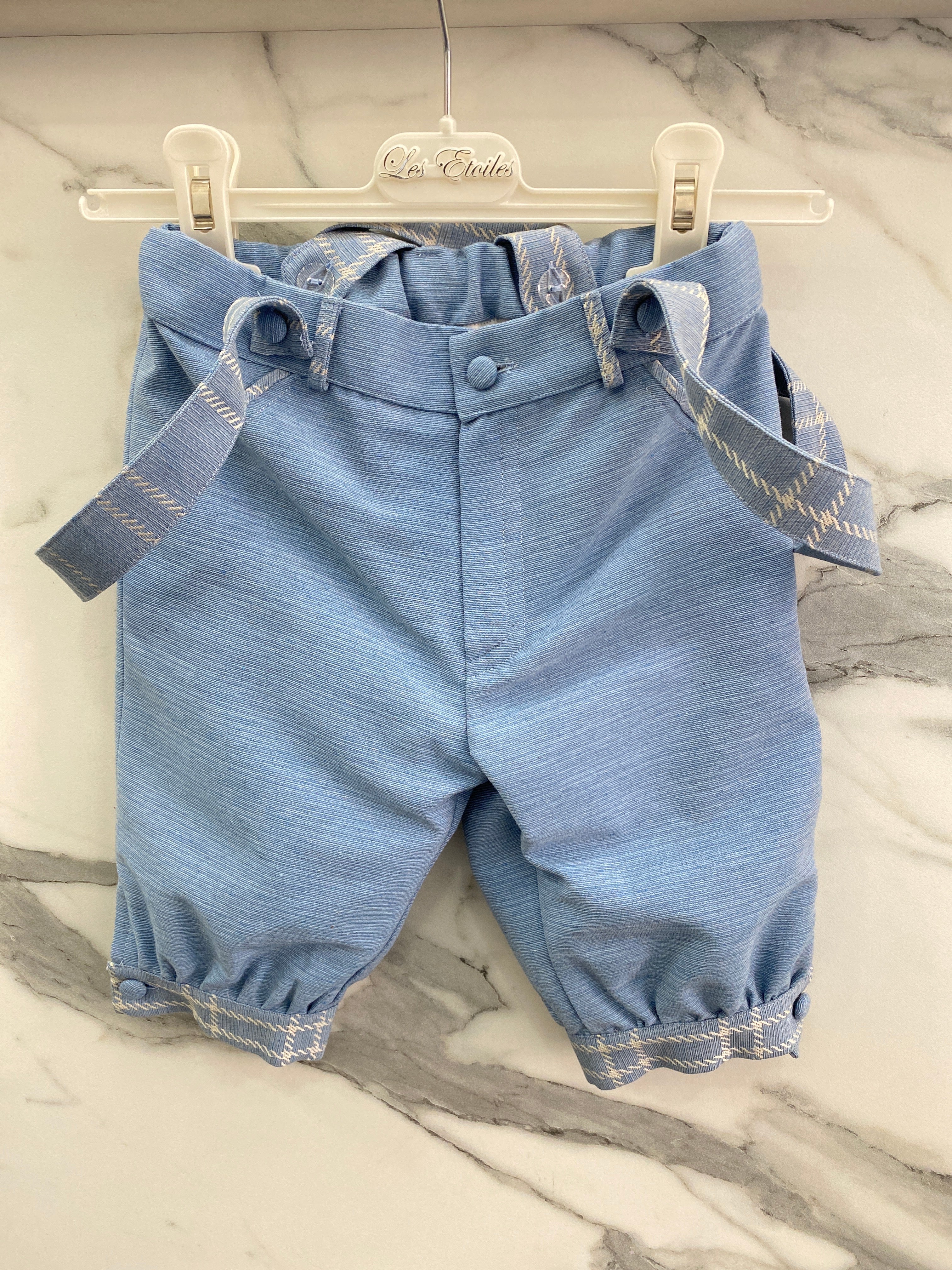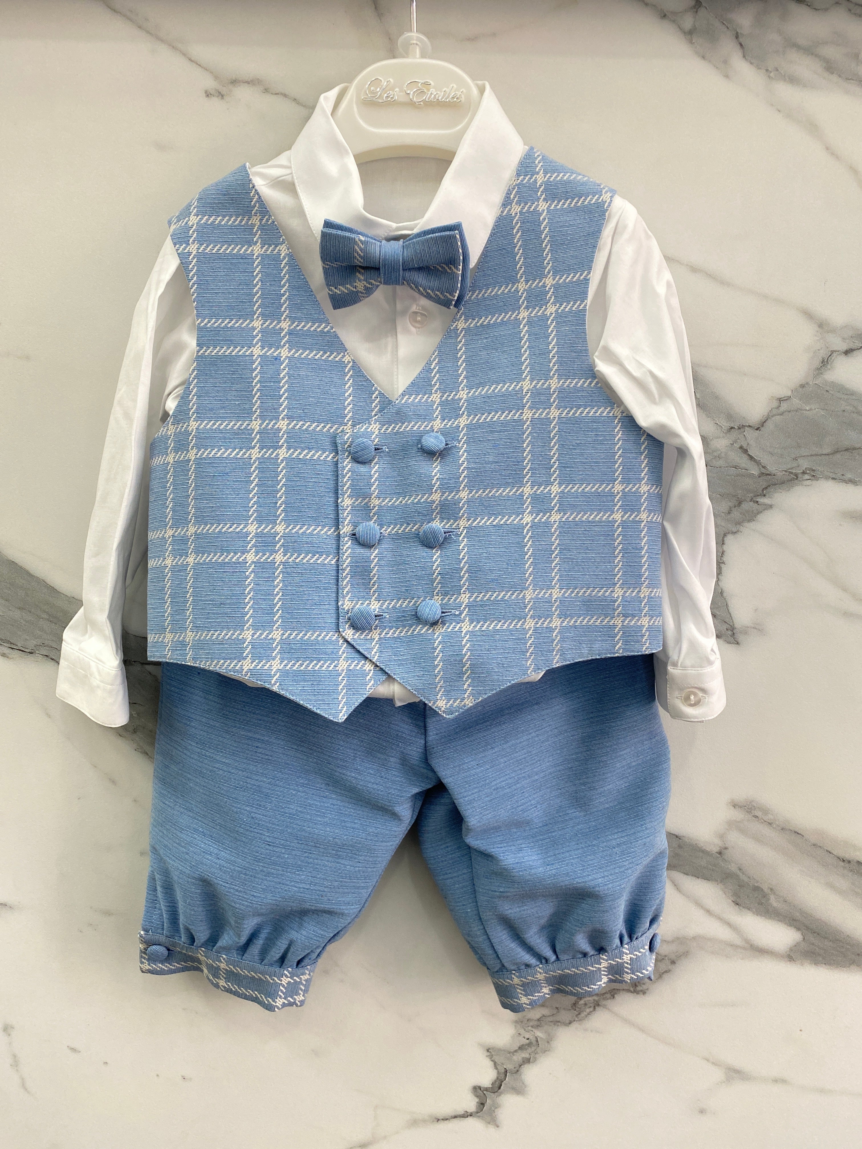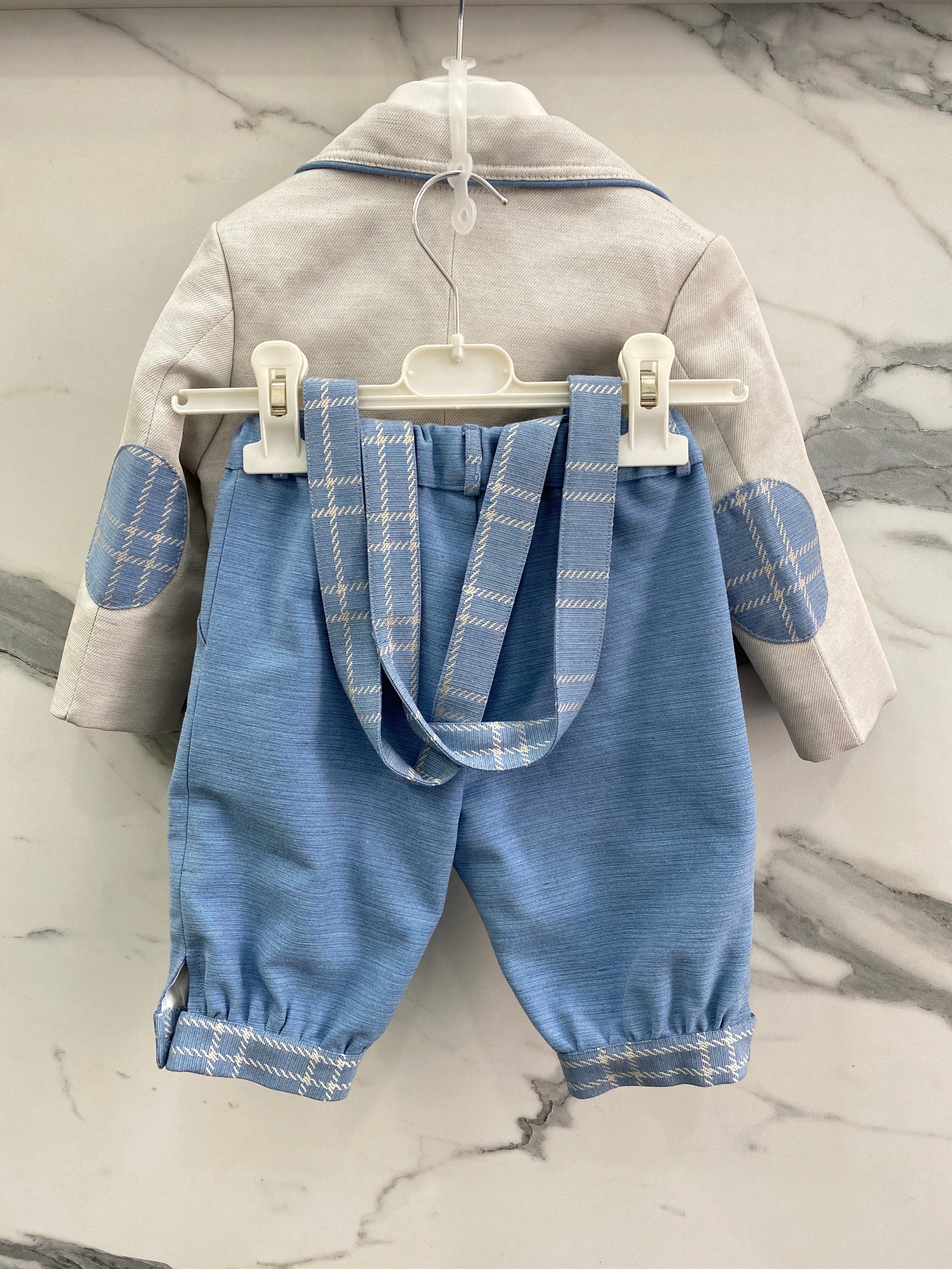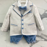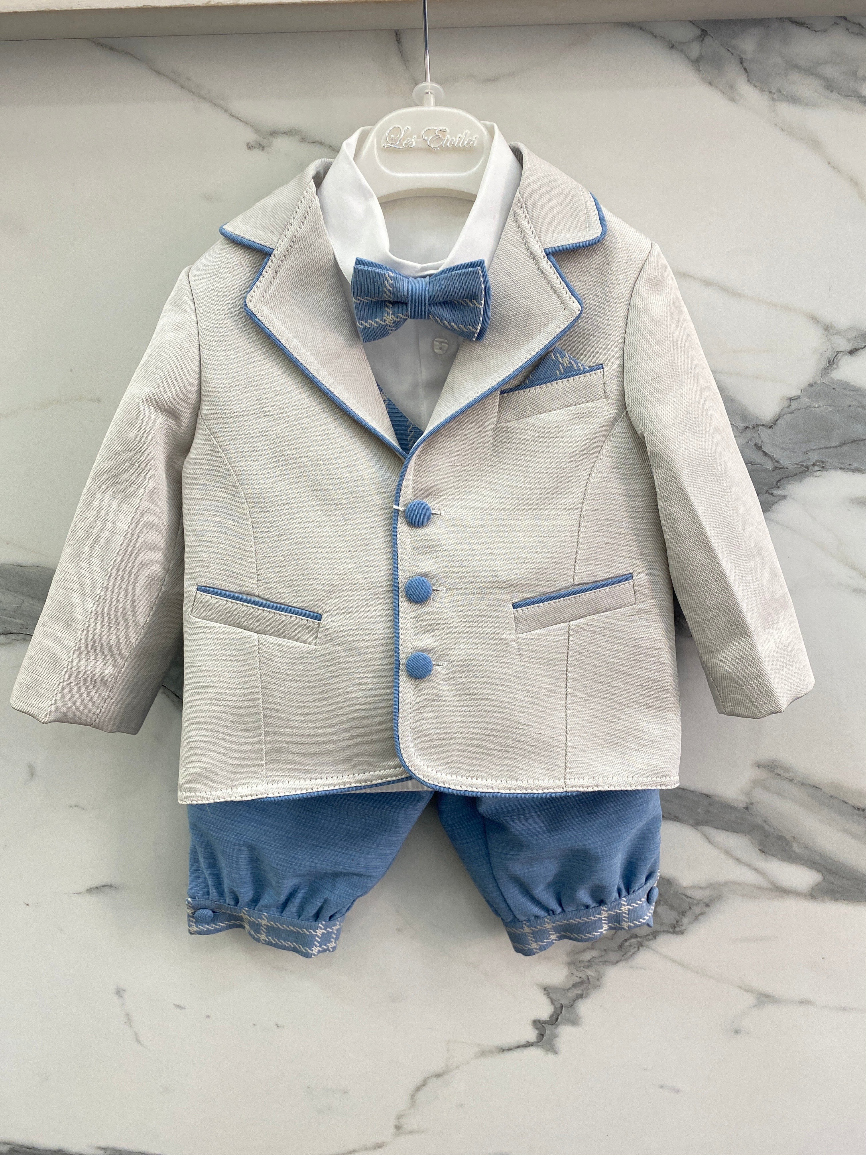 Questo completo elegante LES ETOILES UMBERTO per neonato è dotato di pantalone pagliaccio con bretelle, camicia bianca, panciotto doppio petto, papillon e giacca. Con materiali di alta qualità e design raffinato, è perfetto per ogni occasione speciale. Regala al tuo bambino un look elegante e di alta classe.