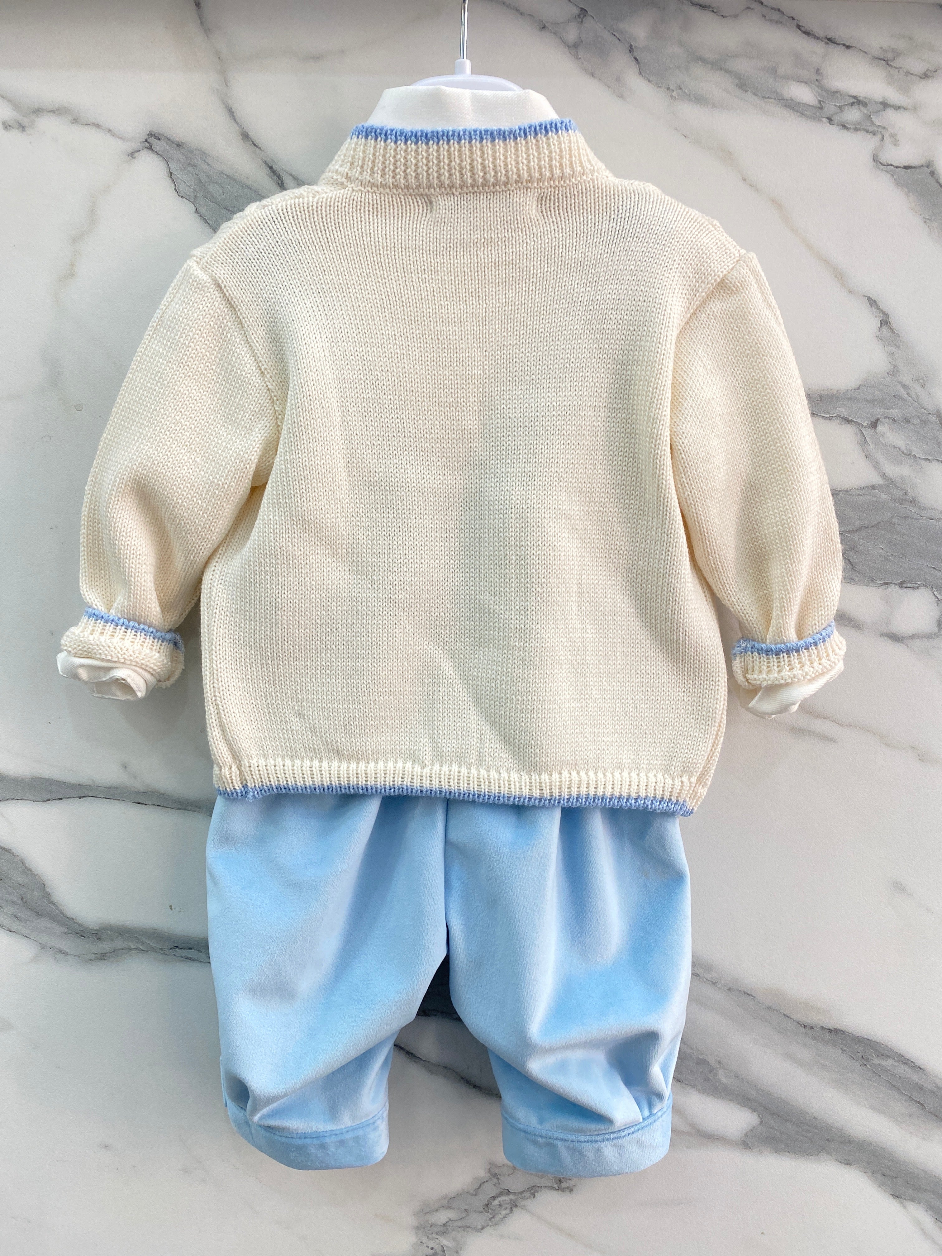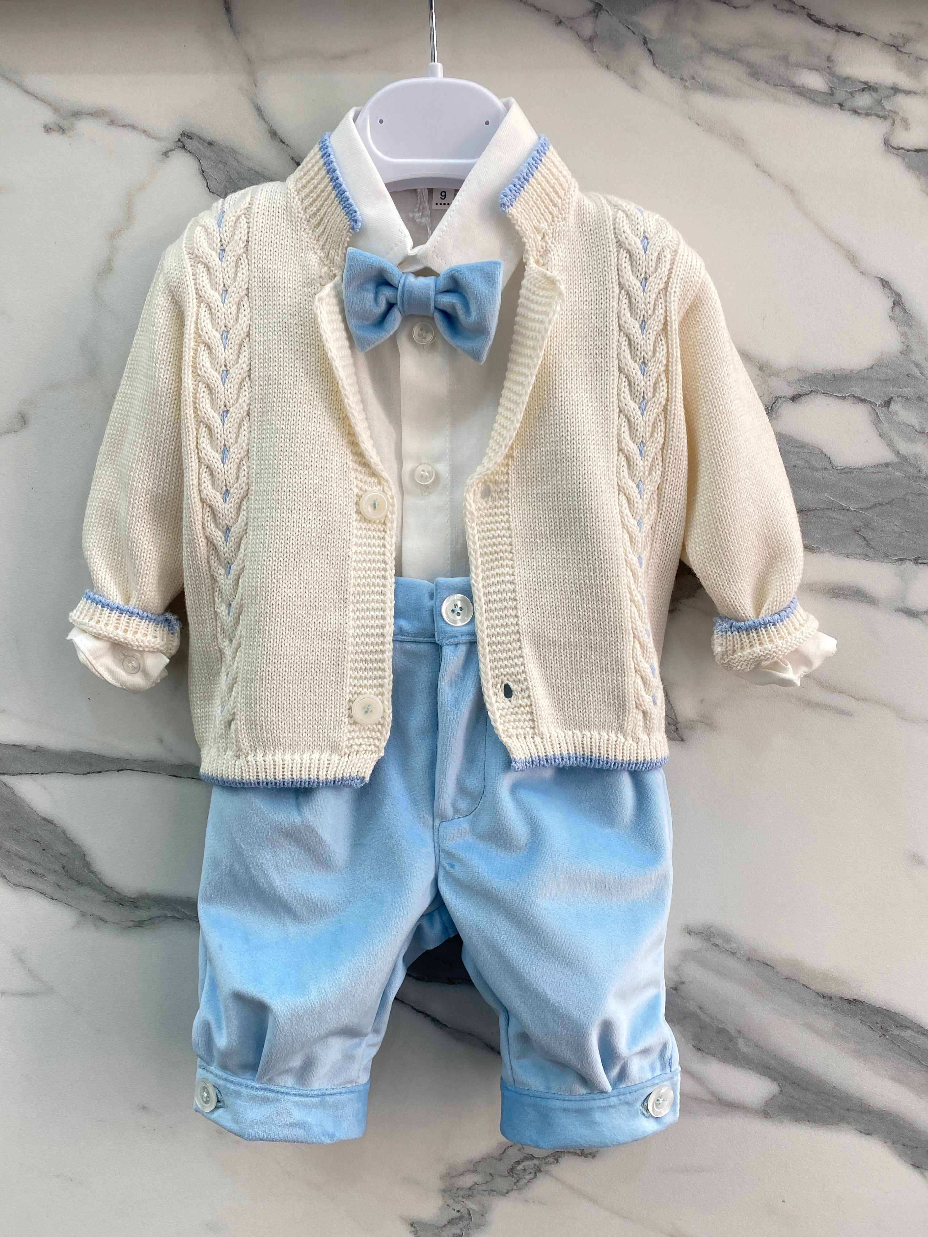 Il completo elegante con salopette in velluto neonato LA SARTORIA DEI PICCOLI è composto da una salopette in velluto celeste, camicia in caldo cotone, papillon in velluto e cardigan in misto lana. Perfetto per un'occasione speciale, dona un look elegante e confortevole al tuo piccolo.