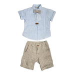 Completo elegante in lino con bermuda beige a righe e camicia chiusa avanti, con collo coreano, mezza manica, in tinta unita celeste.