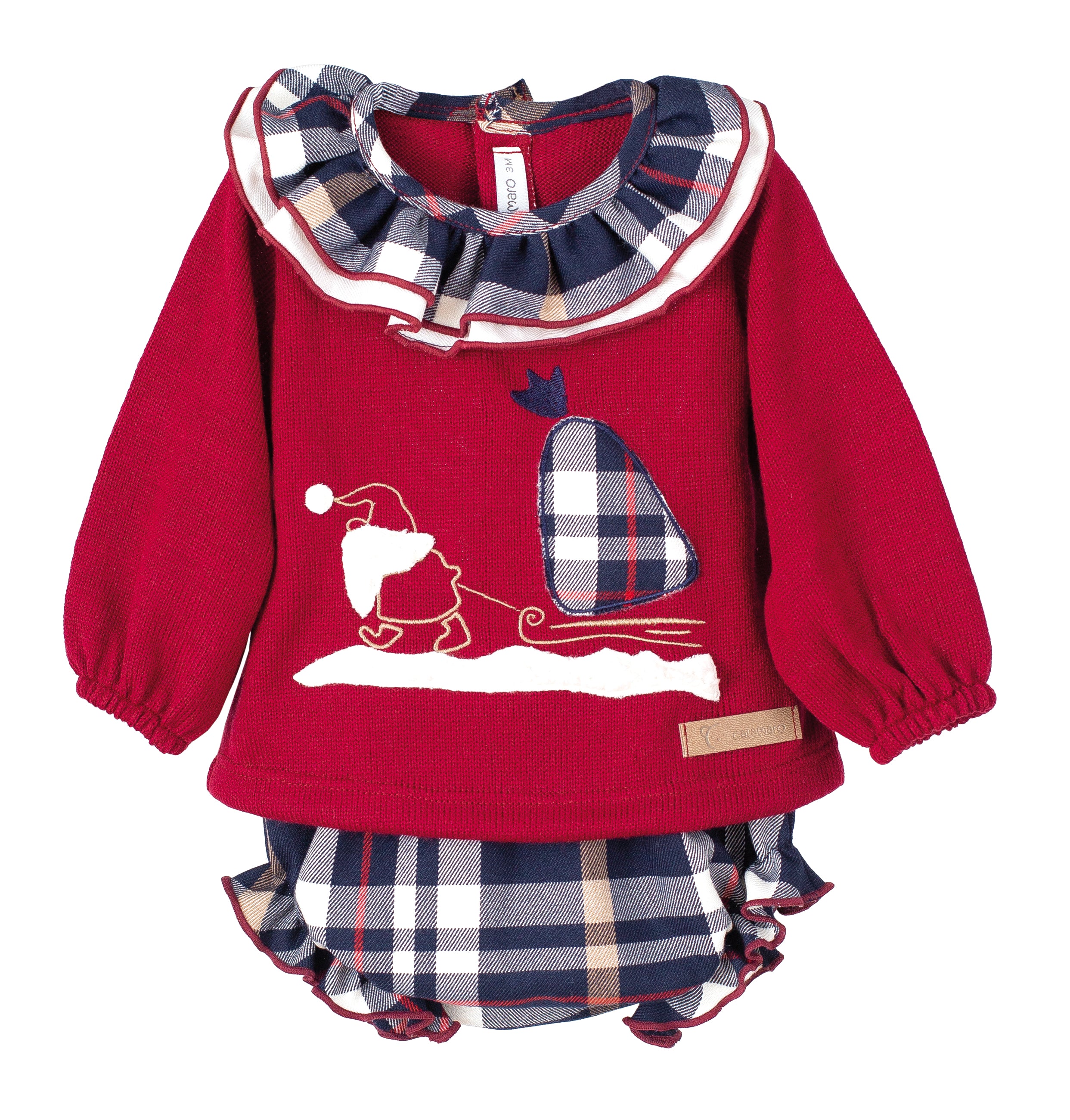 Completo in caldo cotone composto da culotte a quadroni e maglia rossa con collo rouche e ricamo di babbo natale con slitta.