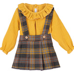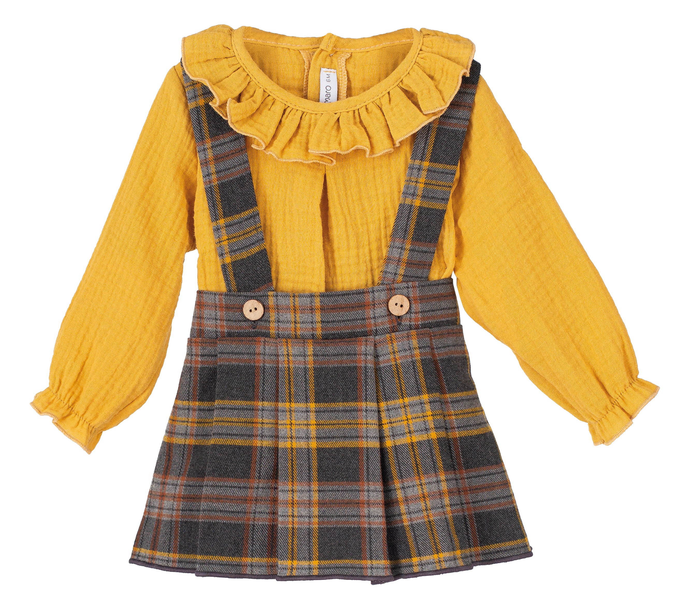 Completo in caldo cotone composto da camicia in tinta unita senape con collo rouche e scamiciata a quadri.