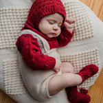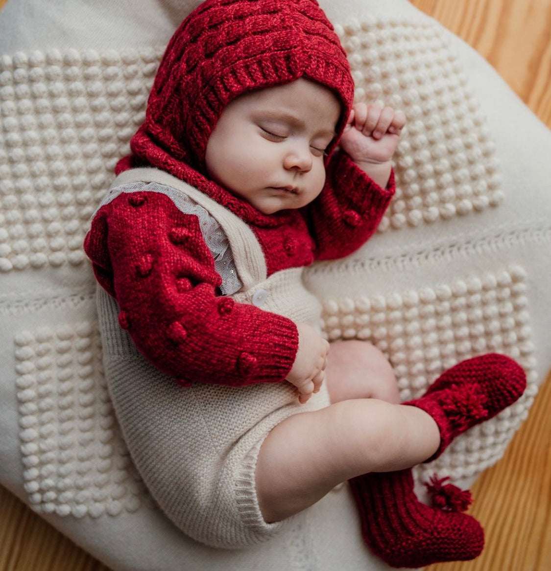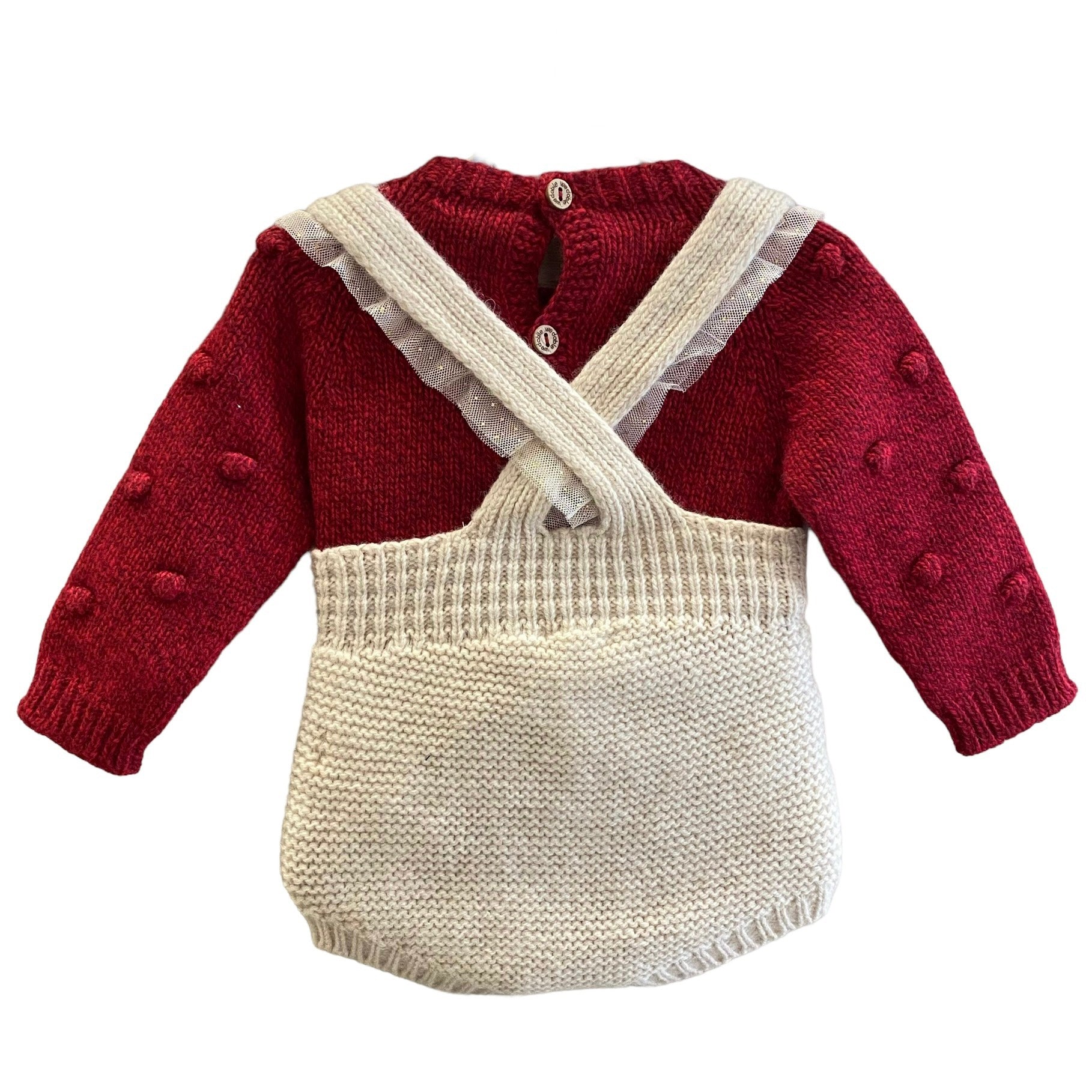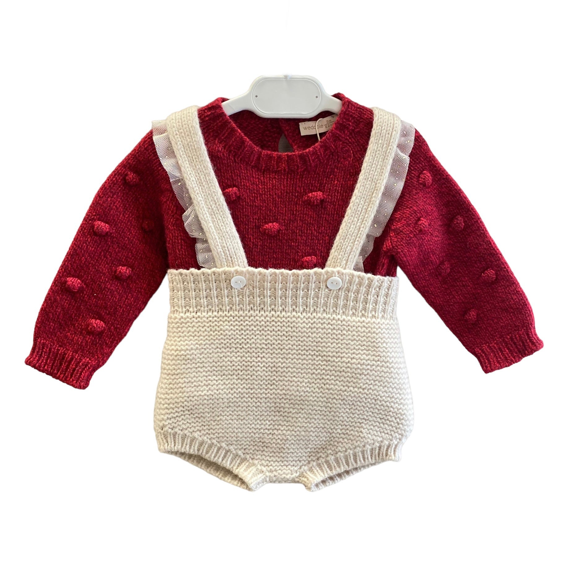 Completo in lana composto da salopette corta e maglioncino con poise a rilievo.