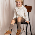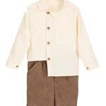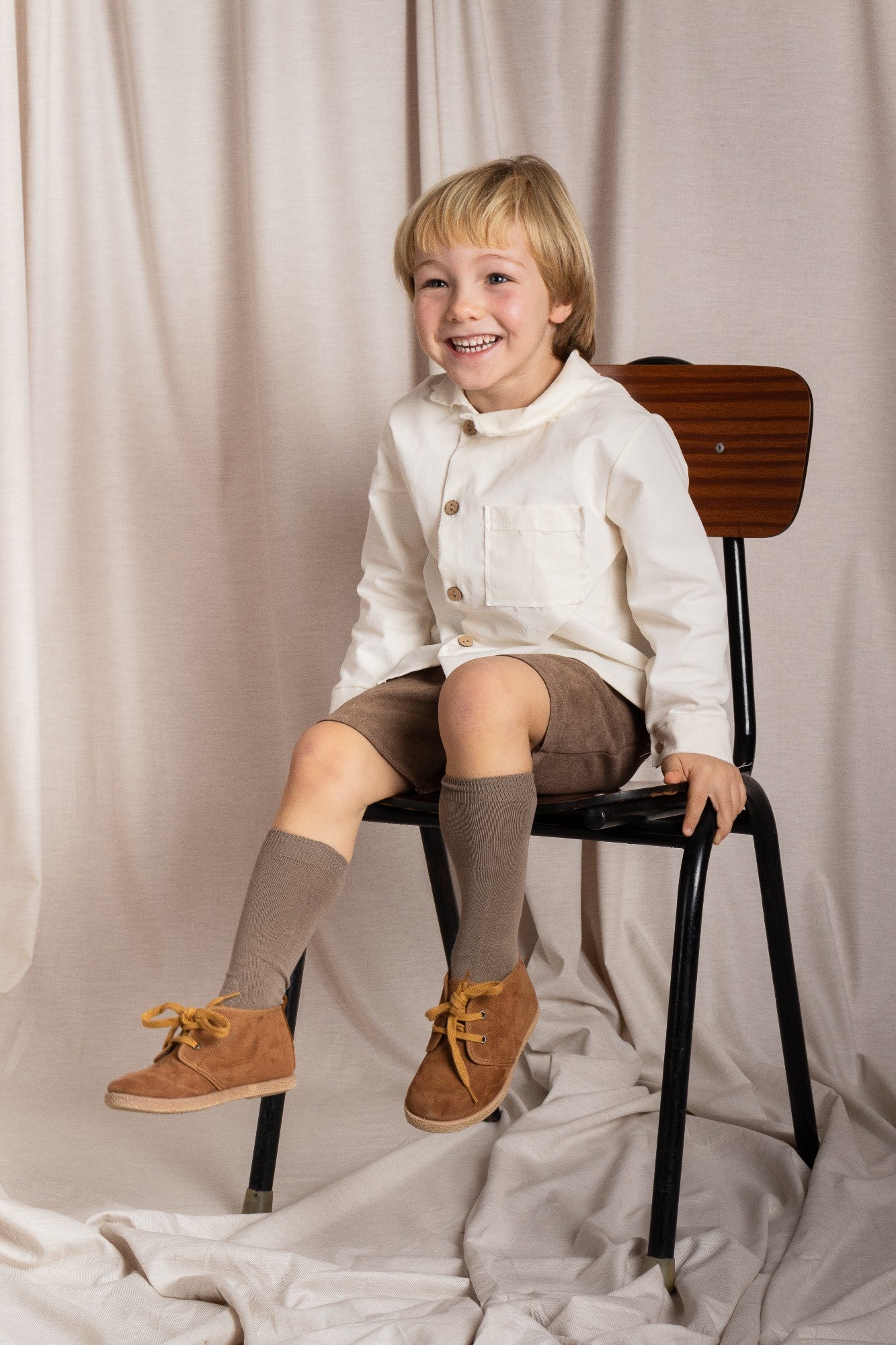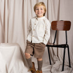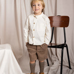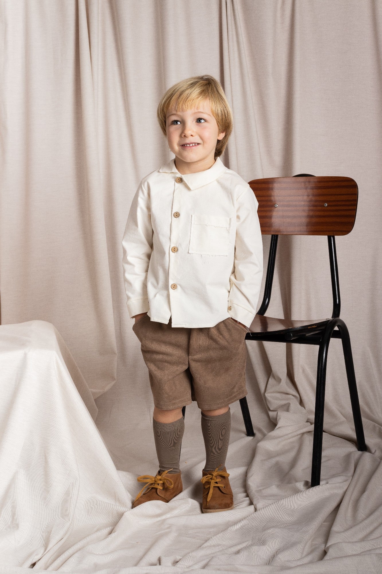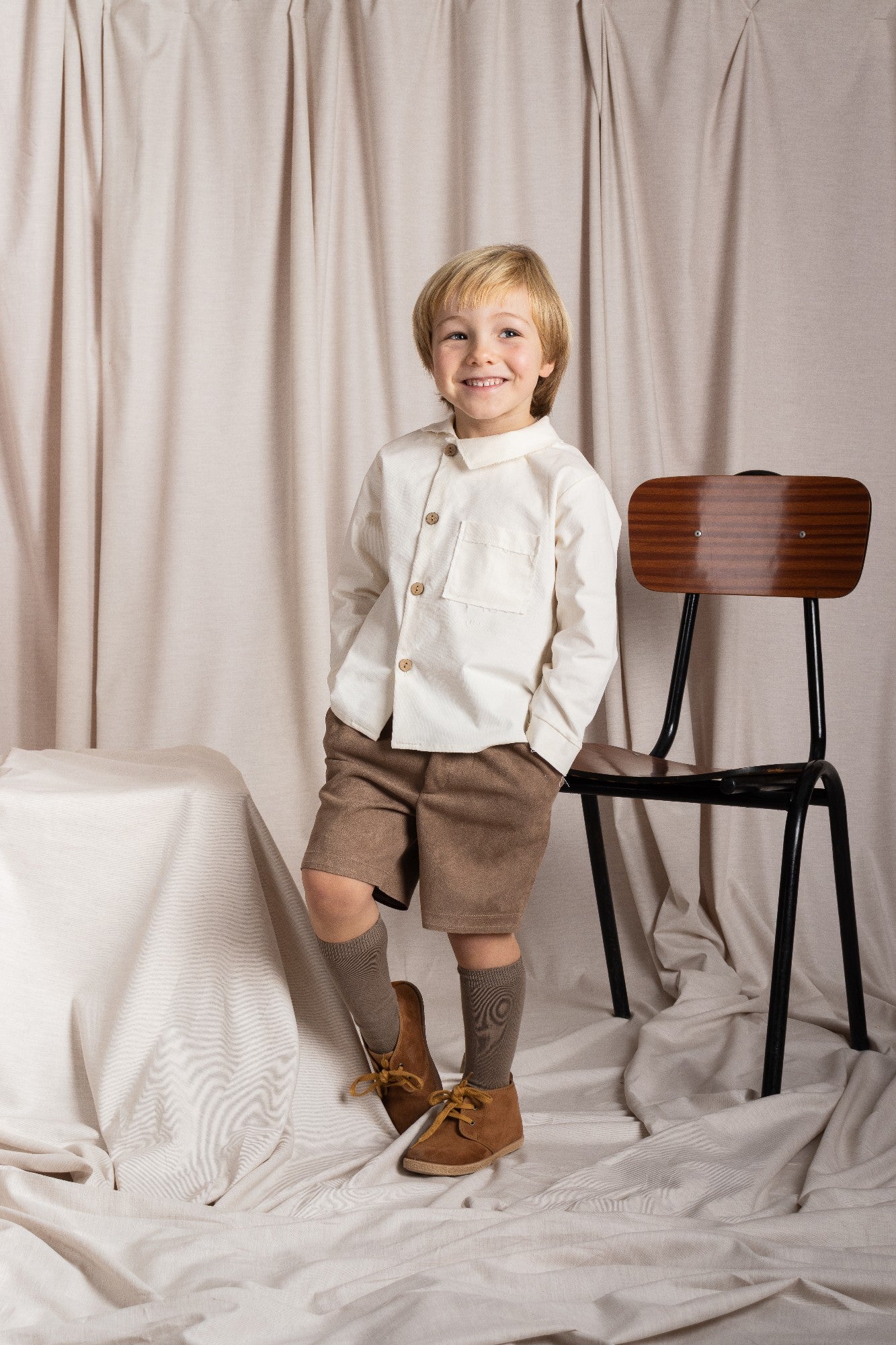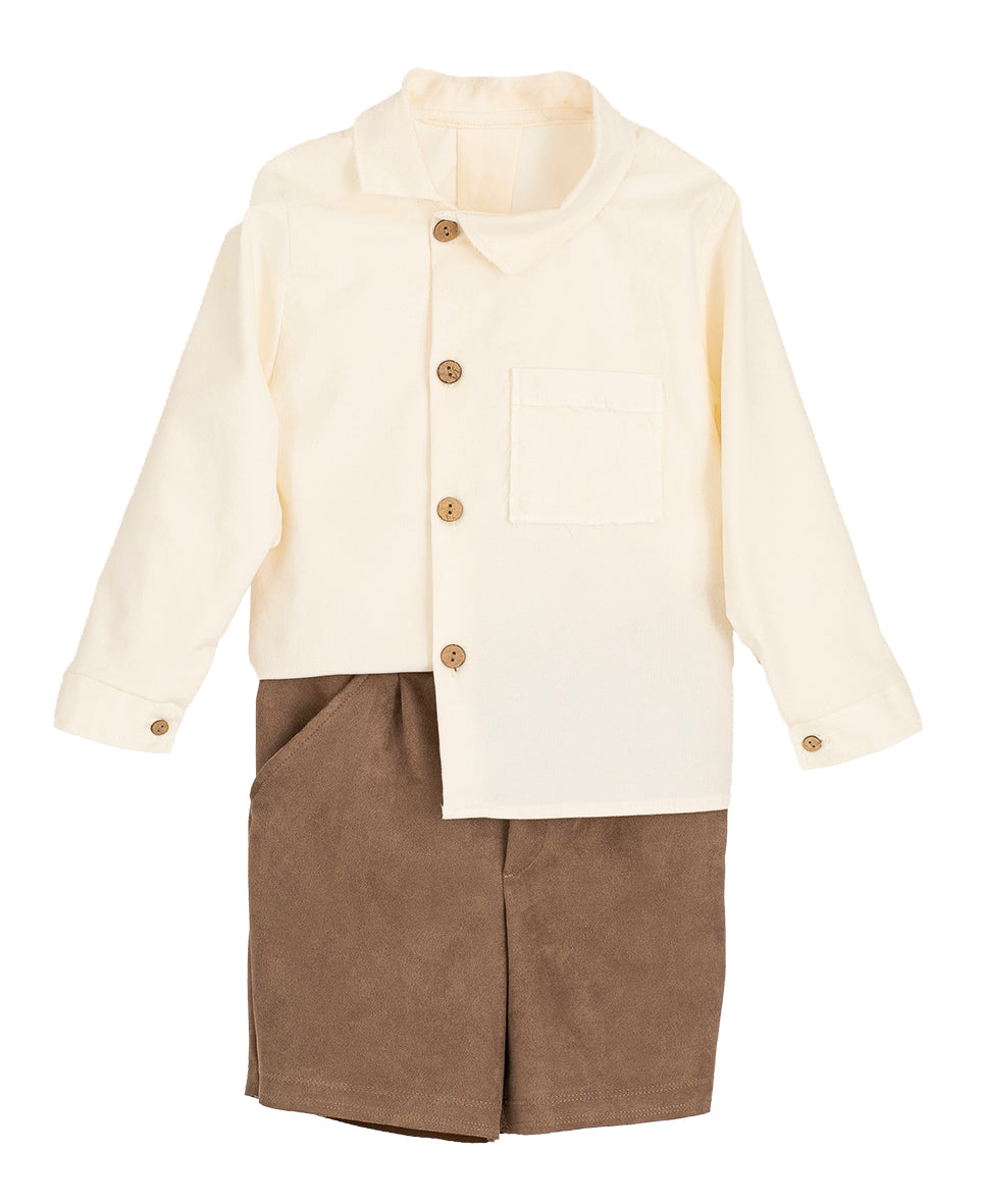 Questo completo in velluto per bambino combina una camicia a manica lunga in velluto morbido con una bermuda in scamosciato, creando un look elegante ma casual. Perfetto per occasioni speciali o per uno stile alla moda, offre comfort e raffinatezza con materiali di qualità studiati per garantire un fit comodo e una presentazione impeccabile. Un outfit versatile che unisce tradizione e tendenze contemporanee per dare un tocco distintivo al guardaroba dei più piccoli.