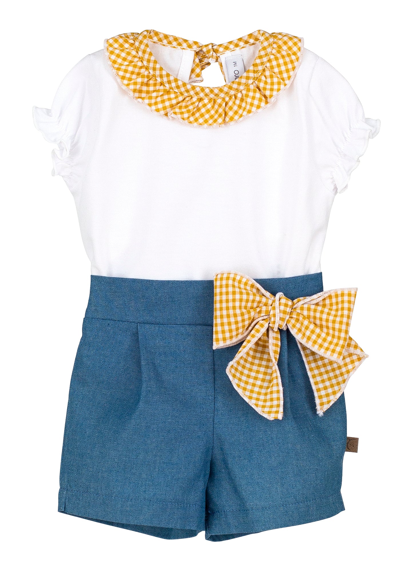 -short in cotone color denim con fiocco laterale in vichy senape