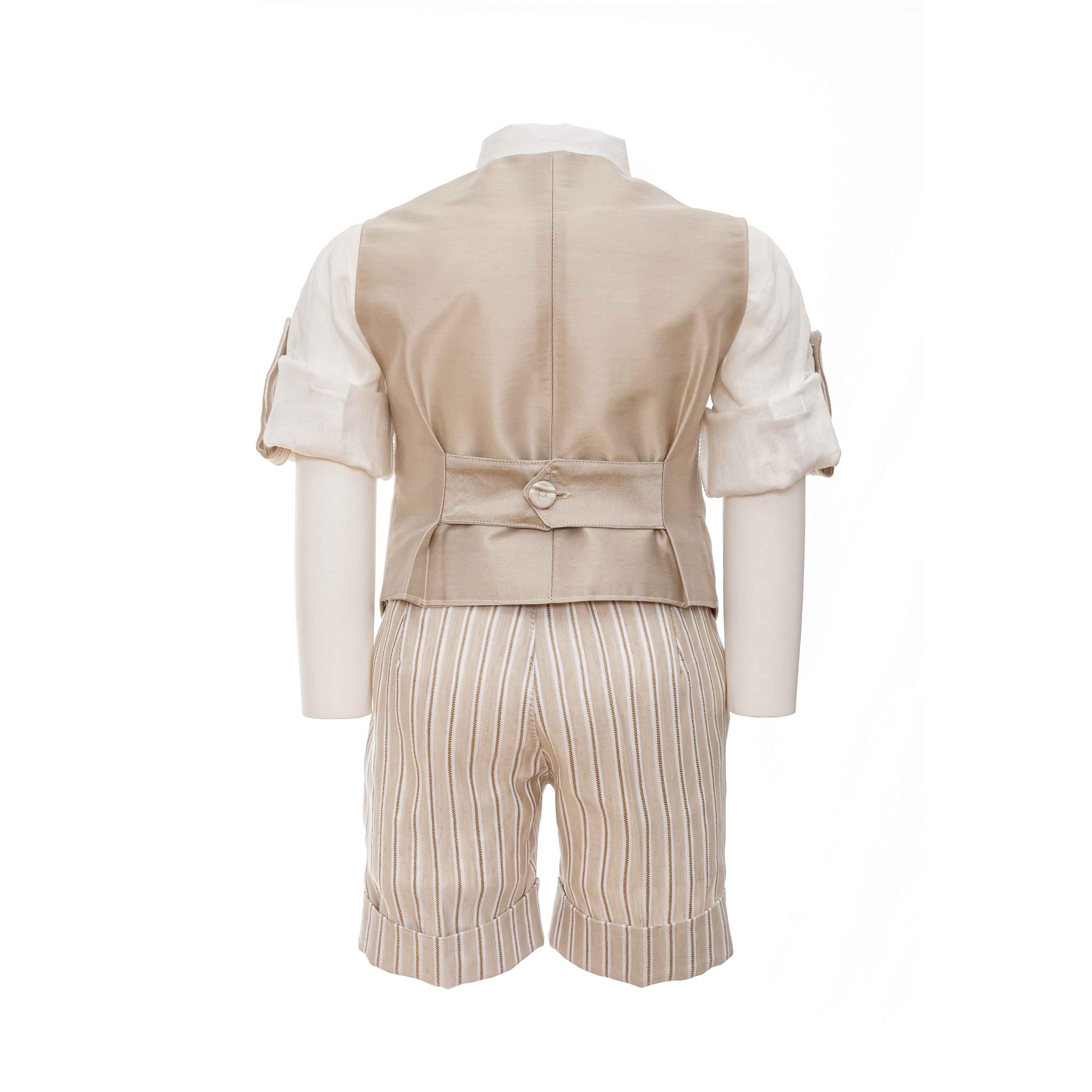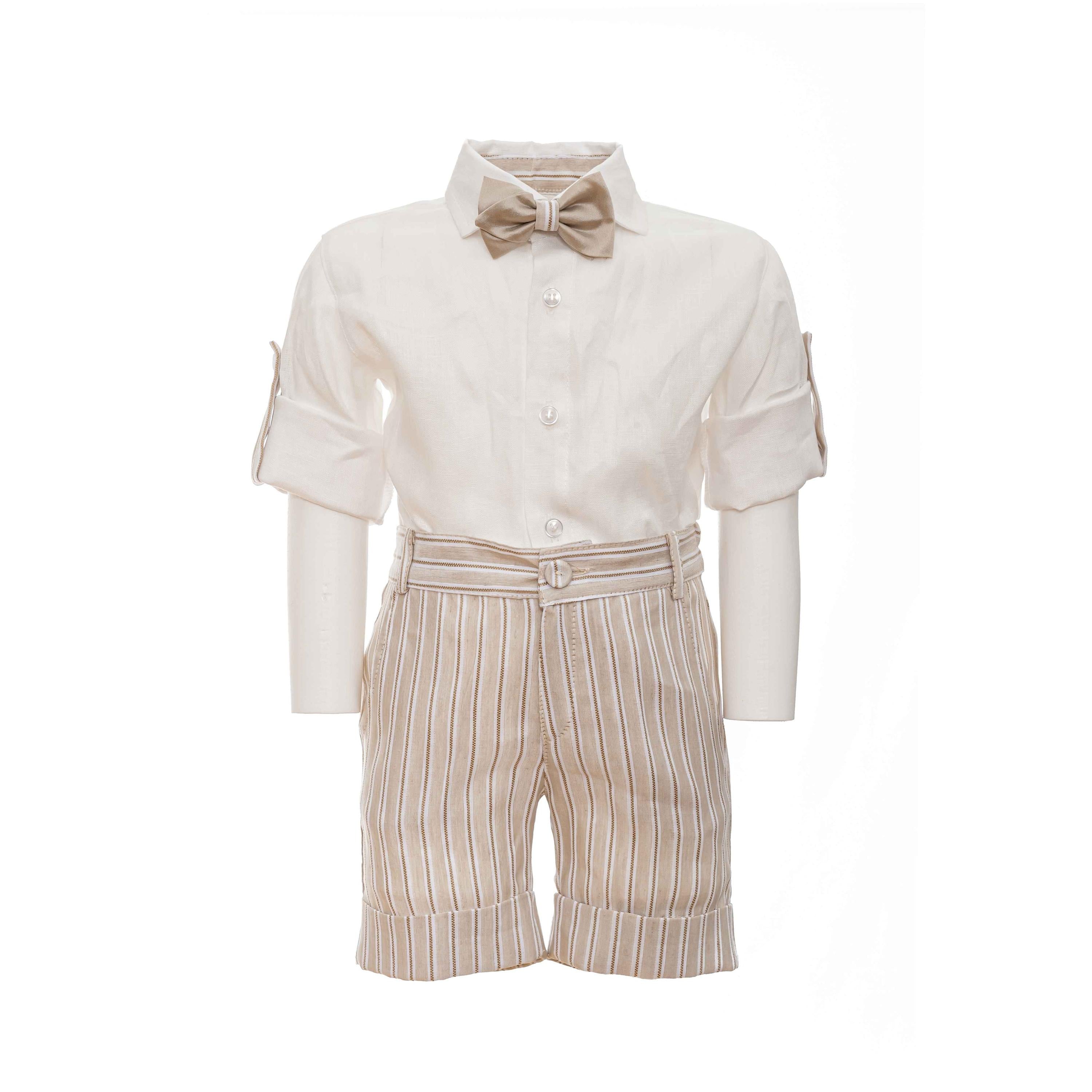 Completo quattro pezzi in misto lino, bicolore panna e beige composto da pantaloncino con piega inglese rigato, cerniera e bottoncino avanti ed elastico dietro