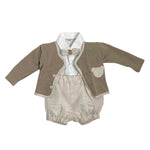 Cardigan in cotone di un beige scuro e alcuni dettagli di bottoncini sul davanti per l'apertura e sul contorno di essa in beige chiaro. Riprende i colori del papillon. Un bellissimo disegno di un orsacchiotto sulla parte sinistra del cardigan
