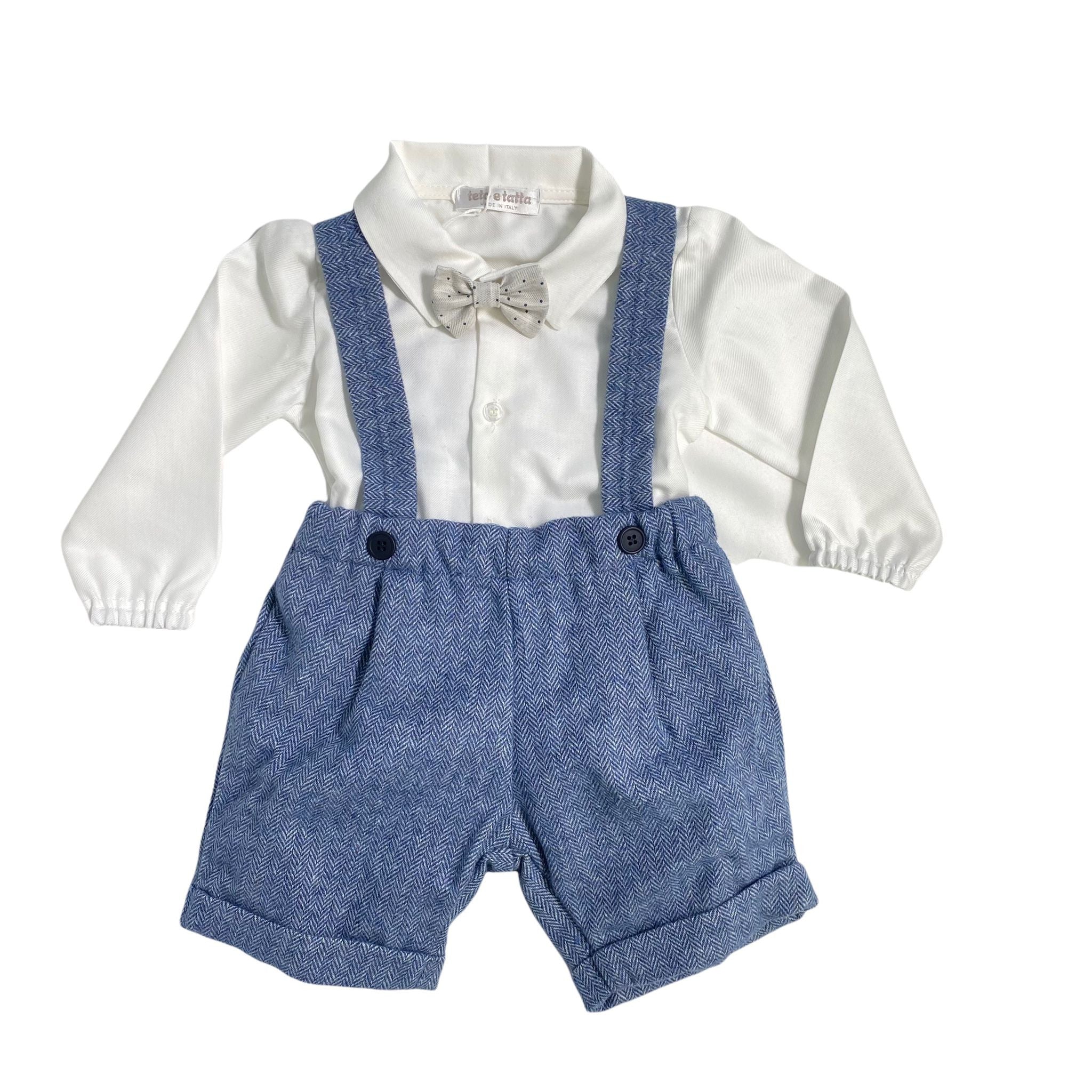 Completo con salopette blu, camicia maniche lunghe con elastico al polso e papillon.