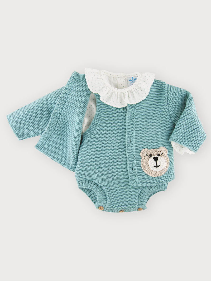 Questo completo tre pezzi in tessuto anallergico è composto da un pagliaccetto, una camicia con collo volant in cotone con stampa poise e un cardigan con bottoncini in legno. Perfetto per l'uscita clinica, è alla moda e garantisce comfort e sicurezza per il neonato.