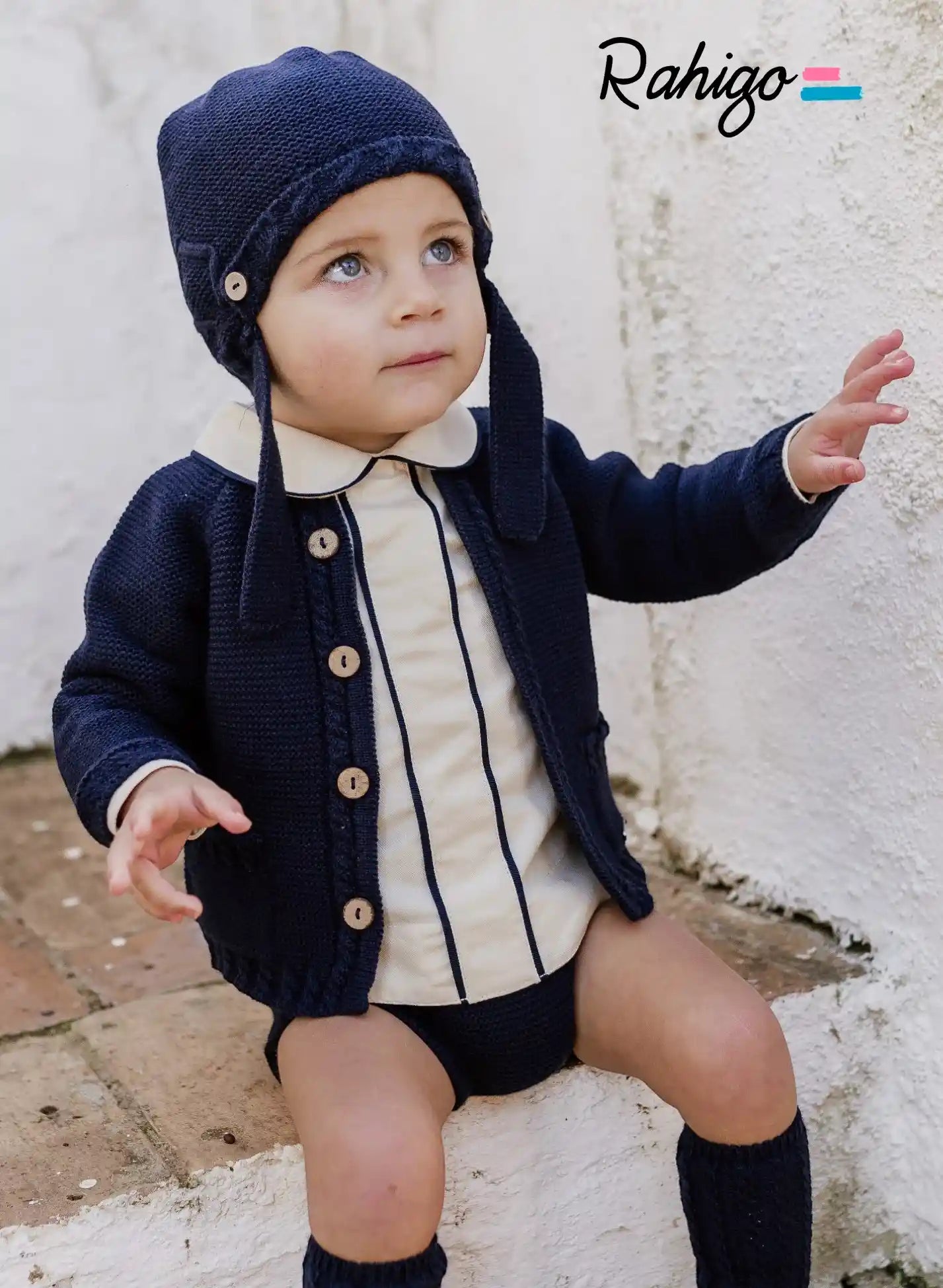 Ricco e versatile, il completo tre pezzi in tessuto anallergico RAHIGO è fatto di culotte, camicia in cotone e cardigan tinta unita. Elegantemente alla moda, garantisce una calda protezione per neonati.