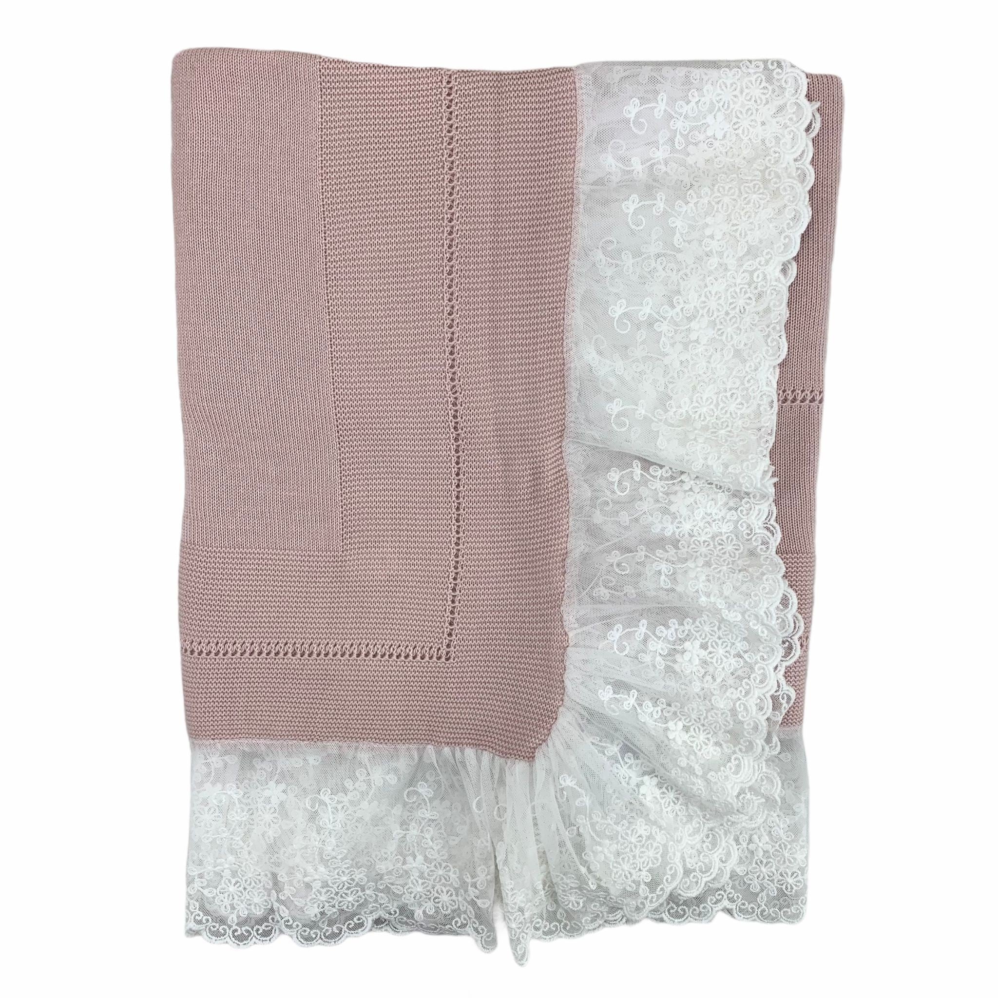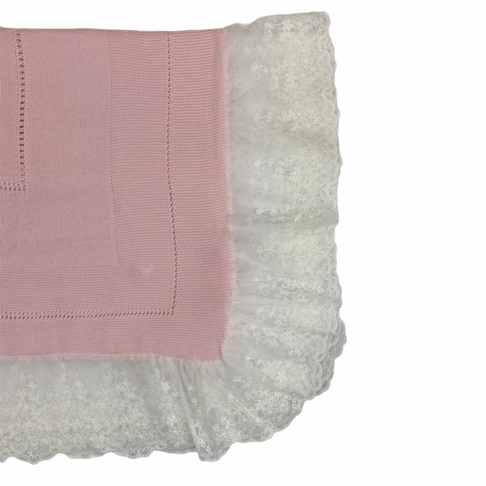 Coperta corredino in filo di cotone con traforature e bordatura con pizzo.