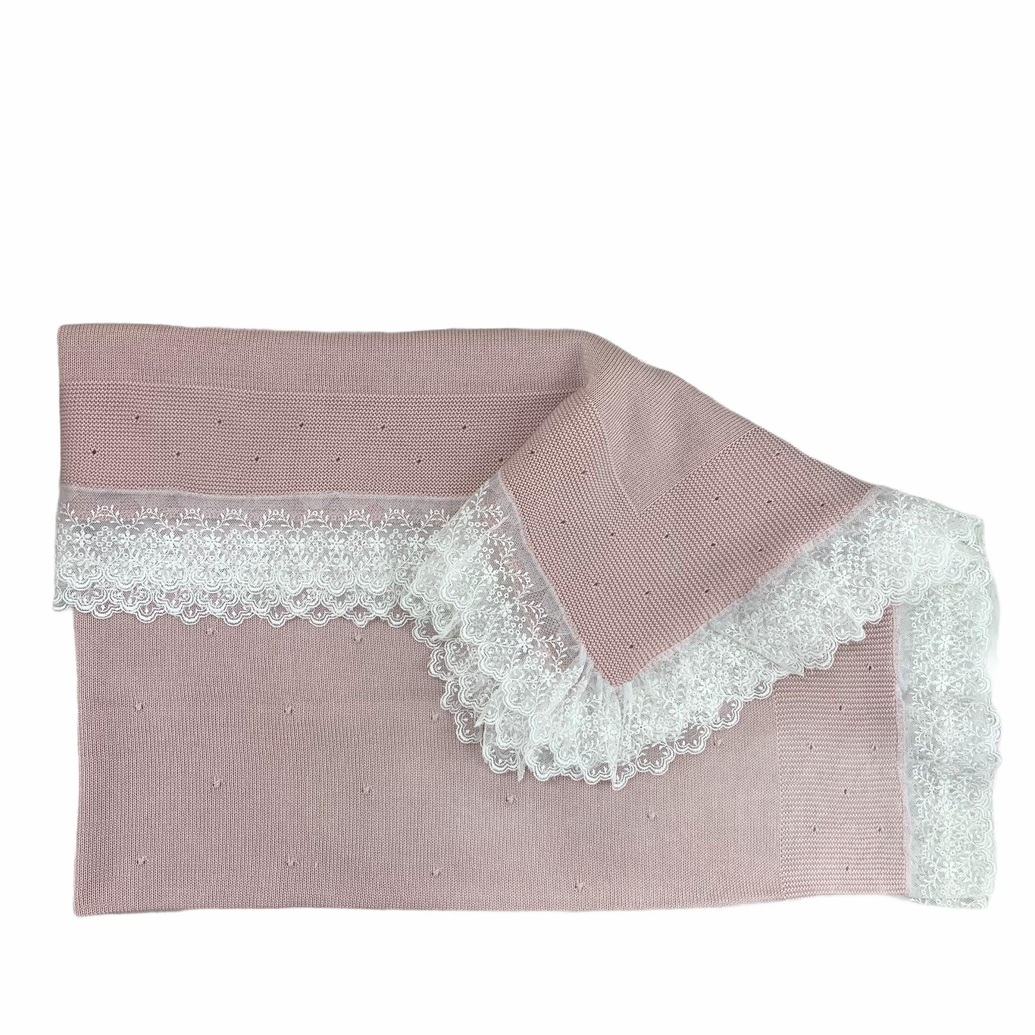 Coperta corredino in filo di cotone con pois in rilievo e bordatura in pizzo bianco.