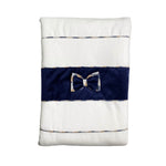 Copertina imbottita in ciniglia, in tinta unita panna, con fascia centrale blu e fiocco sul davanti.