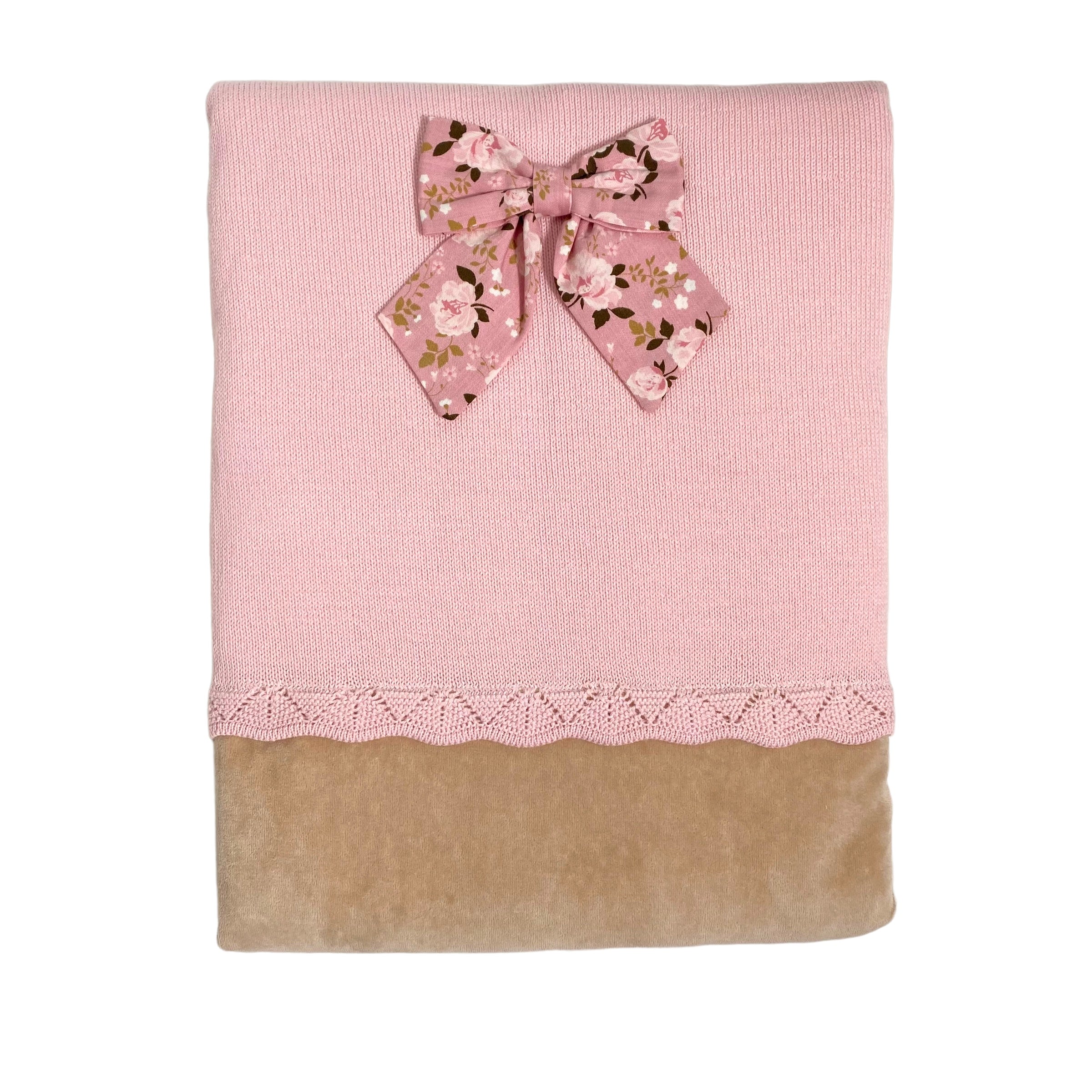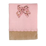 Coperta imbottita sfoderabile in ciniglia beige e lana rosa, con fioccone centrale in tessuto floreale.