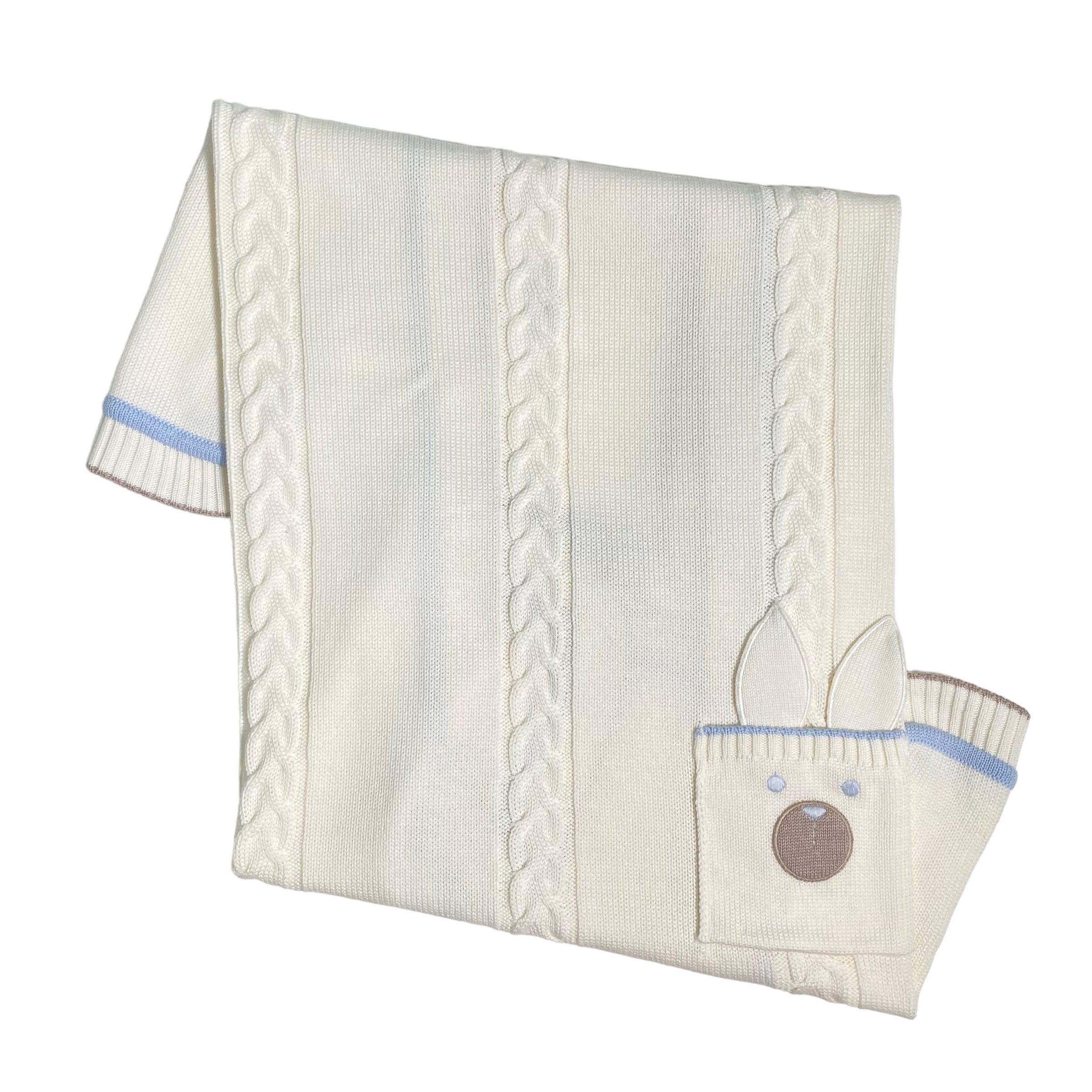 Coperta in pura lana 100%, in tinta unita panna, con trecce e taschino a forma di coniglietto.