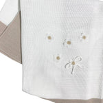 Coperta scialle in filo di cotone, bianca con fasce beige e ricamo di cuore centrale.
