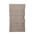 Copertina scialle in filo di cotone, in tinta unita beige, con lavorazione di trecce centrali con impunture blu.