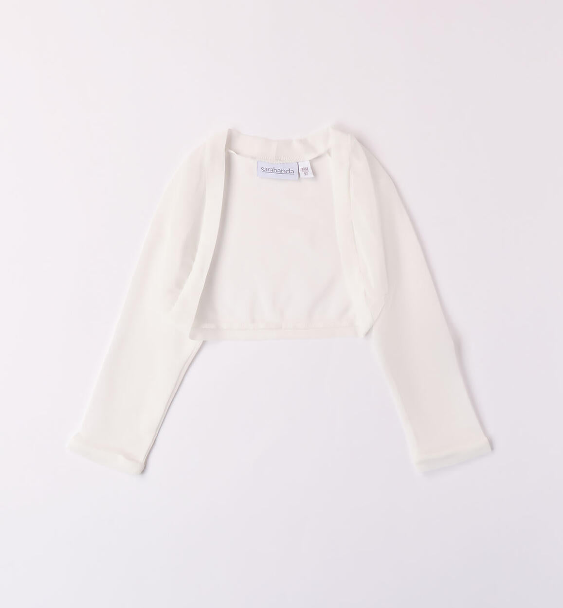 Coprispalle cerimonia bambina Sarabanda realizzato in morbido tessuto trasparente. Vestibilità crop. L'articolo fa parte della collezione S Premium Sarabanda pensata per vestire le cerimonie più formali delle bambine