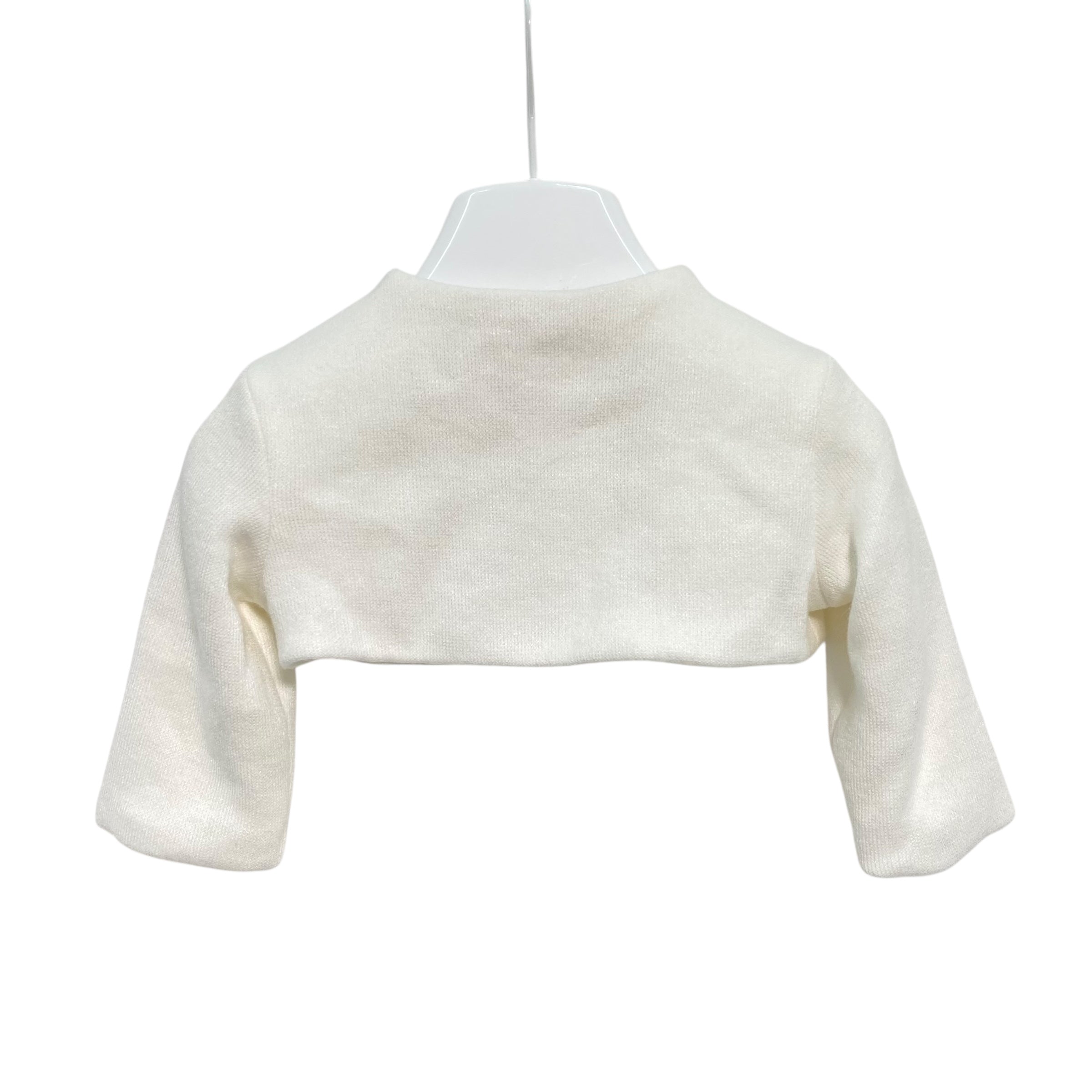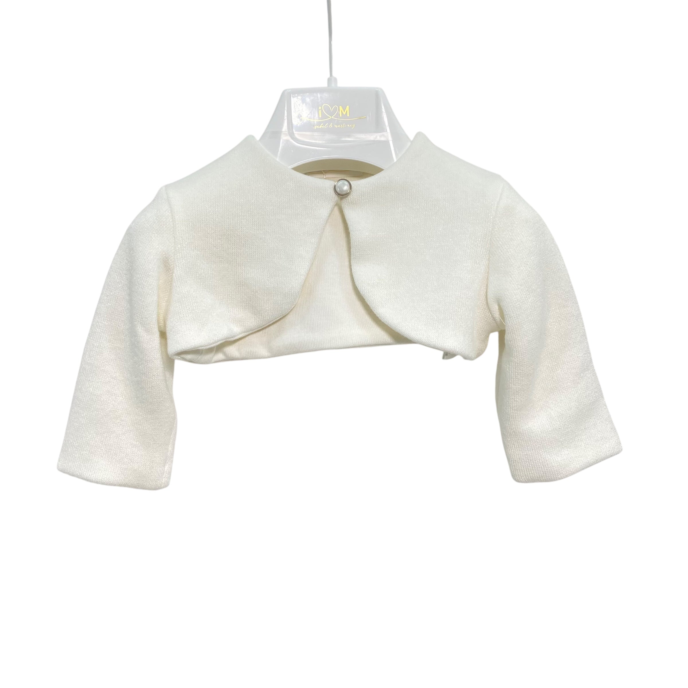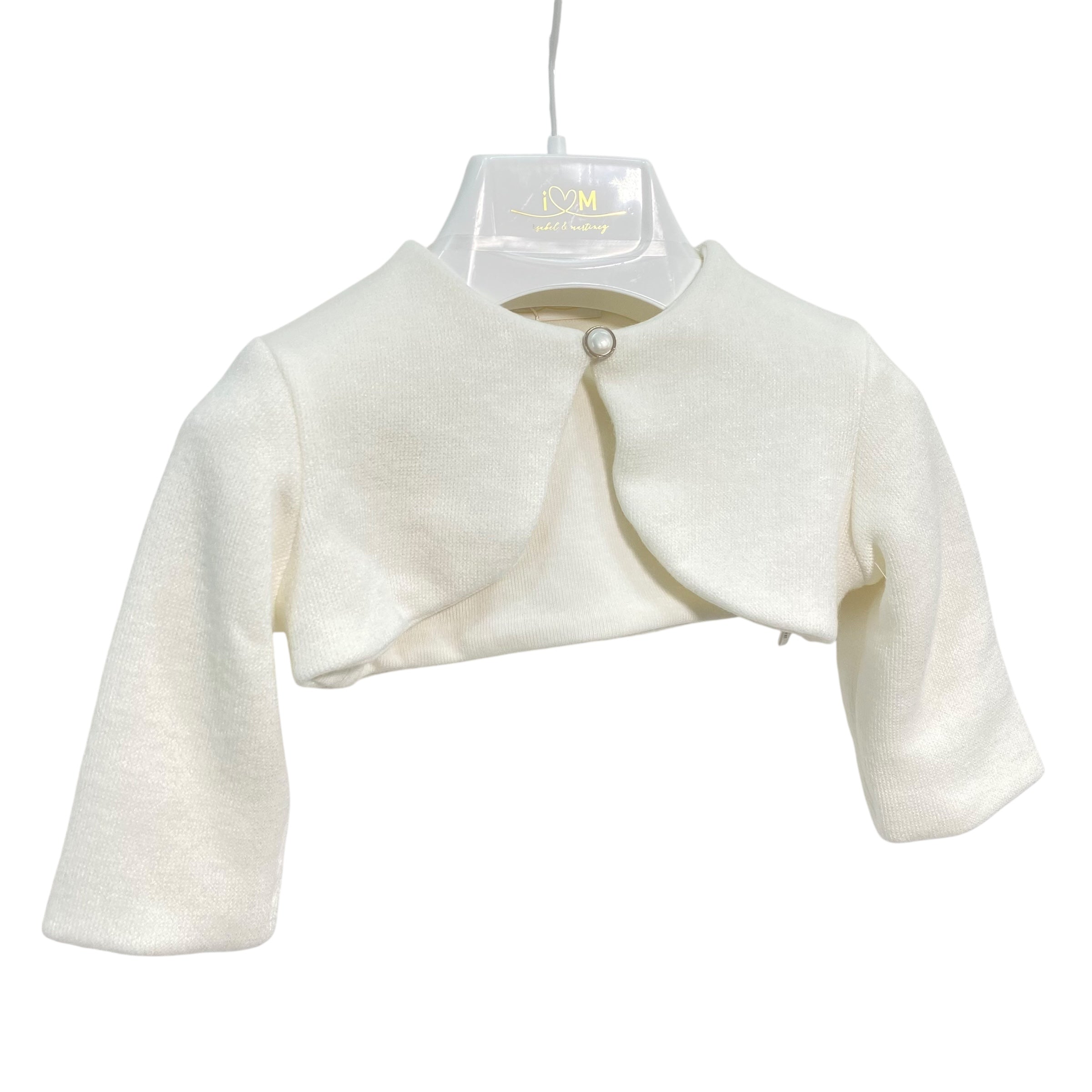 Questo coprispalle in caldo cotone doppio offre comfort e calore ideali per neonate. Dotato di chiusura con bottone in madreperla, aggiunge un tocco di eleganza raffinata a qualsiasi outfit. Perfetto per completare look eleganti e di tendenza, è anche pratico e confortevole per un uso quotidiano.