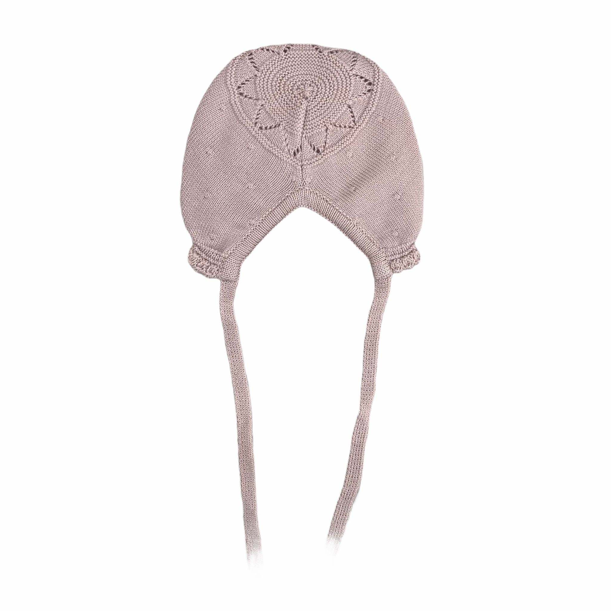 Cuffia in filo di cotone traforato con pois in rilievo. Chiusura con laccetti.