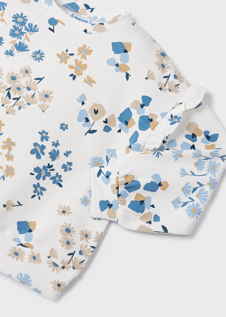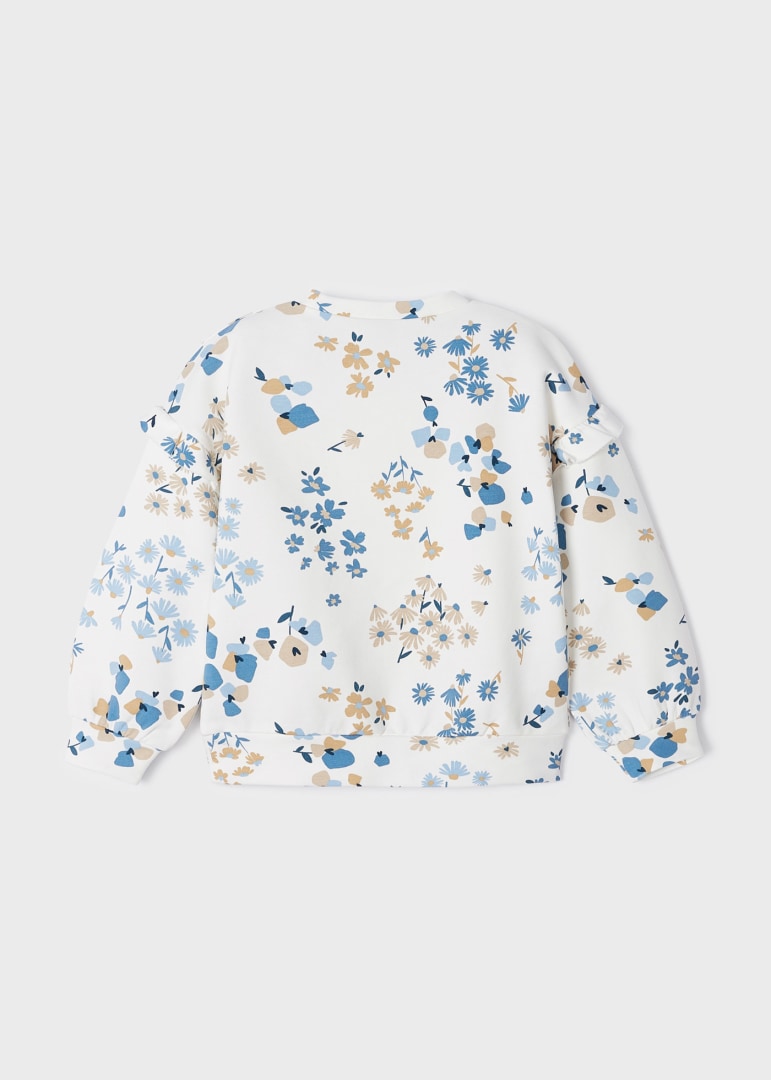 Felpa manica lunga per bambina con volant sulle spalle. Girocollo. Stampa con decorazione floreale.