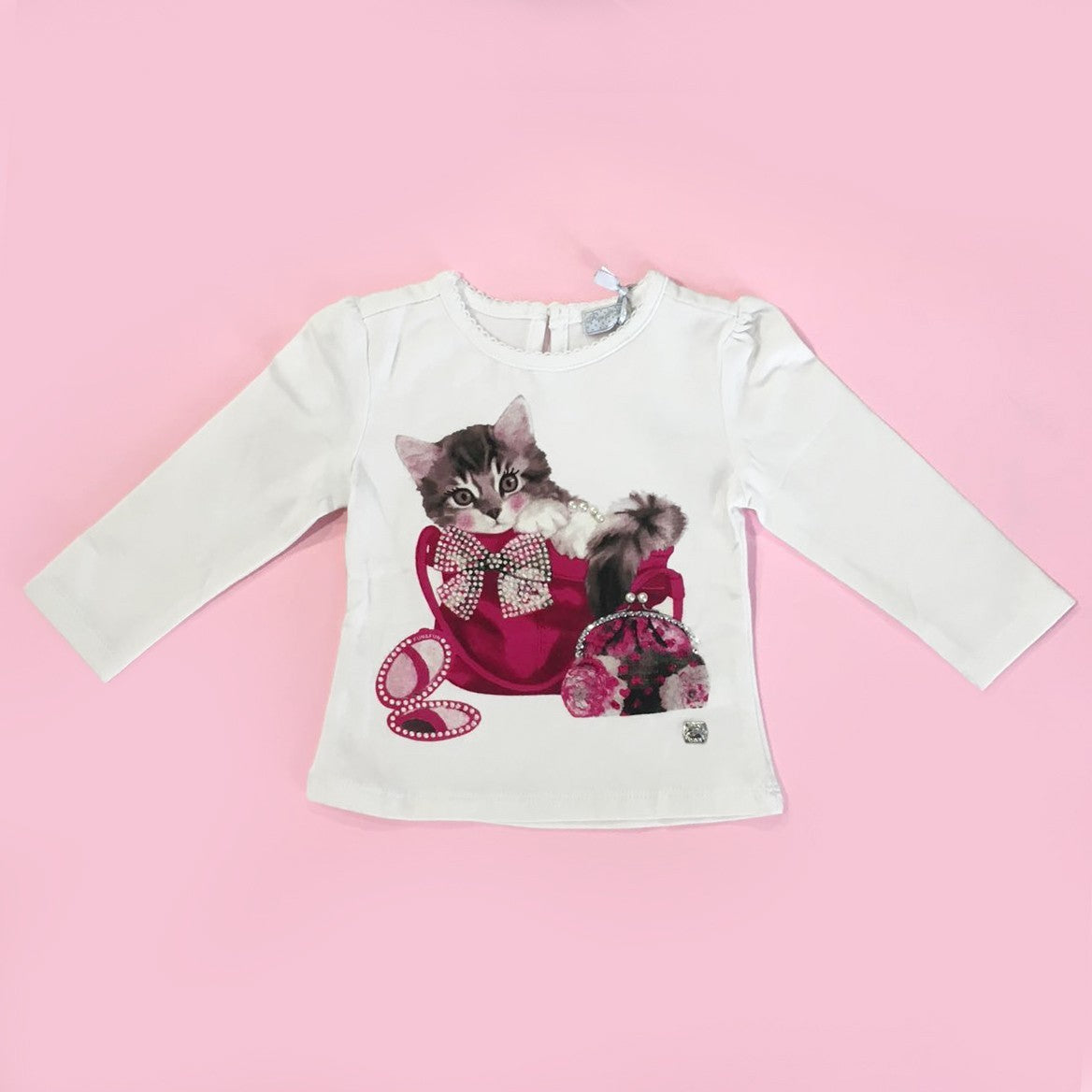-Girocollo in caldo cotone bianco in tinta unita con stampa gattino sul davanti ed applicazioni di strass
