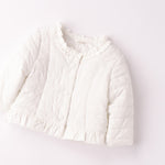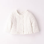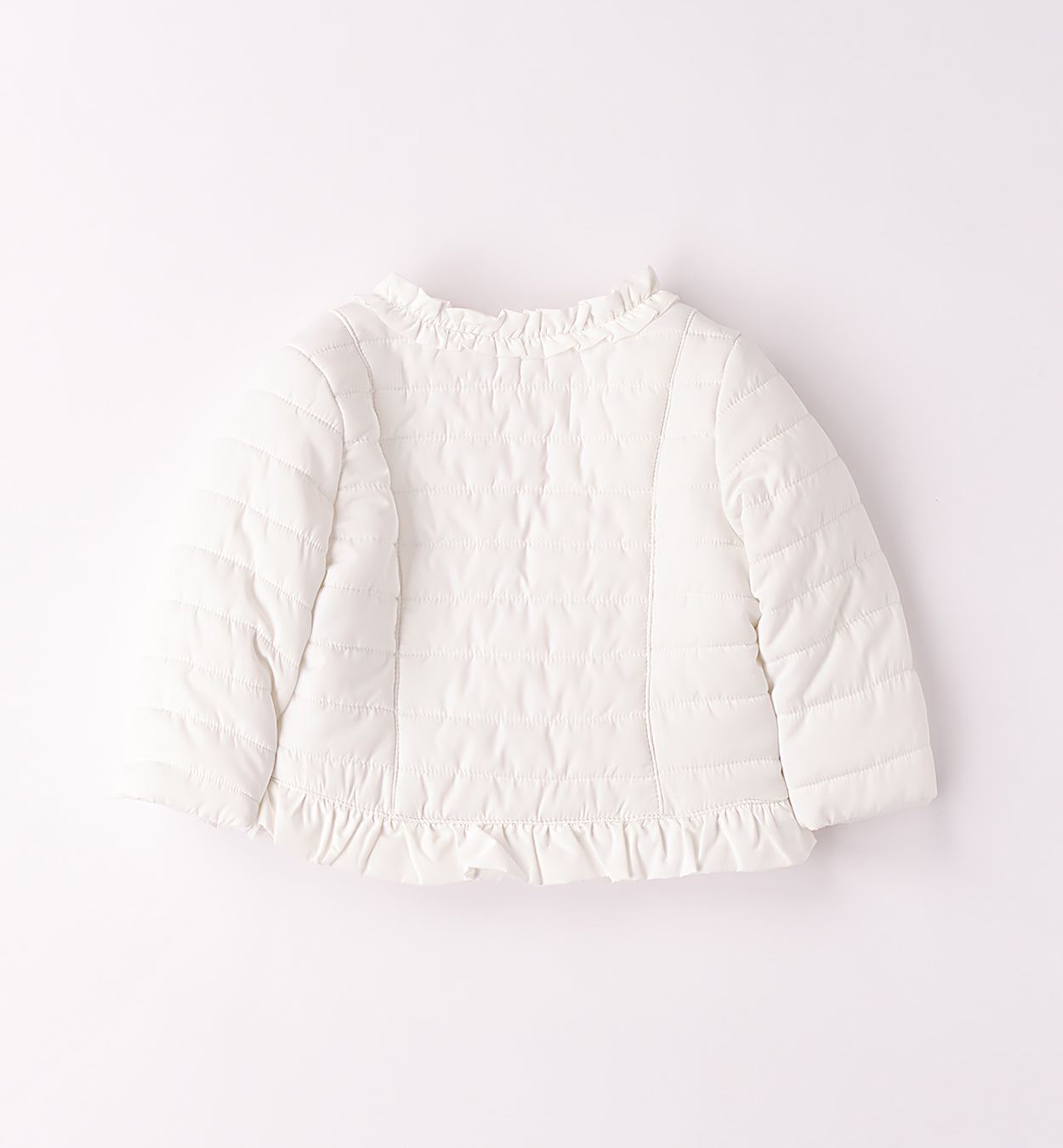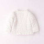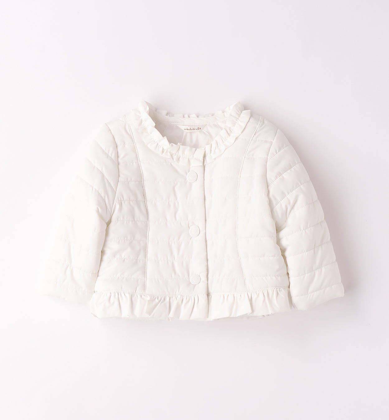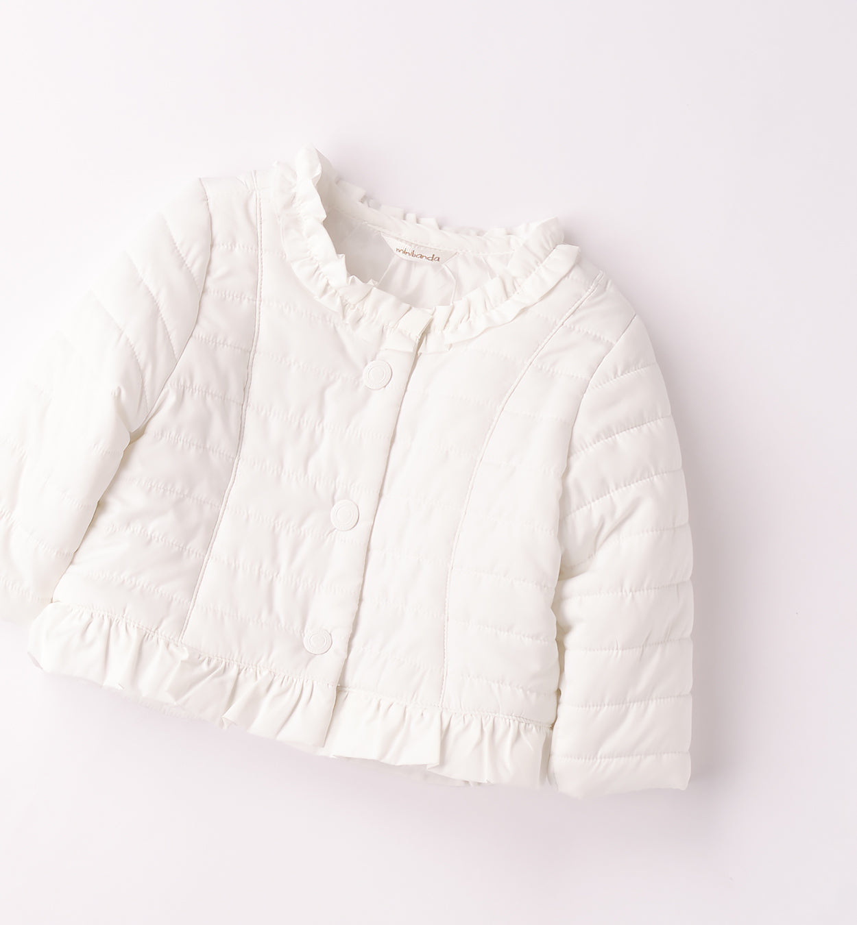 Giacchetto bimba Minibanda con imbottitura in ovatta. Il modello è in fantasia tinta unita e presenta apertura con bottoni. Il prodotto non contiene materiali di derivazione animale. E' il must-have per le bambine più alla moda. Con la sua chiusura a bottoni a pressione e le rouches sul girocollo e sul fondo, garantisce comfort e stile. Foderato internamente per tenere al caldo, è ideale per ogni occasione.