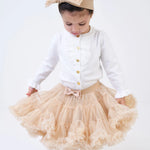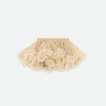 Iconico tutù Angel's Face per neonati, color sabbia con glitter oro. La gonna è raccolta in una morbida fascia elastica in vita, completamente foderata in un confortevole misto cotone. Strati di morbido tulle e volant creano volume e movimento, completati dal nostro caratteristico fiocco in vita.