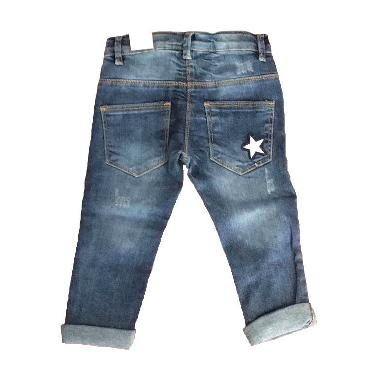 Jeans modello slim effetto strappato sulle gambe, ricamo stella sula tasca retro ed elastic in vita che permette di regolare la vestibilità