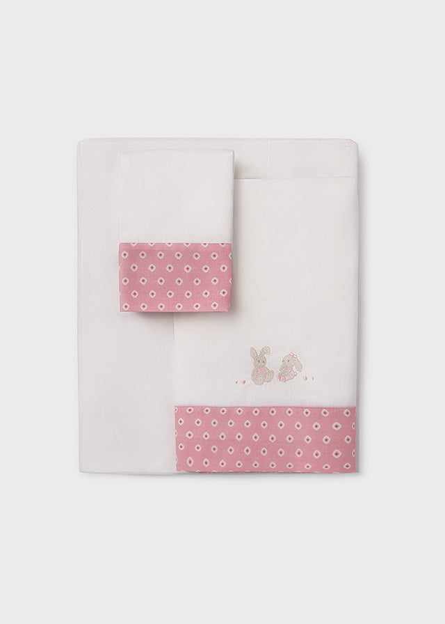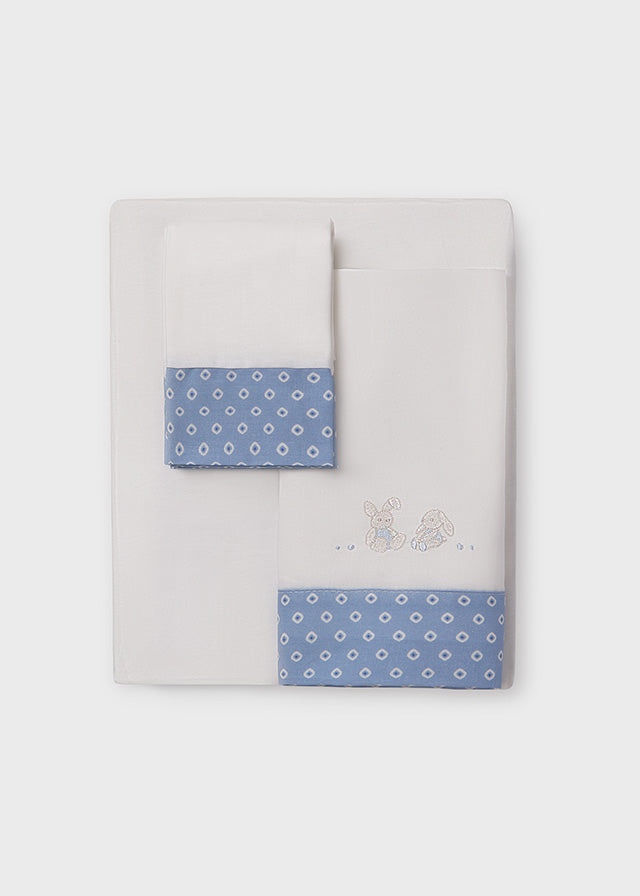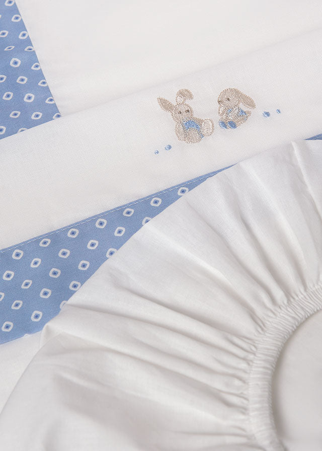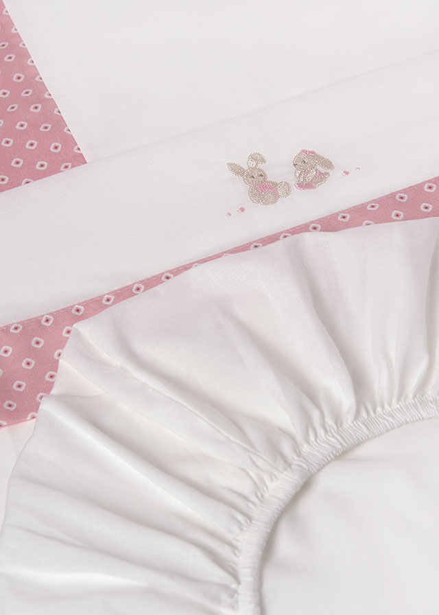 Delicato coordinato lenzuola per la carrozzina del tuo/a piccolo/a. Costituito da lenzuolo inferiore con angoli, lenzuolo superiore e federa.