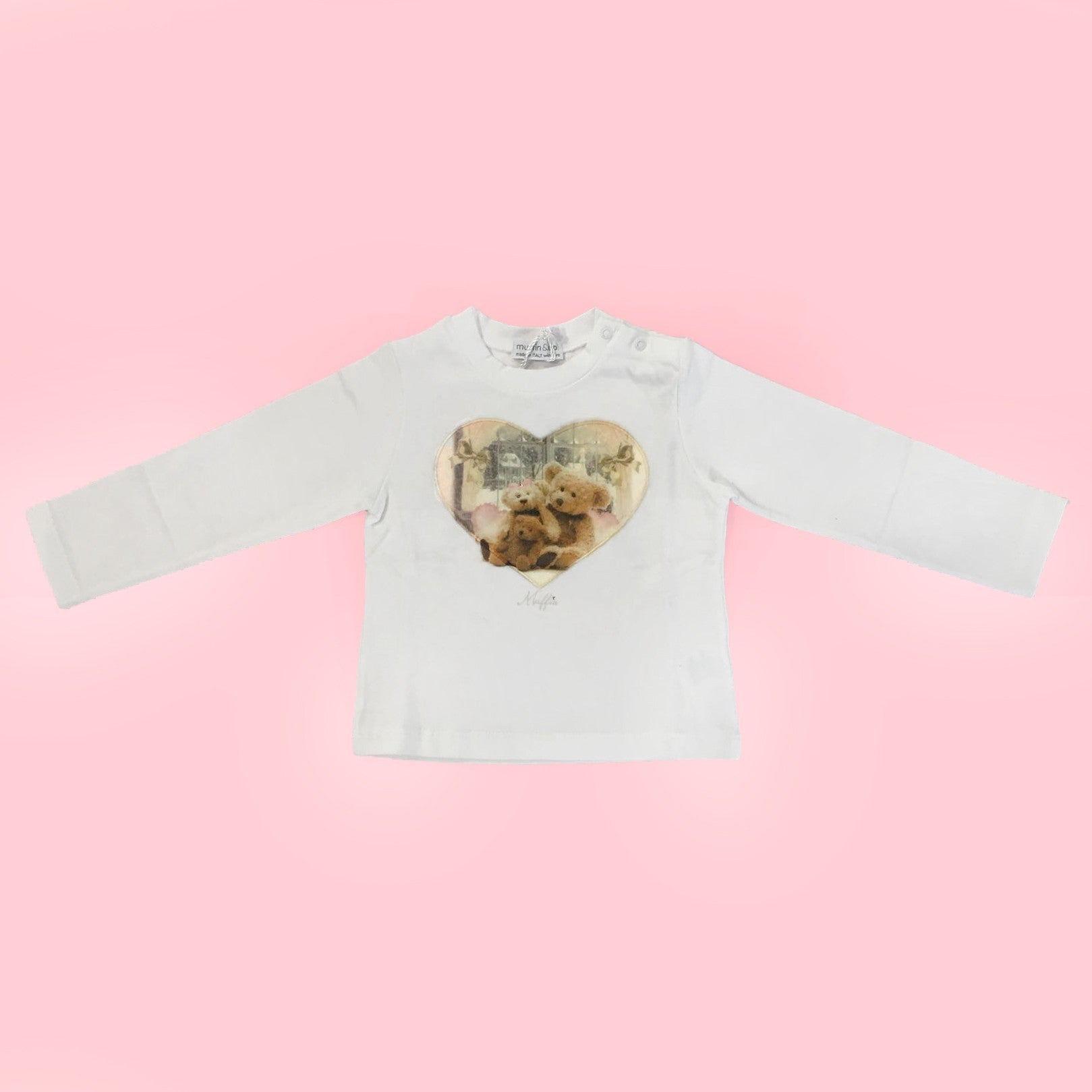 -Girocollo in caldo cotone bianco in tinta unita con stampa e ricamo orsetti sul petto