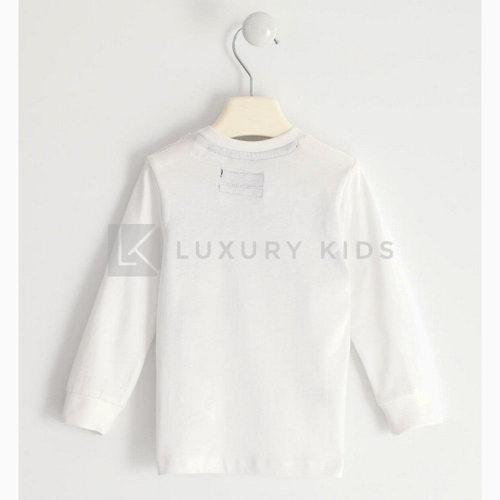Maglia manica lunga in cotone con stampa blu sul davanti.