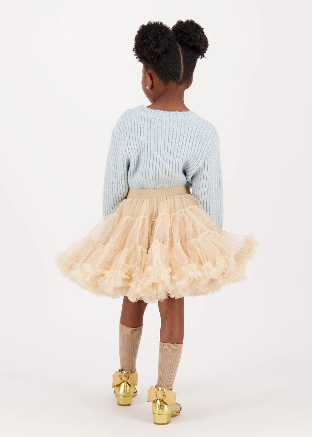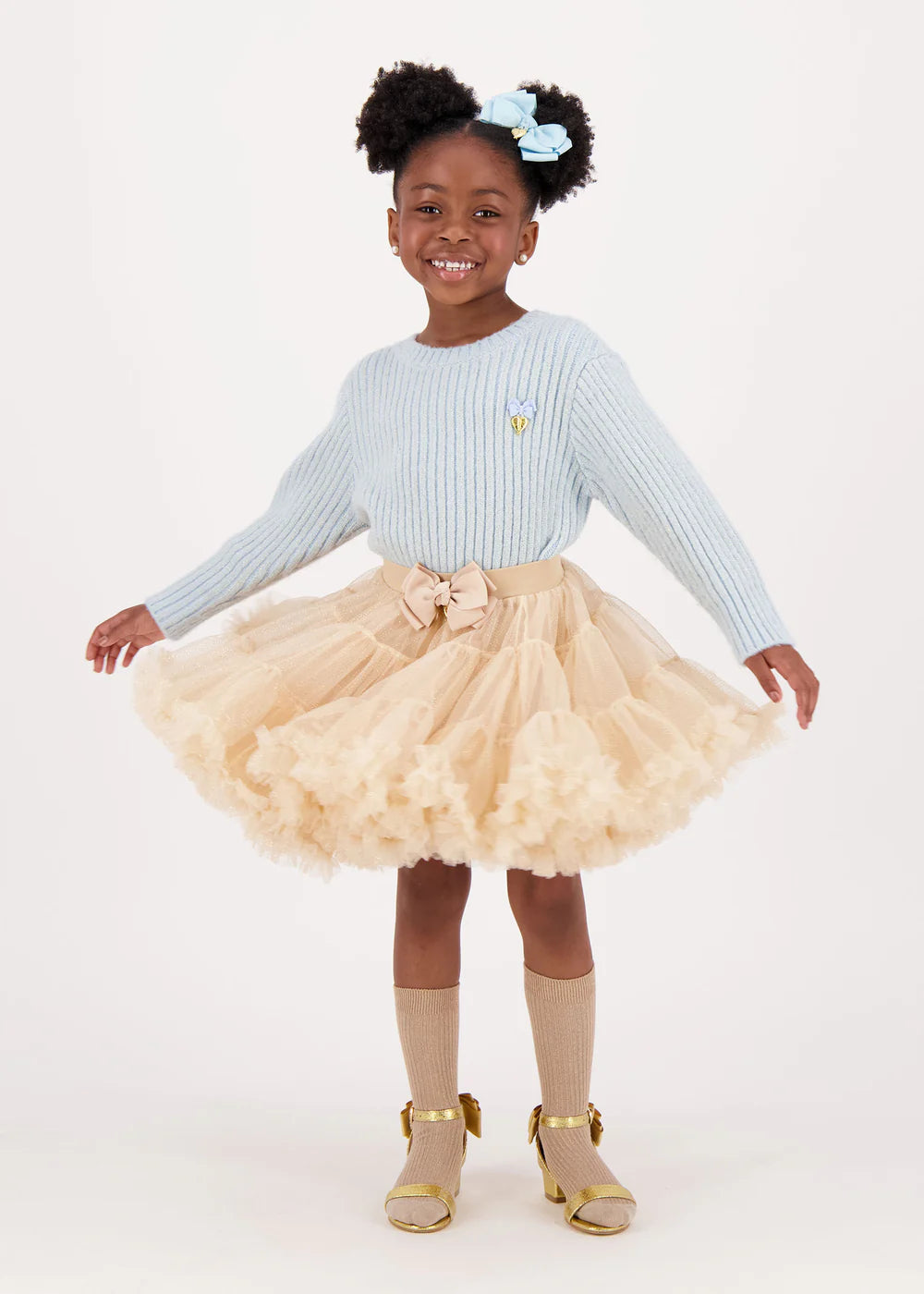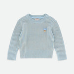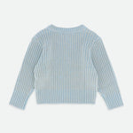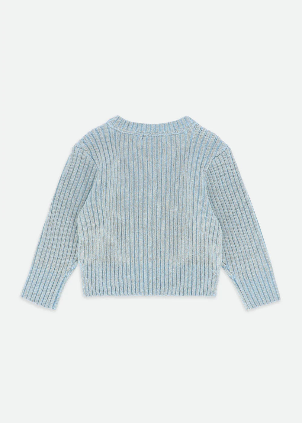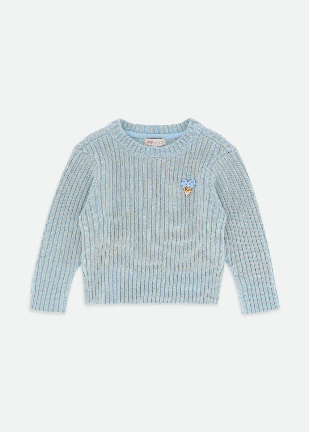 Maglione a coste per bambina lavorato a trecce. Questo maglione è realizzato con la maglia grossa più morbida in blu e presenta un tocco di brillantezza. Dettagliato con il nostro caratteristico fiocco e un ciondolo a cuore dorato sul petto.