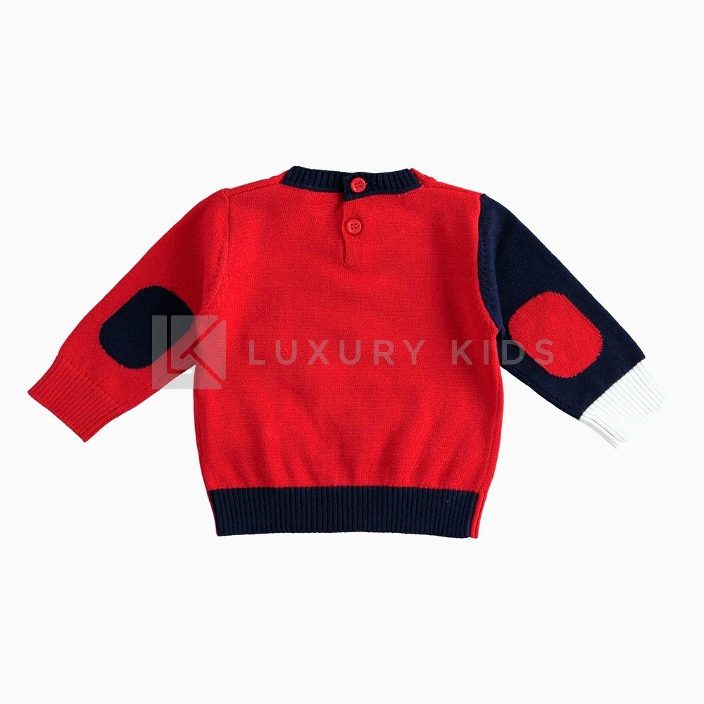 Maglione tricot girocollo per neonato in tessuto 100% cotone con giochi di block color e lavorazione a intarsio a forma di cagnolino davanti