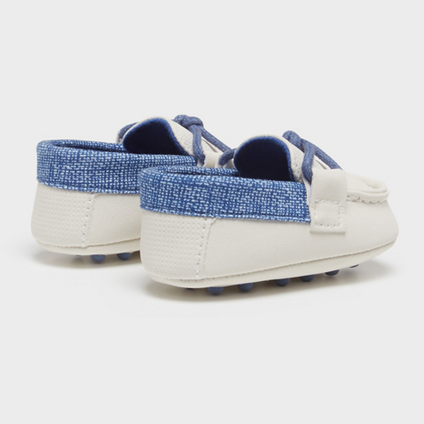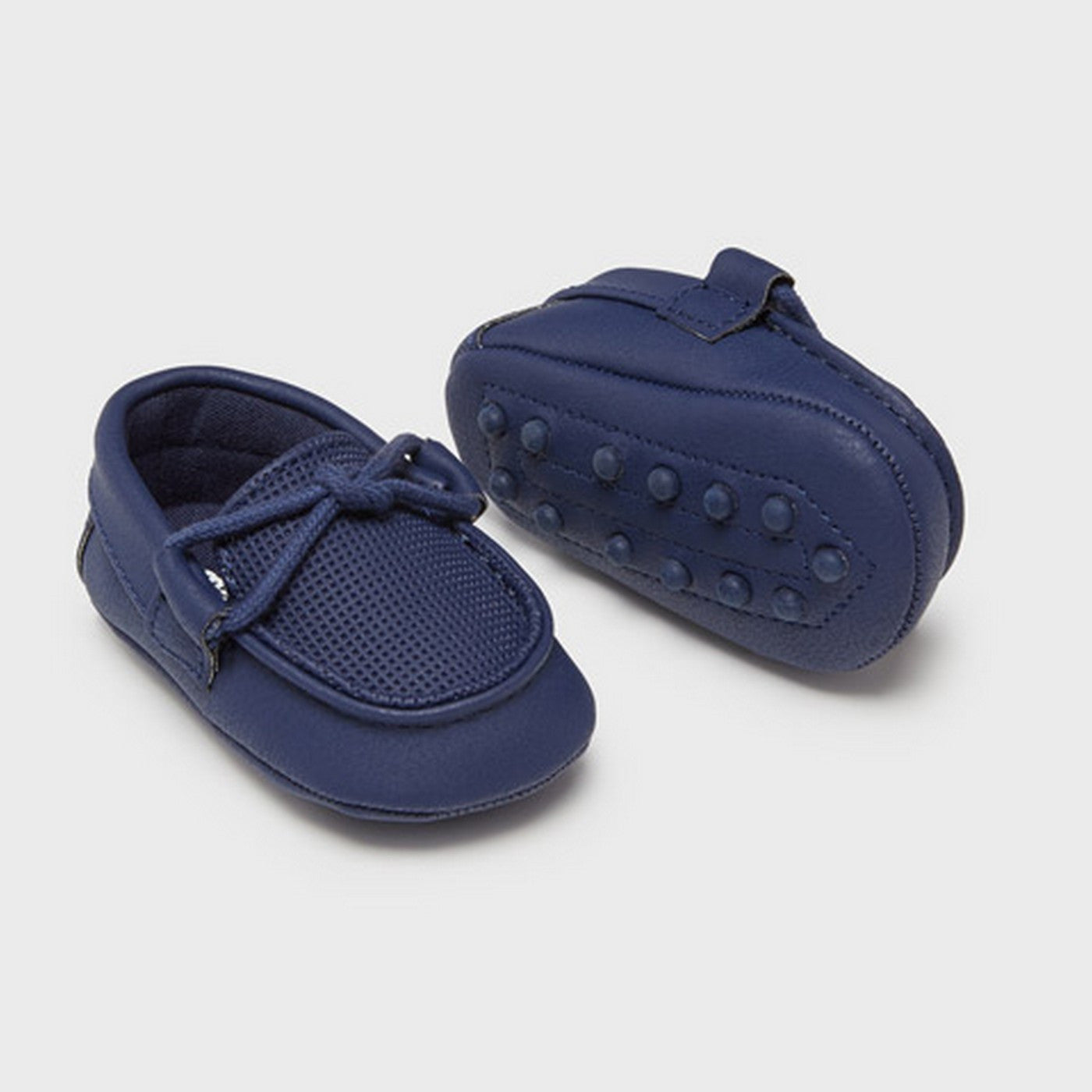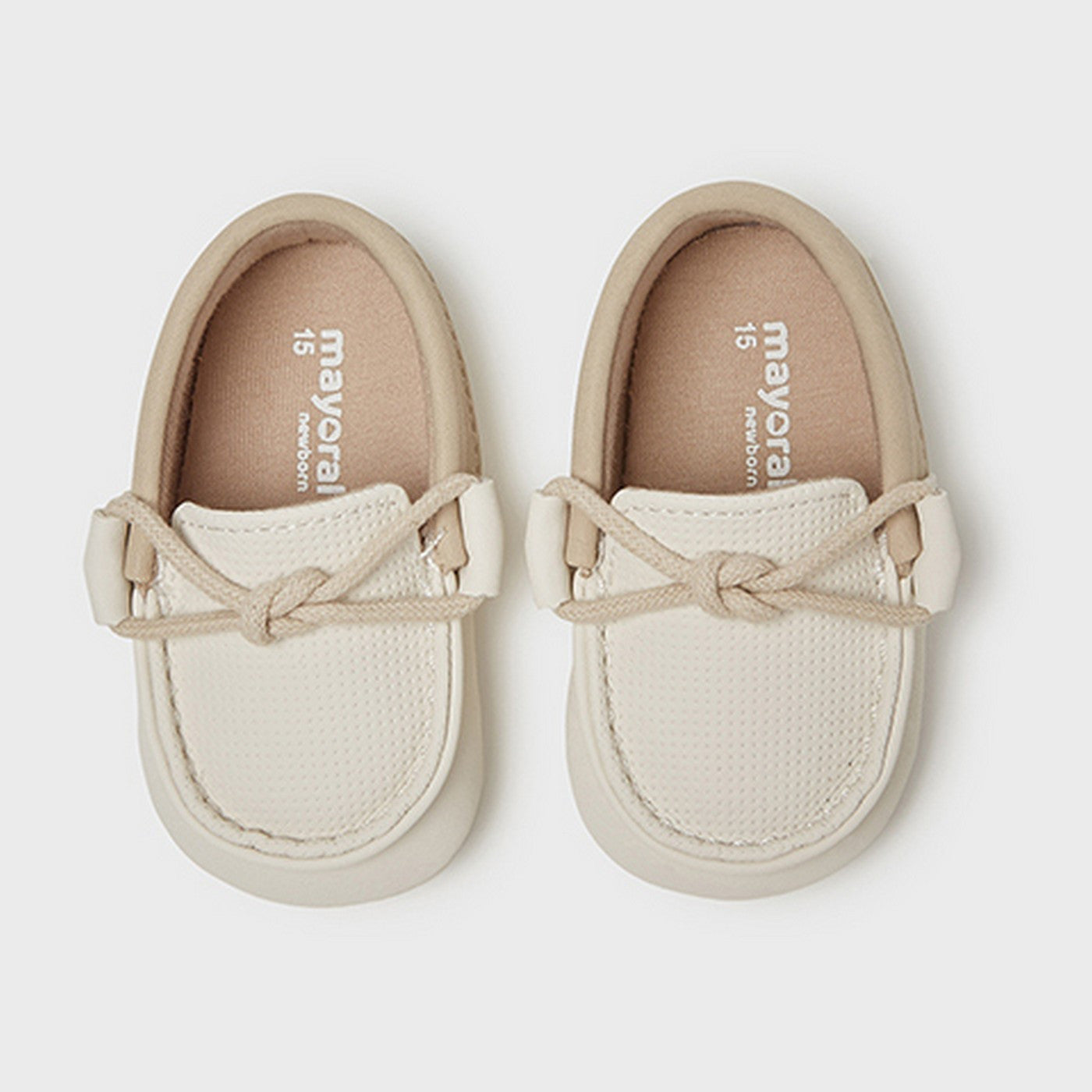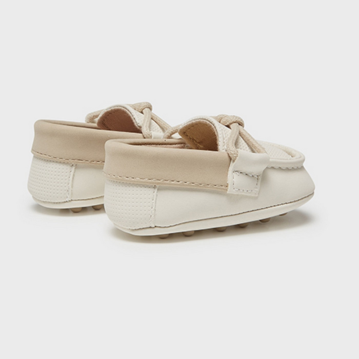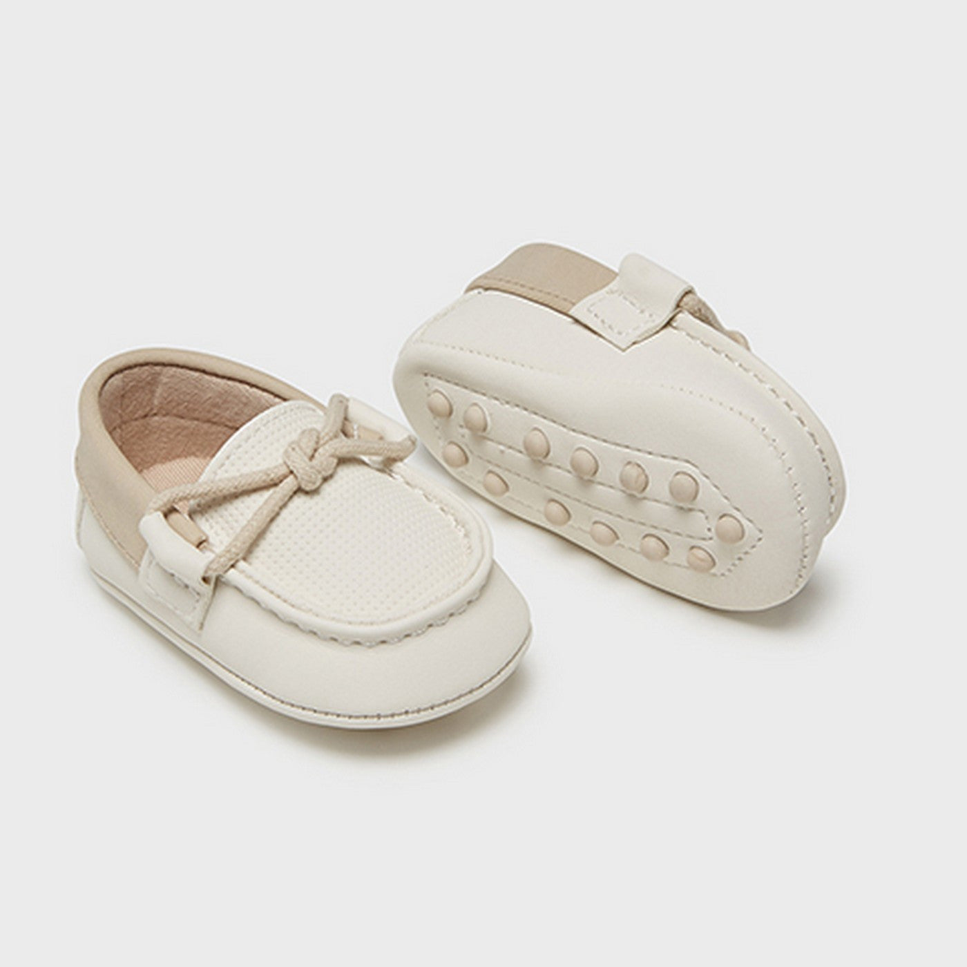 Mocassini culla in ecopelle con laccetto in corda sulla parte superiore e gommini sottostanti.