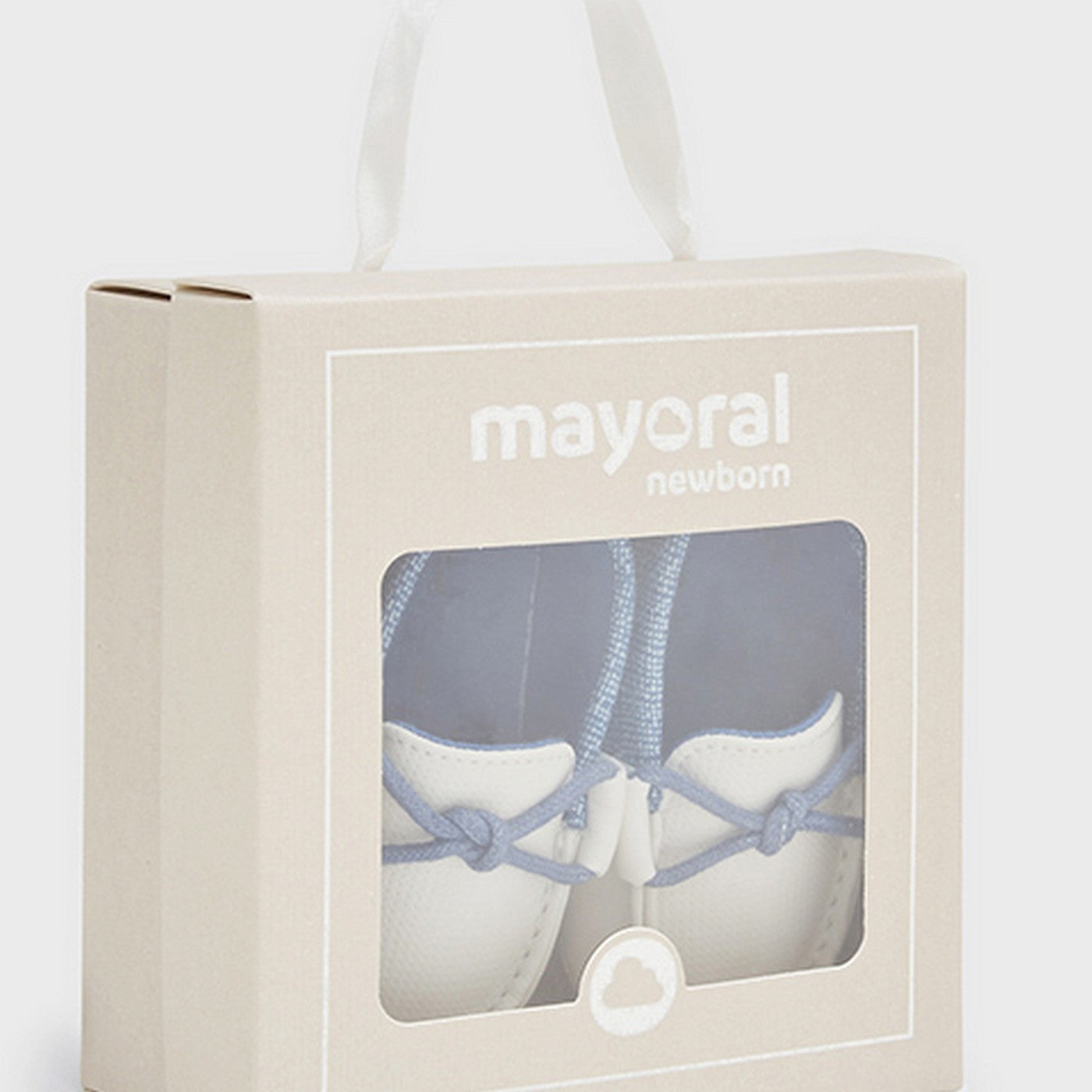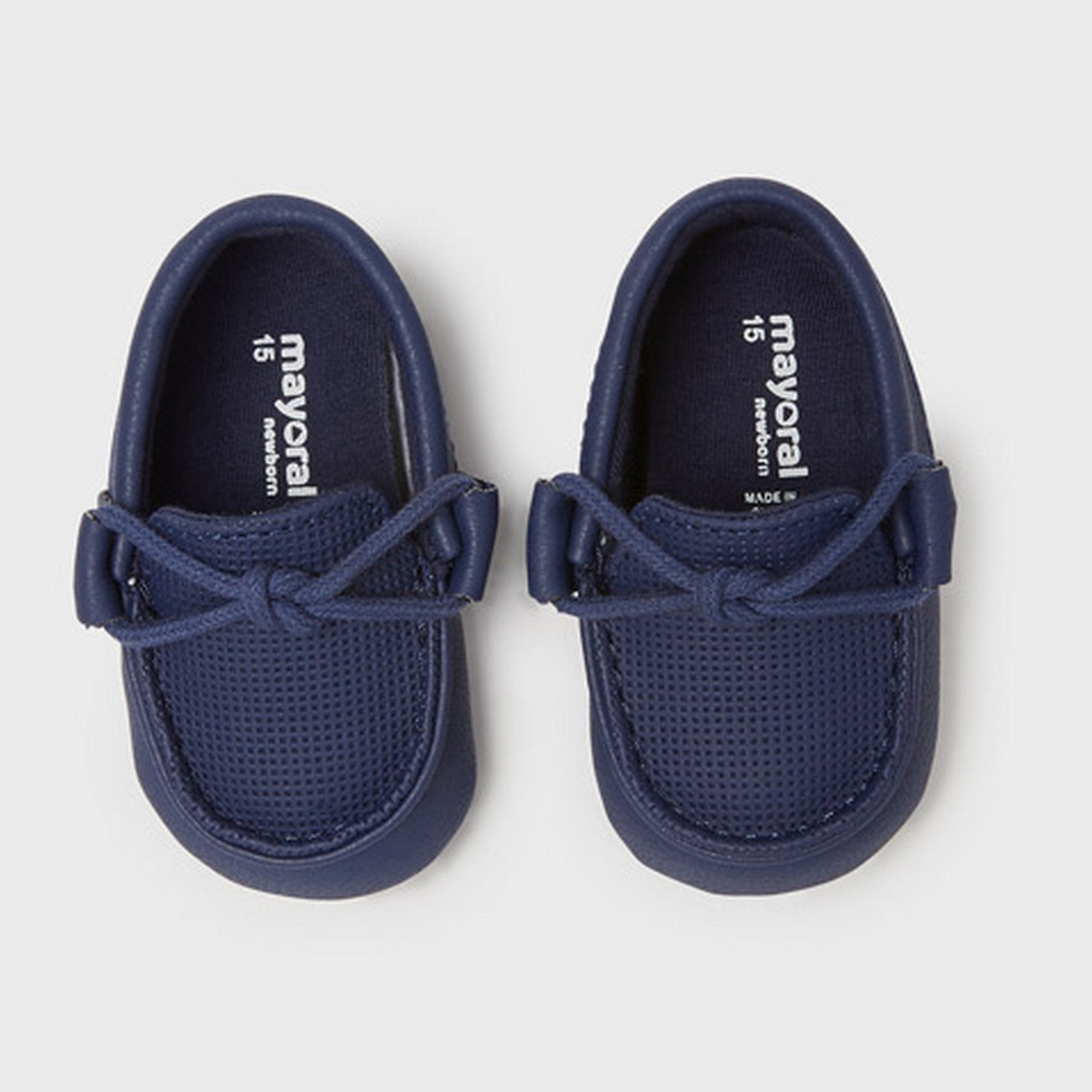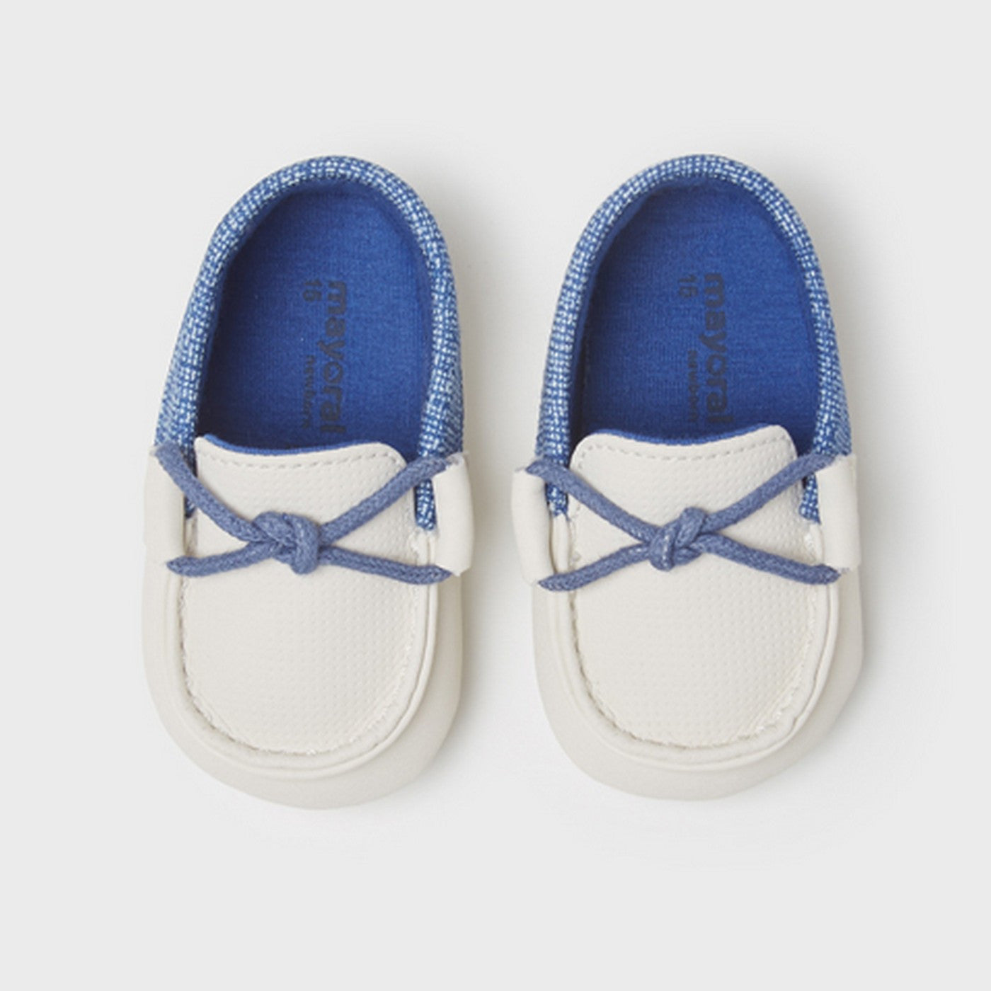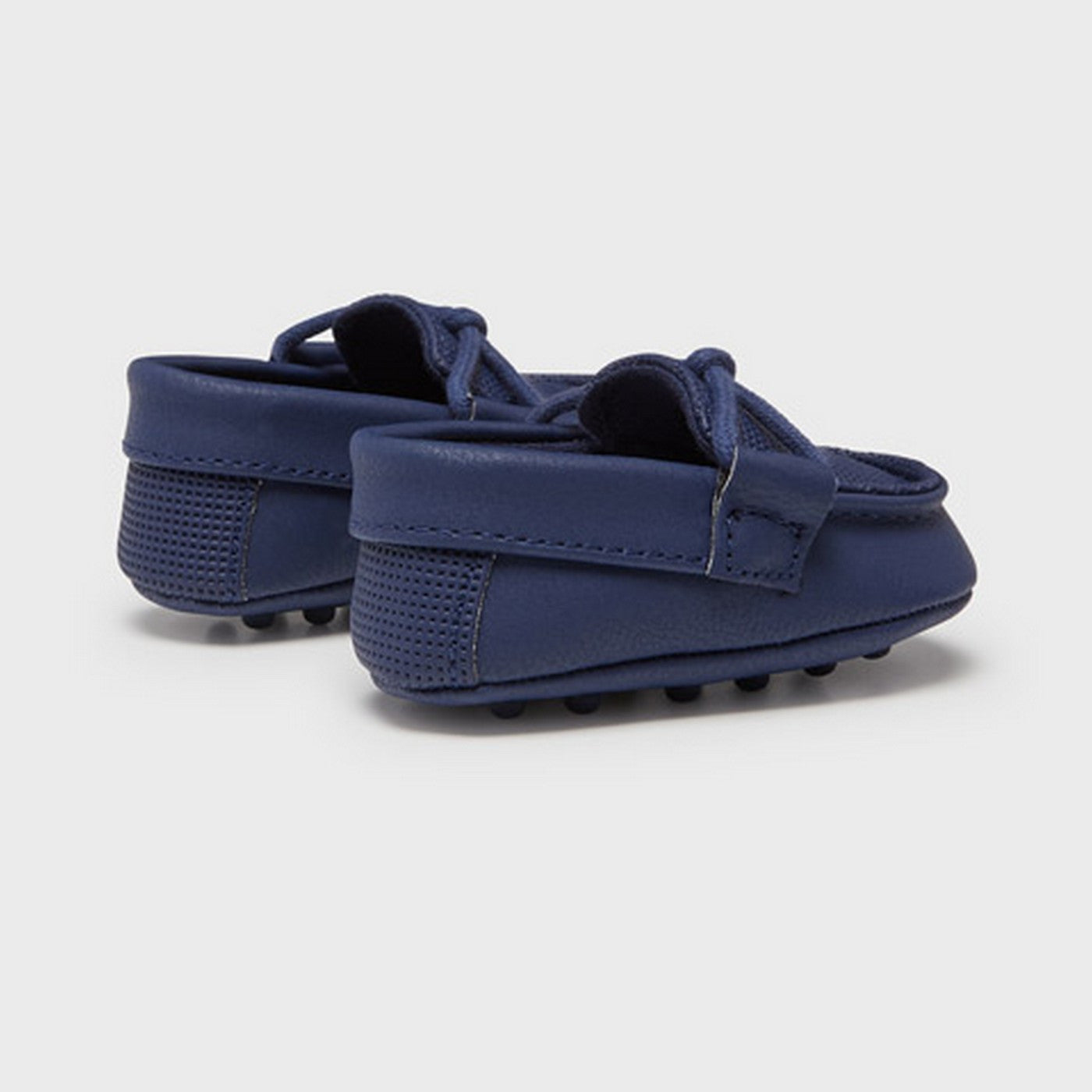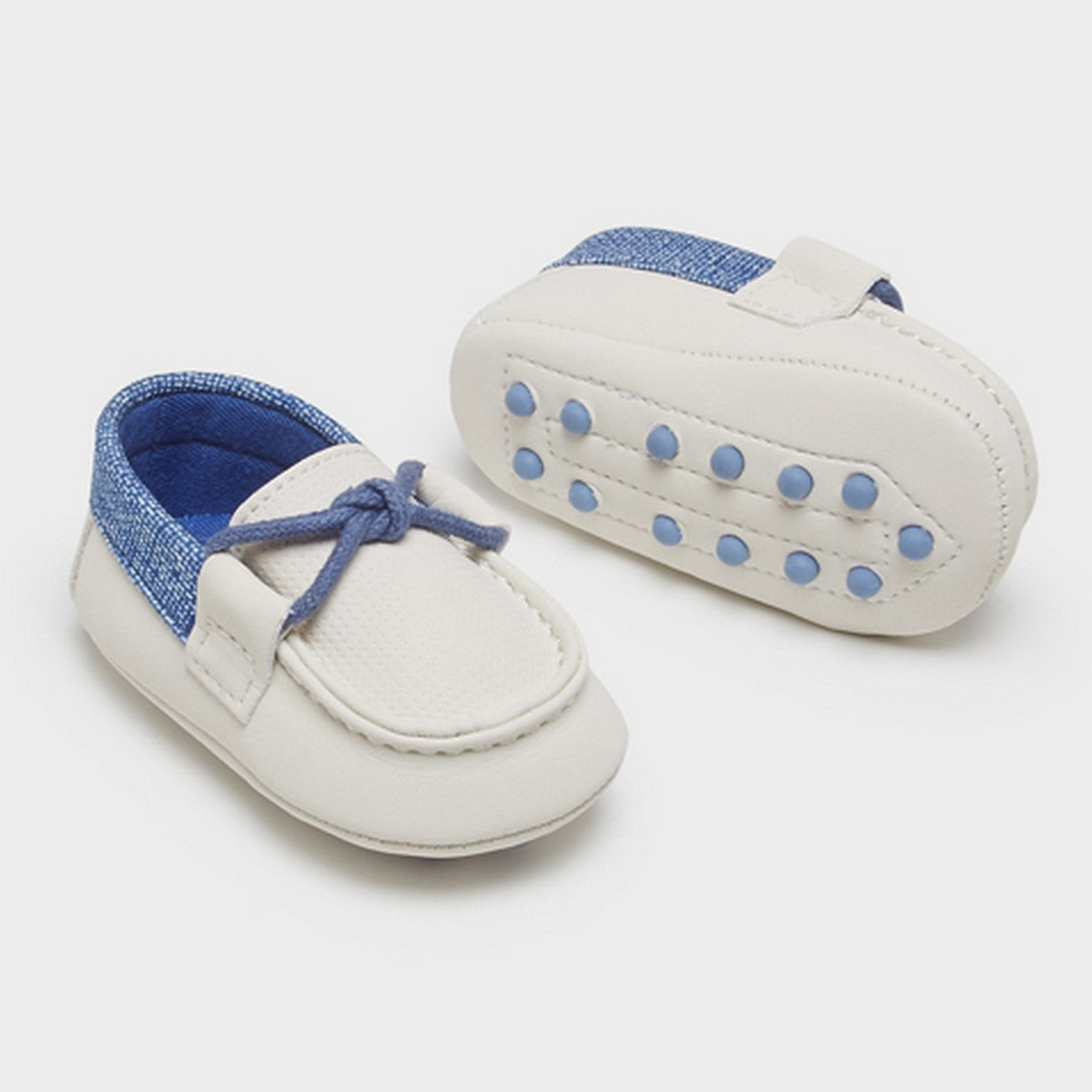 Mocassini culla in ecopelle con laccetto in corda sulla parte superiore e gommini sottostanti.