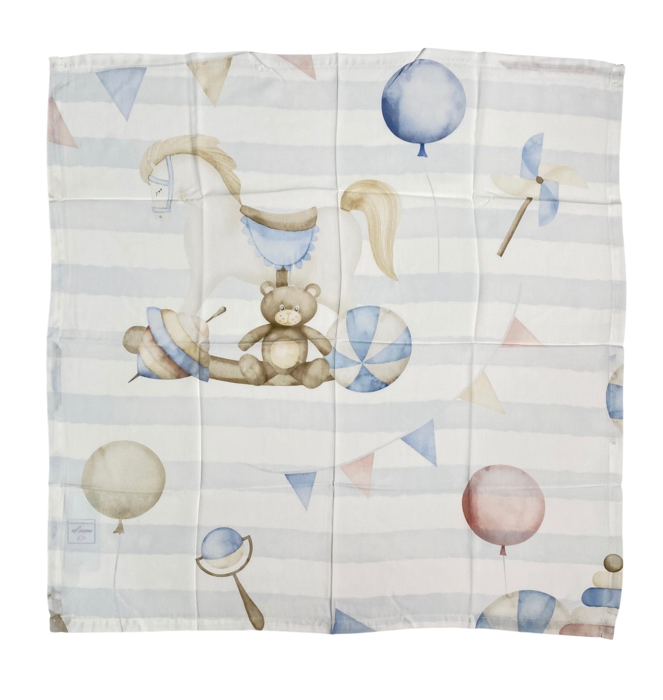 Realizzata in morbida mussola di bamboo, questa copertina è ideale per neonati, offrendo un comfort delicato sulla pelle sensibile dei più piccoli. La stampa del cavalluccio a dondolo aggiunge un tocco tenero e alla moda, perfetto per accompagnare i momenti di coccole e riposo. Traspirante e ipoallergenica, garantisce un ambiente sicuro e confortevole, rendendola un accessorio pratico e raffinato per ogni famiglia attenta al benessere del neonato.