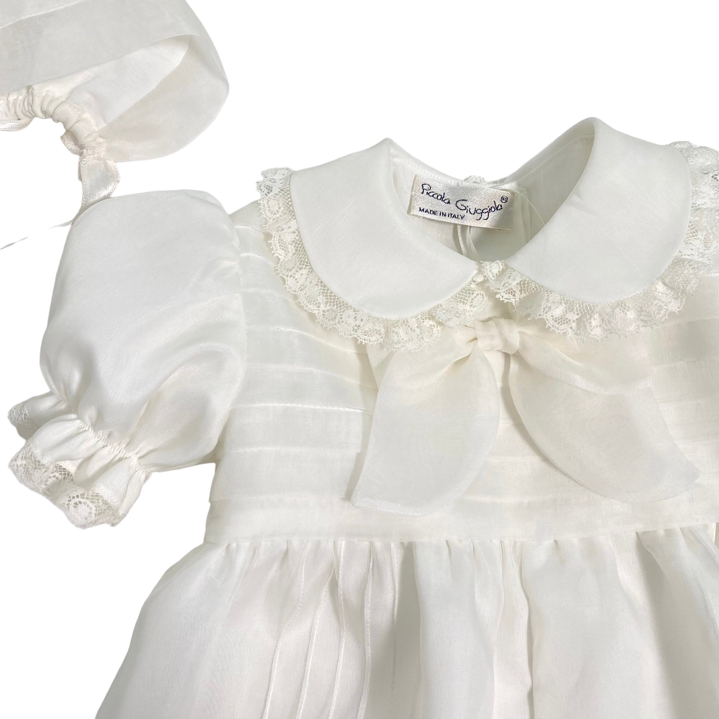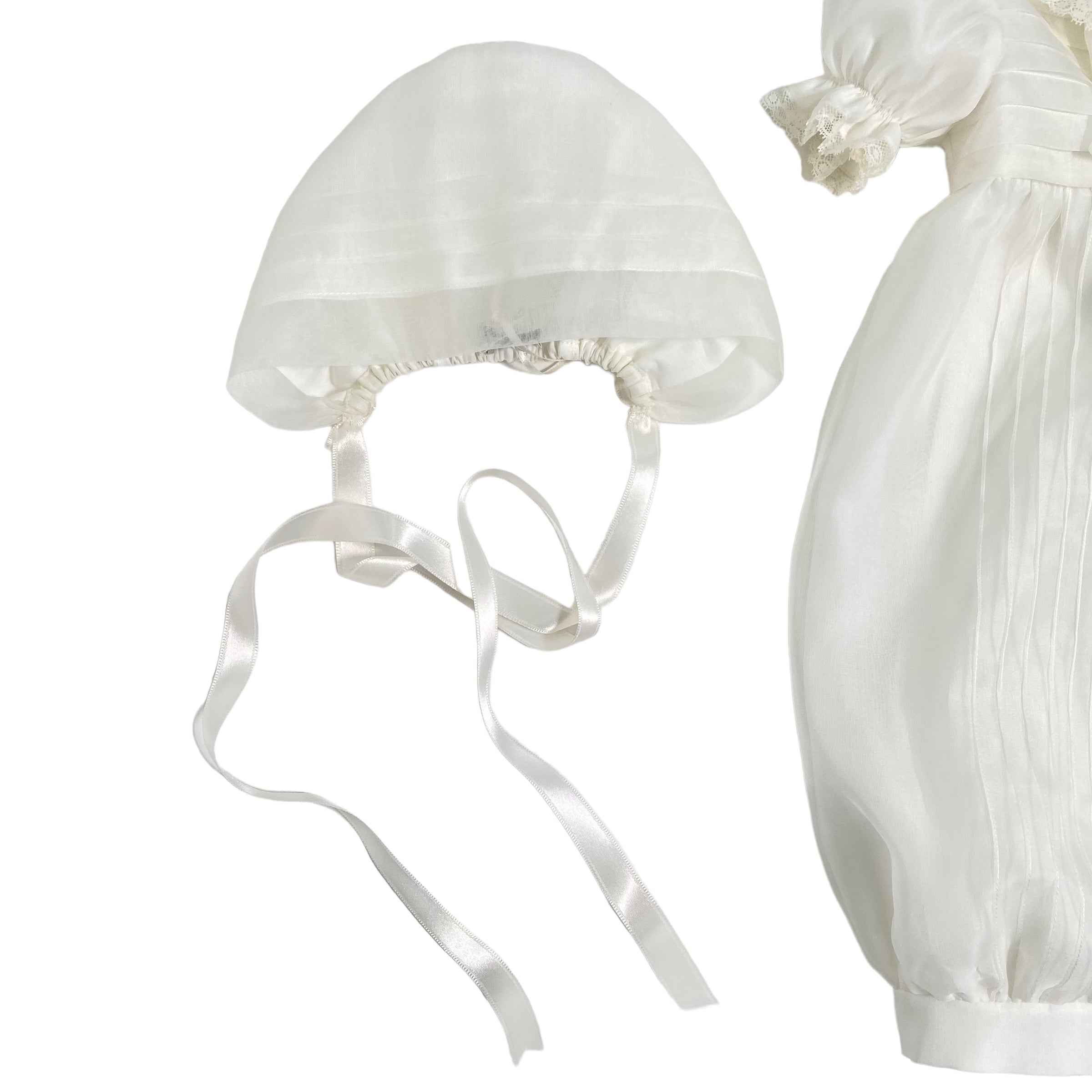 Cuffia in organdis di seta abbinata, con chiusura con laccetti in raso.